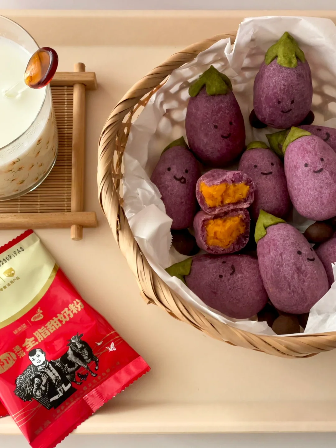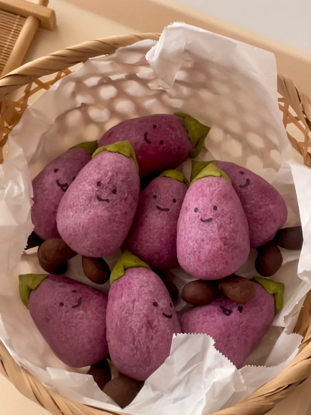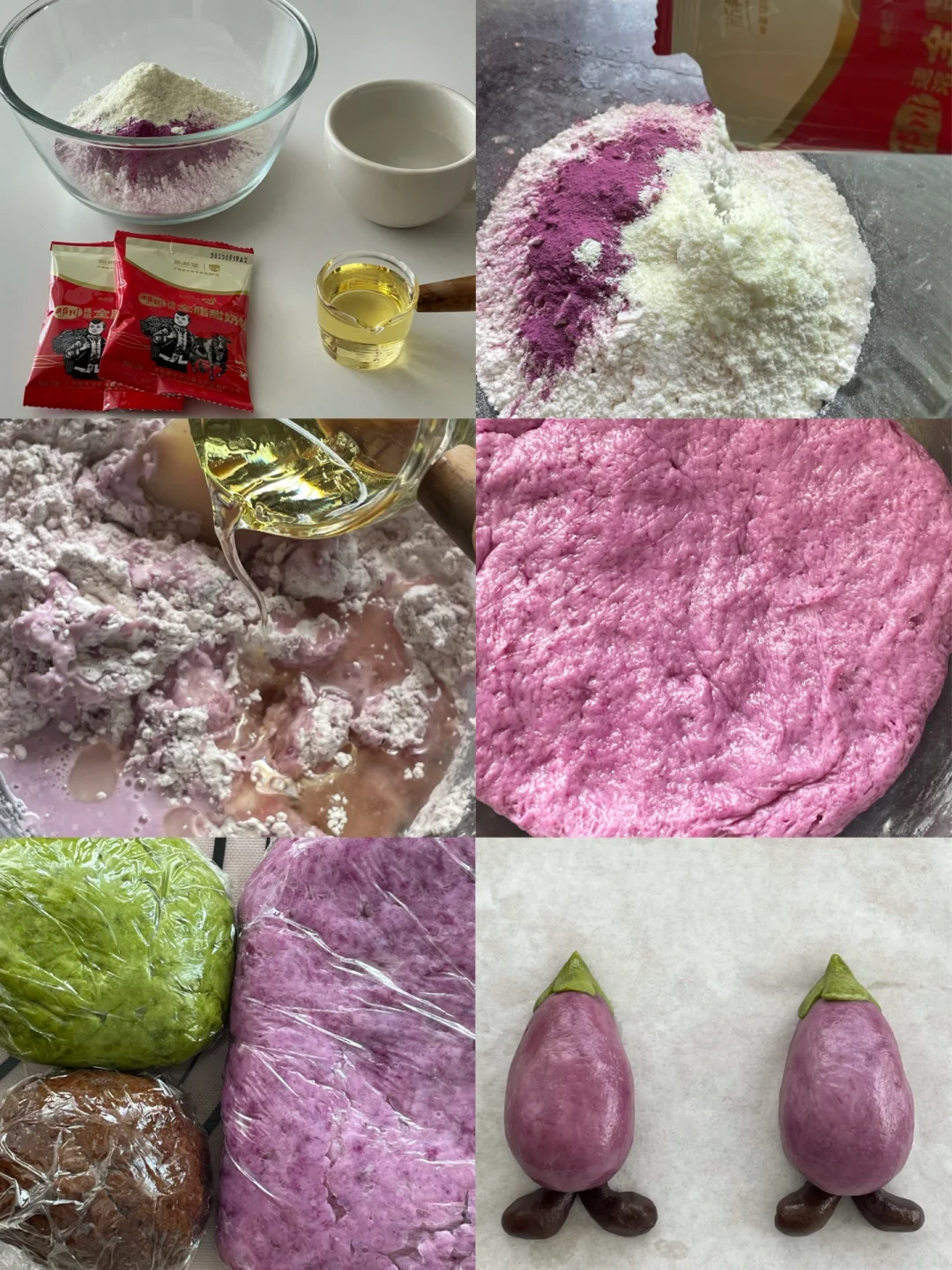 a茄子:低筋面粉160g、奶粉20g、细砂糖15g、泡打粉3g、温水80g、玉米油45g、紫薯粉适量