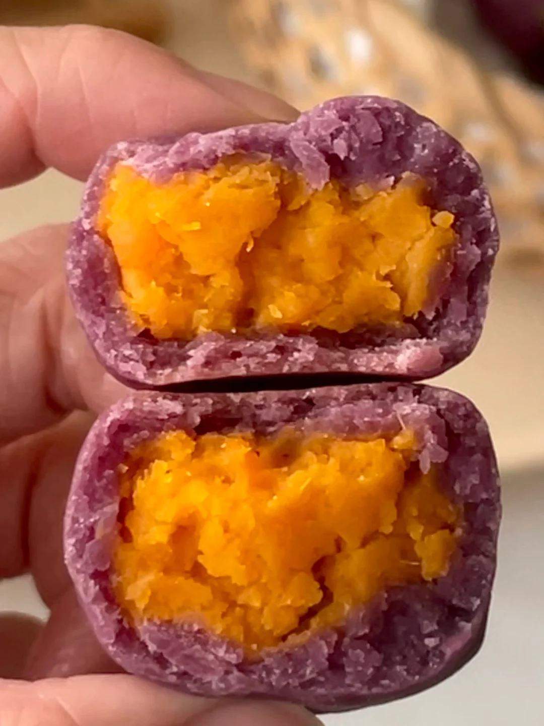 1️⃣红薯去皮切块蒸熟,蒸熟的红薯加入适量牛奶捣成泥