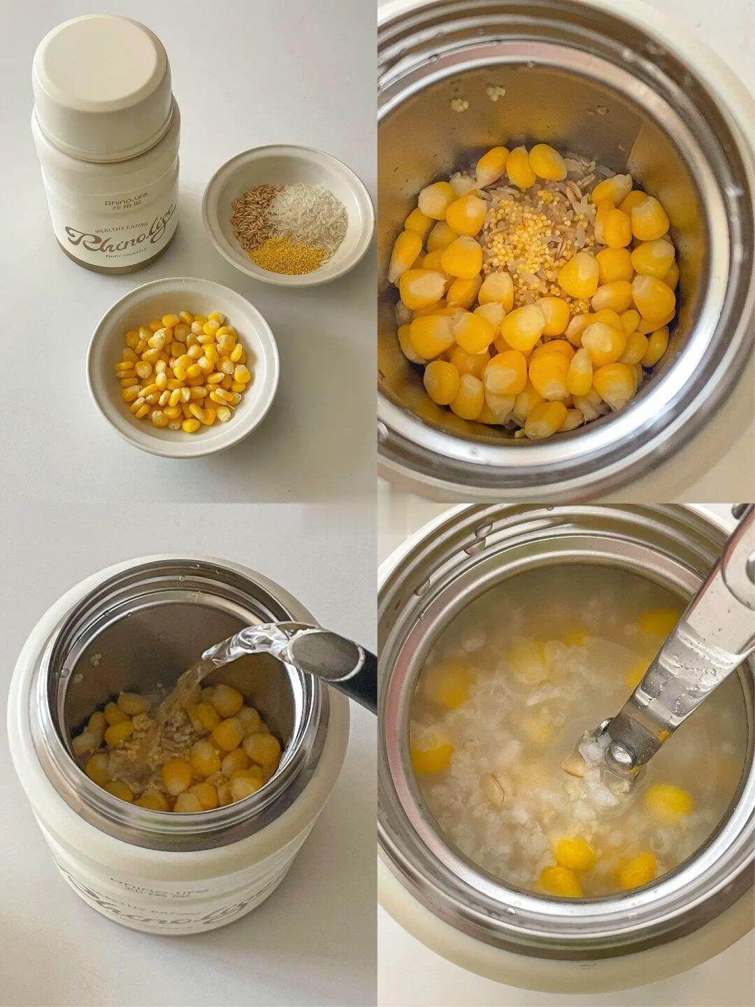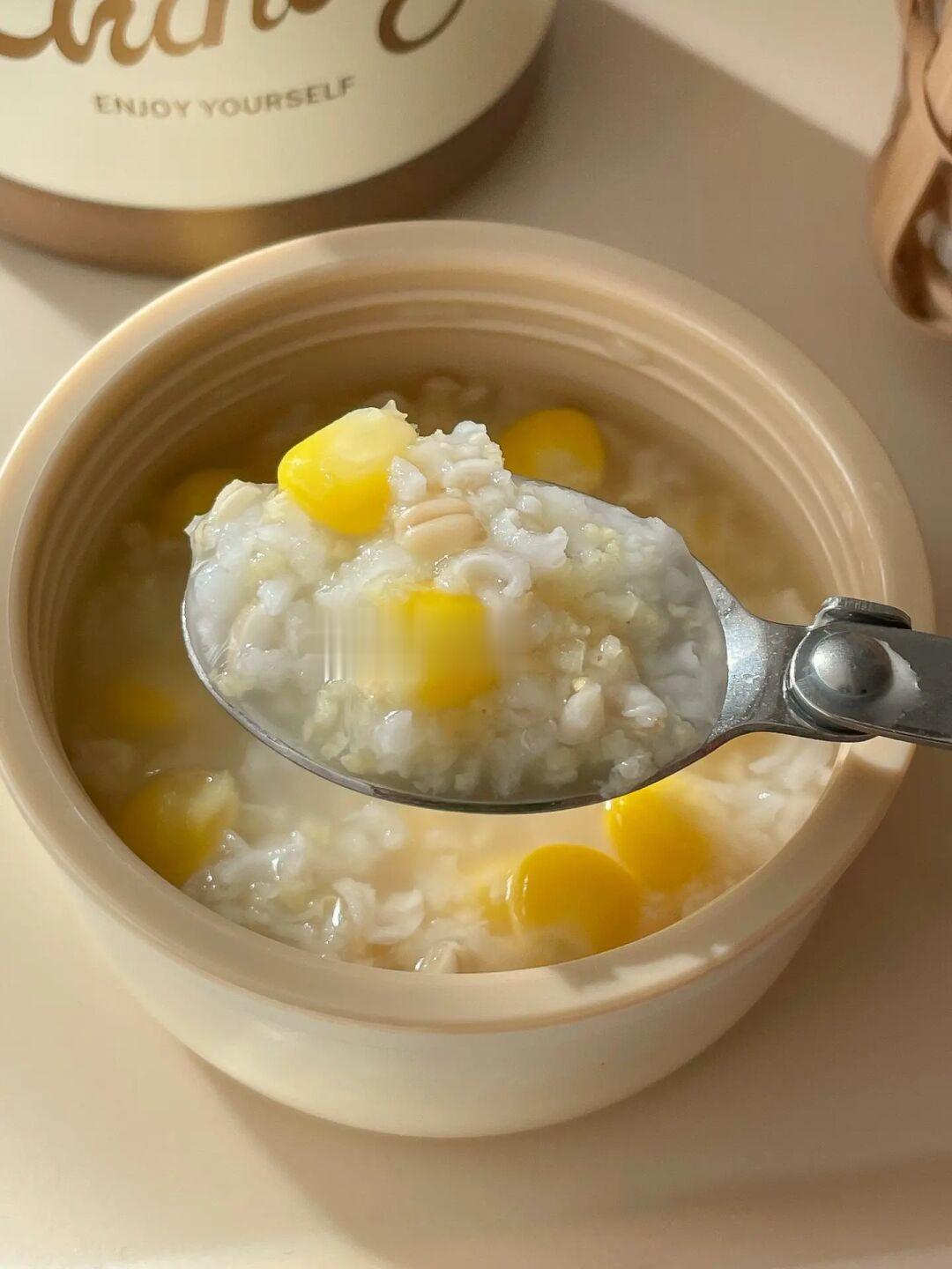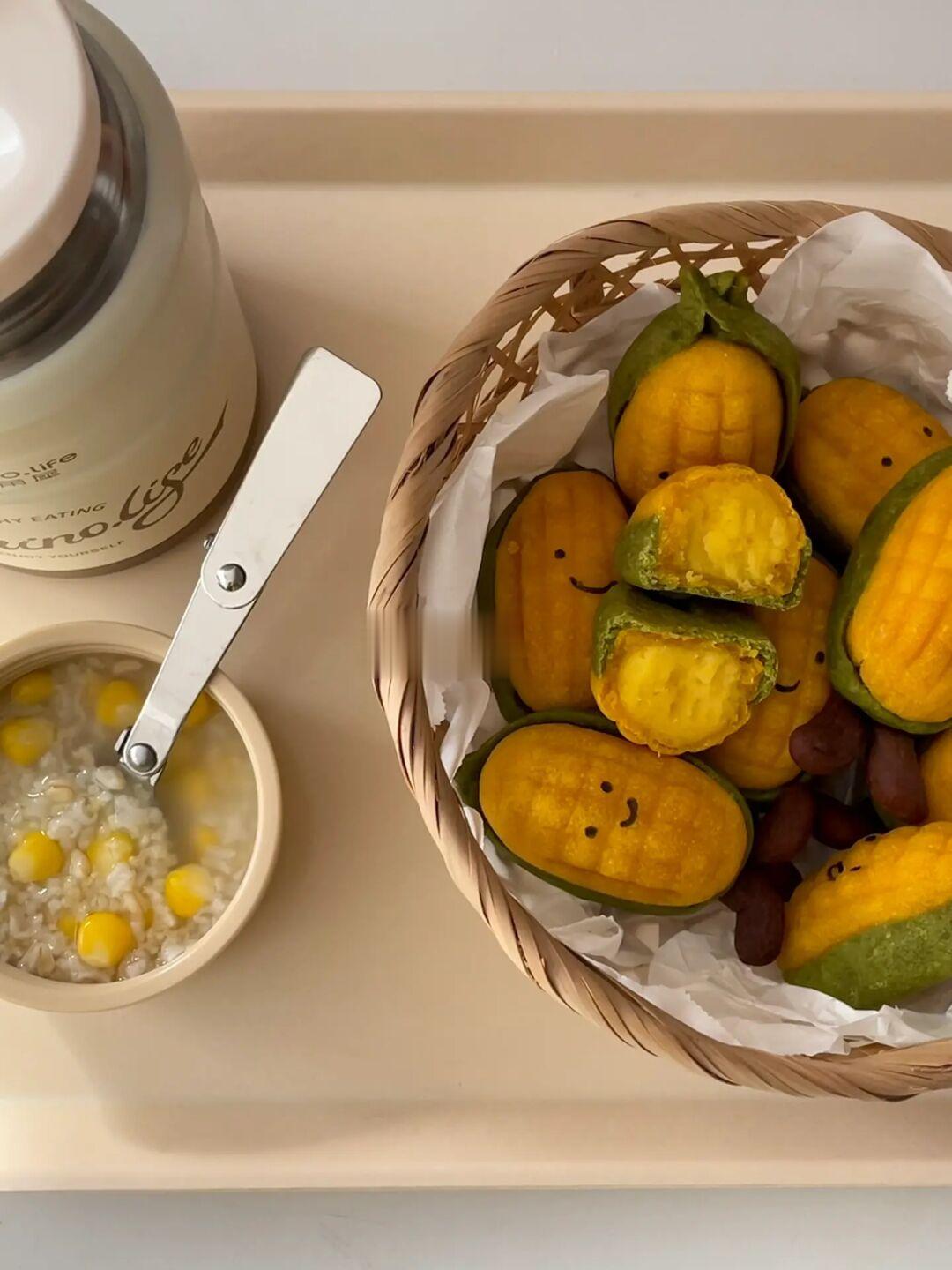 香甜的玉米熬成了奶香浓郁的奶黄玉米馅 搭配营养健康的玉米燕麦小米粥 秋天的早晨来上这样一份早餐 真的好惬意! - 奶黄玉米馅 材料:鸡蛋2个、煮熟的玉米粒170g、牛奶80g、中筋面粉30g、小麦淀粉25g、白砂糖40g、黄油20g 步骤: 1️⃣除黄油外其他材料放入破壁机中打成细腻的糊糊 2️⃣把打好的玉米糊过筛到不粘锅中,加入黄油,开小火用刮刀一直不停的翻炒 3️⃣翻炒到馅料不粘刮刀就可以了 - 饼皮 材料: a玉米和脚:低筋面粉170g、细砂糖15g、泡打粉3g、温水80g、玉米油45g、南瓜粉适量、可可粉适量 b玉米外壳:低筋面粉85g、细砂糖8g、泡打粉1.5g、温水40g、玉米油23、抹茶粉适量 步骤: 1️⃣把低筋面粉、细砂糖、泡打粉、南瓜粉混合均匀,再加入温水和玉米油,将面团揉匀(抹茶面团也是同样操作) 2️⃣南瓜面团分大概70g出来加入可可粉作为玉米脚 3️⃣揉好的面团包上保鲜膜放入冰箱静置松弛半个小时 4️⃣黄色面团均分成每份20g/个,绿色面团均分出13g/个,可可面团均分成3g/个,玉米奶黄馅20g/个 4️⃣将黄色面团揉圆压扁,包入玉米泥,用虎口收紧后捏成椭圆形状 5️⃣绿色面团揉圆压扁后半包着黄色面团,棕色面团做成脚 5️⃣烤箱预热后中层180度烘烤15分钟,出炉晾凉后用烘培笔画出表情就可以啦 - 玉米燕麦小米粥 材料:焯水的玉米粒、大米、燕麦仁、小米 焖烧杯:不用开火我就能做出香甜可口的玉米粥,独角犀这款焖烧杯内胆材料好,还贴心的配备了汤勺,杯子口径比较大好装也好清洗,真的有被他的细节给打动到✨ 步骤: 1⃣焖烧杯加入热水预热一下倒掉,然后加入以上材料 2️⃣倒入刚煮开的热水,盖上盖子 3️⃣焖5-7小时后就可以吃啦