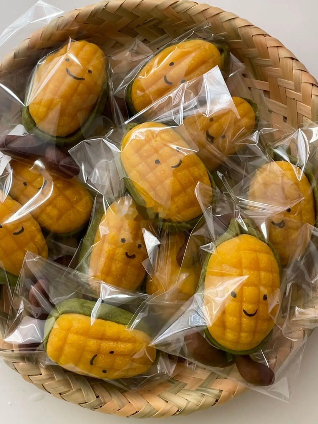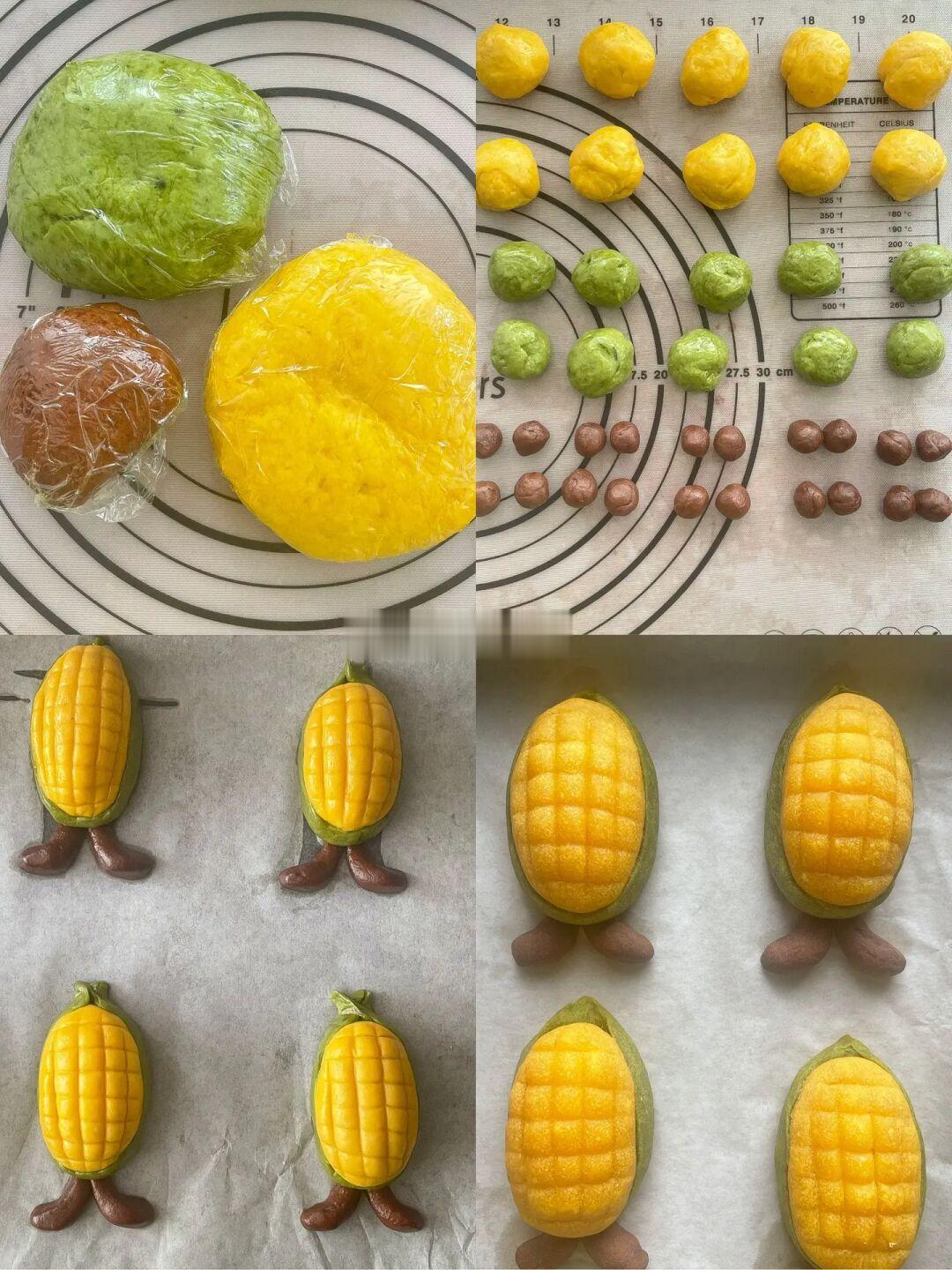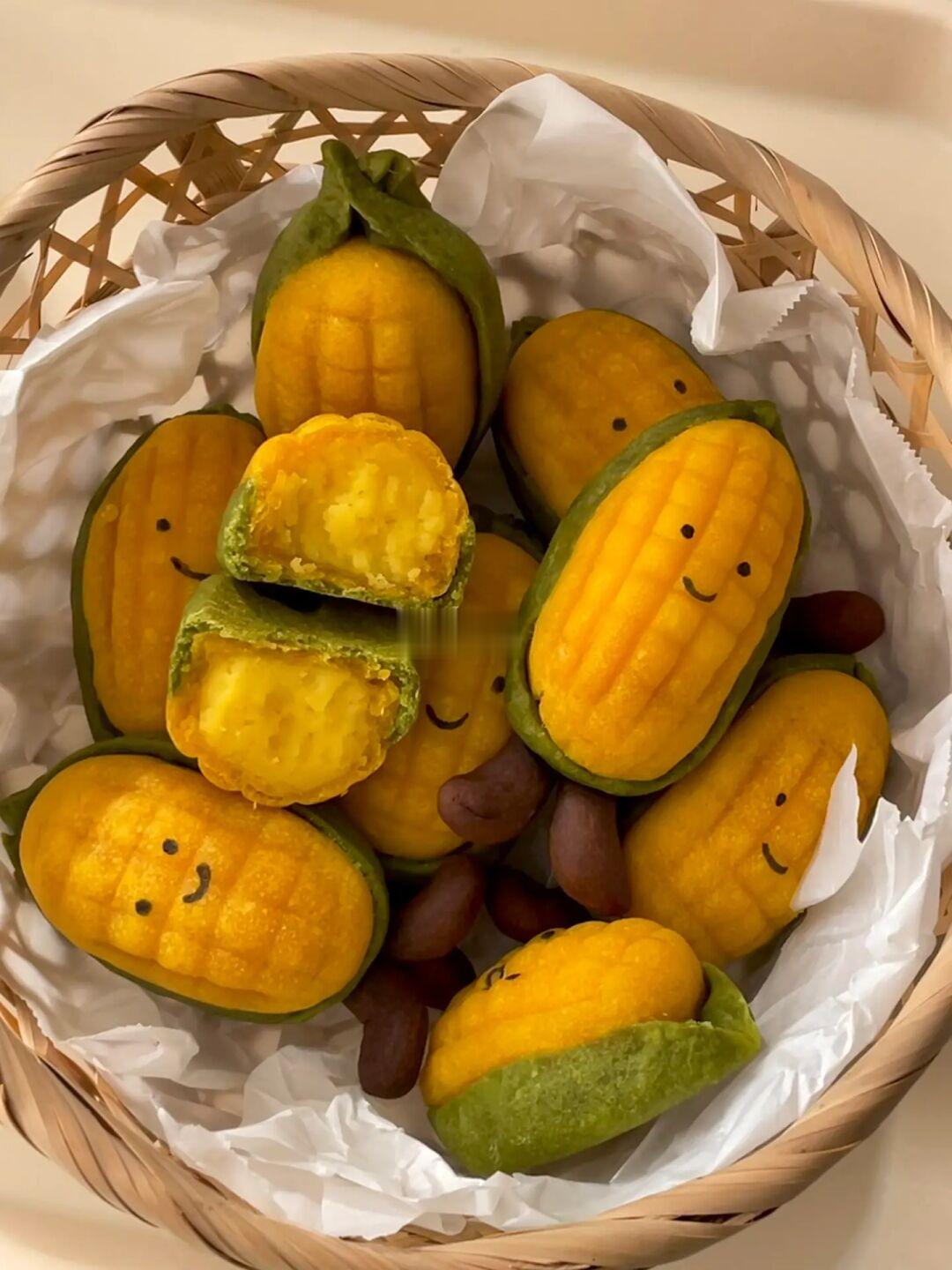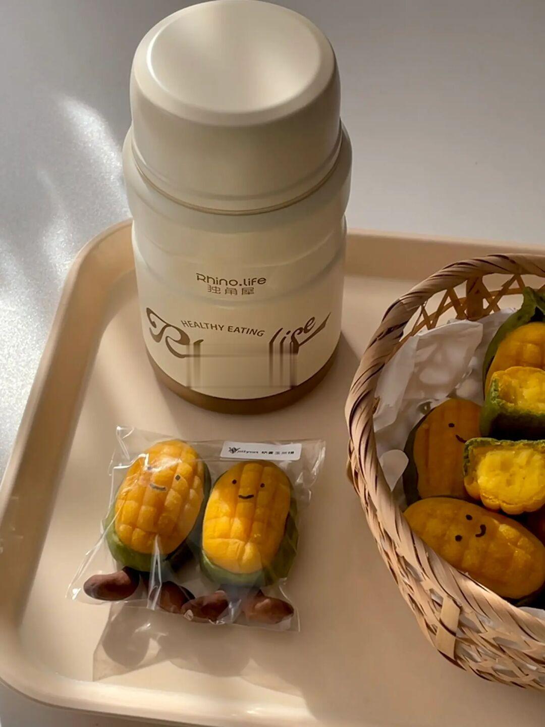 香甜的玉米熬成了奶香浓郁的奶黄玉米馅 搭配营养健康的玉米燕麦小米粥 秋天的早晨来上这样一份早餐 真的好惬意! - 奶黄玉米馅 材料:鸡蛋2个、煮熟的玉米粒170g、牛奶80g、中筋面粉30g、小麦淀粉25g、白砂糖40g、黄油20g 步骤: 1️⃣除黄油外其他材料放入破壁机中打成细腻的糊糊 2️⃣把打好的玉米糊过筛到不粘锅中,加入黄油,开小火用刮刀一直不停的翻炒 3️⃣翻炒到馅料不粘刮刀就可以了 - 饼皮 材料: a玉米和脚:低筋面粉170g、细砂糖15g、泡打粉3g、温水80g、玉米油45g、南瓜粉适量、可可粉适量 b玉米外壳:低筋面粉85g、细砂糖8g、泡打粉1.5g、温水40g、玉米油23、抹茶粉适量 步骤: 1️⃣把低筋面粉、细砂糖、泡打粉、南瓜粉混合均匀,再加入温水和玉米油,将面团揉匀(抹茶面团也是同样操作) 2️⃣南瓜面团分大概70g出来加入可可粉作为玉米脚 3️⃣揉好的面团包上保鲜膜放入冰箱静置松弛半个小时 4️⃣黄色面团均分成每份20g/个,绿色面团均分出13g/个,可可面团均分成3g/个,玉米奶黄馅20g/个 4️⃣将黄色面团揉圆压扁,包入玉米泥,用虎口收紧后捏成椭圆形状 5️⃣绿色面团揉圆压扁后半包着黄色面团,棕色面团做成脚 5️⃣烤箱预热后中层180度烘烤15分钟,出炉晾凉后用烘培笔画出表情就可以啦 - 玉米燕麦小米粥 材料:焯水的玉米粒、大米、燕麦仁、小米 焖烧杯:不用开火我就能做出香甜可口的玉米粥,独角犀这款焖烧杯内胆材料好,还贴心的配备了汤勺,杯子口径比较大好装也好清洗,真的有被他的细节给打动到✨ 步骤: 1⃣焖烧杯加入热水预热一下倒掉,然后加入以上材料 2️⃣倒入刚煮开的热水,盖上盖子 3️⃣焖5-7小时后就可以吃啦