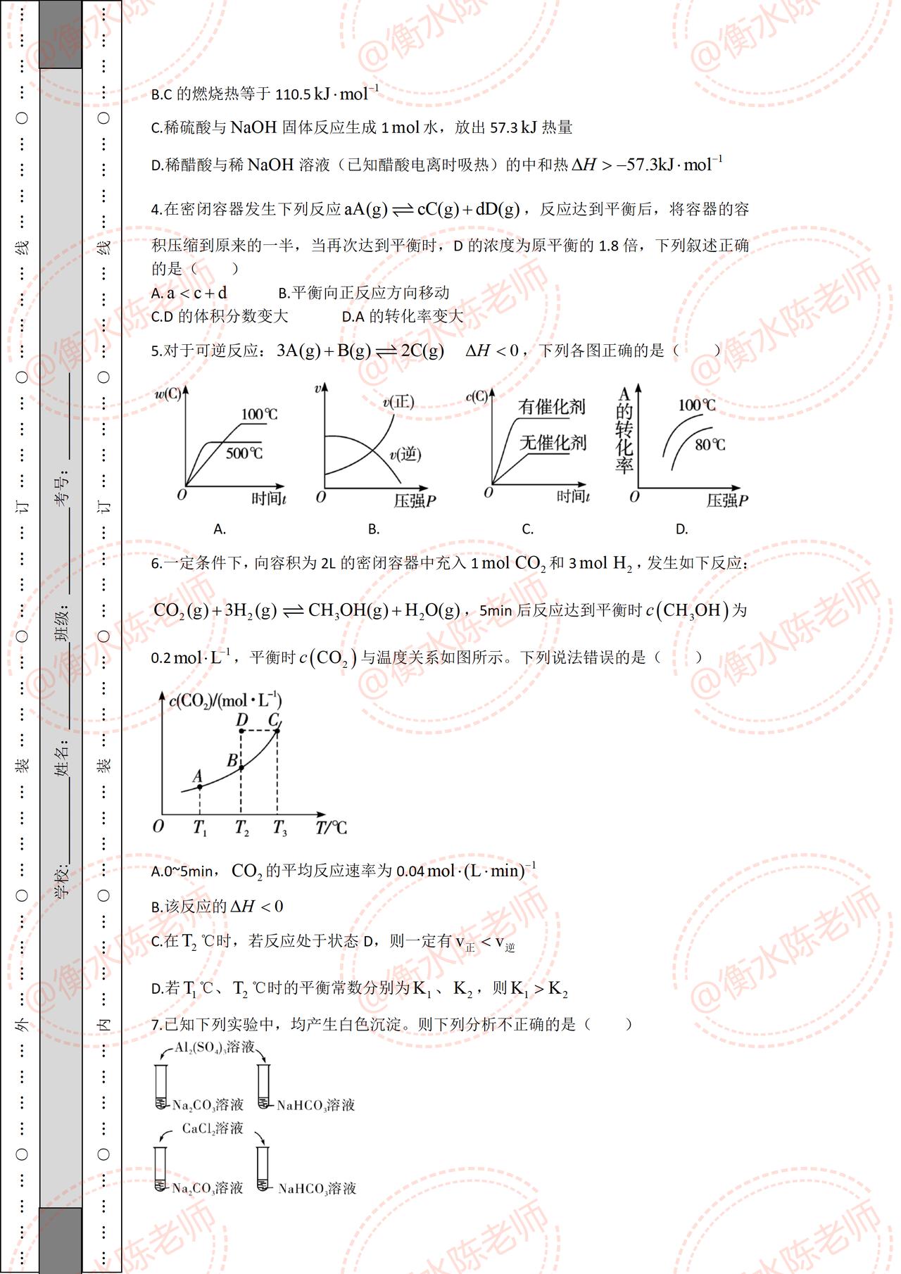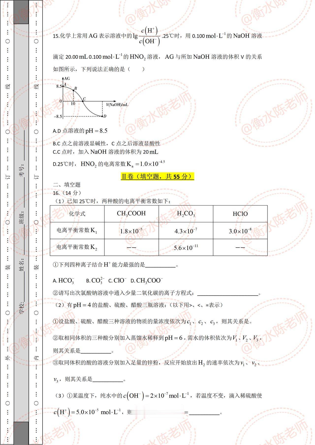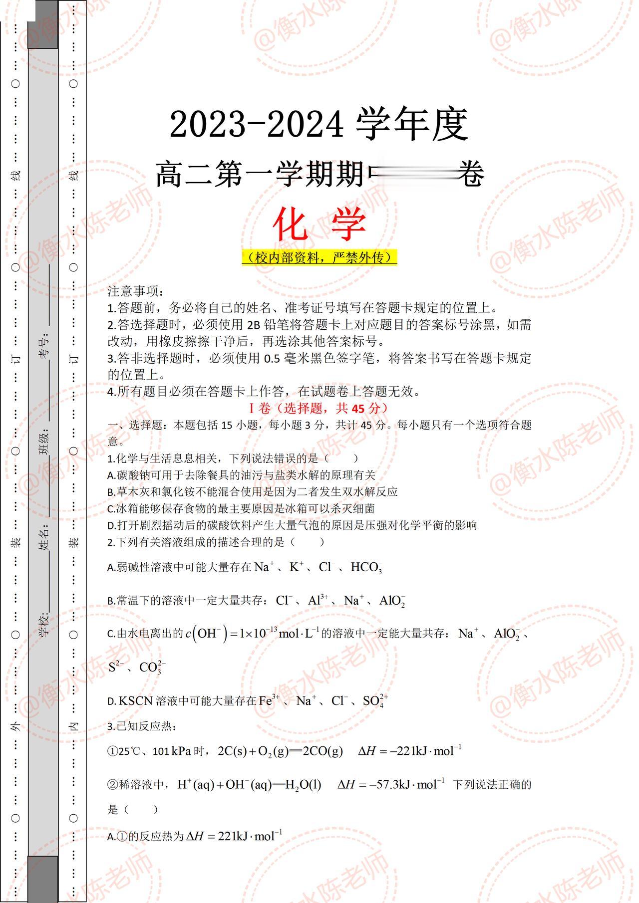 高二上学期化学期中考试,试卷必出重点考题,根据不同省份,版本编写的重点考题,月考成绩没考好的同学,提前做一遍自己城市对应的期中试卷,让你多考分数哦,想要获取的考生,记得和我沟通一下哦。
