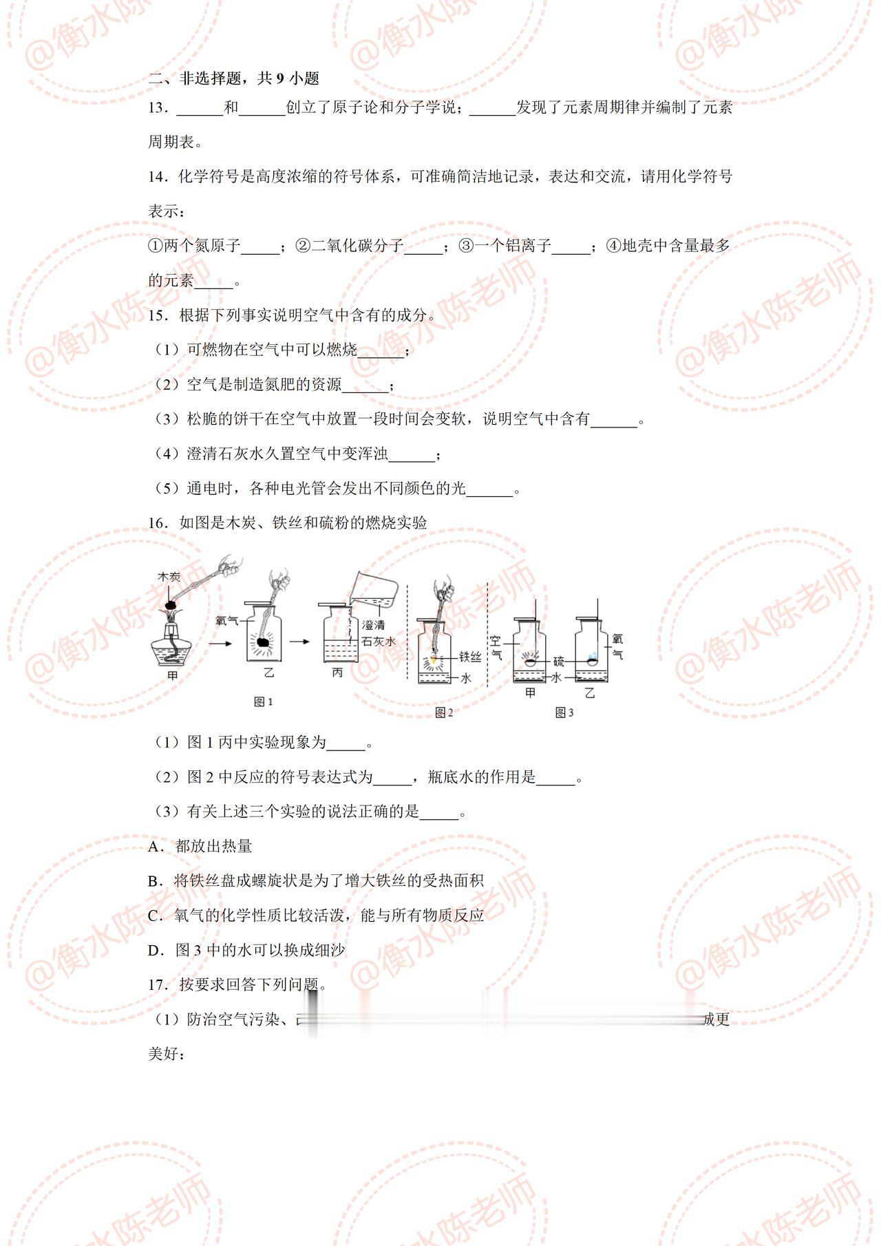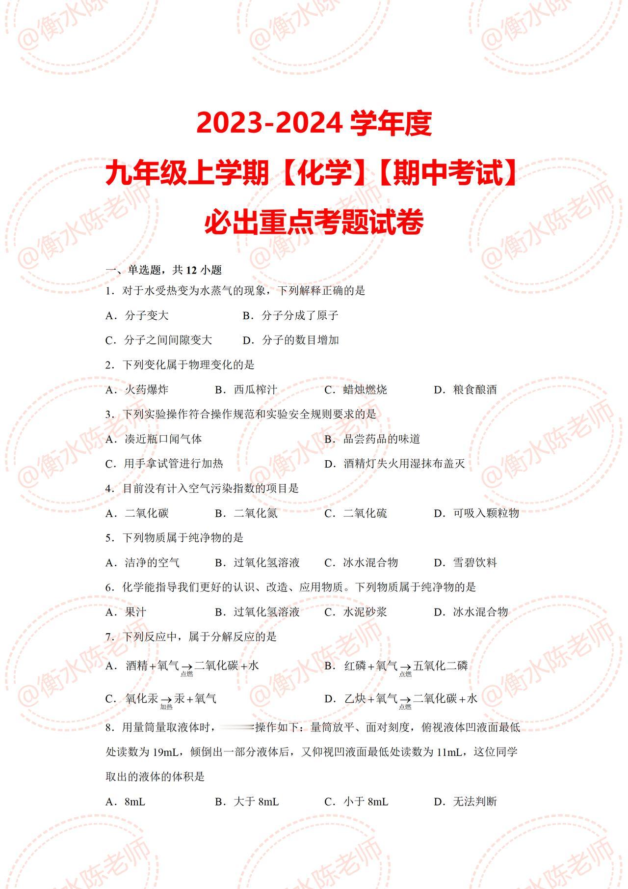 九年级上学期化学,期中试卷必出重点考题,月考成绩不太理想的考生,考试之前记得做一遍,自己城市对应期中试卷,考试让你少走弯路,多考分数,想要获取的考生,记得和我沟通哦。