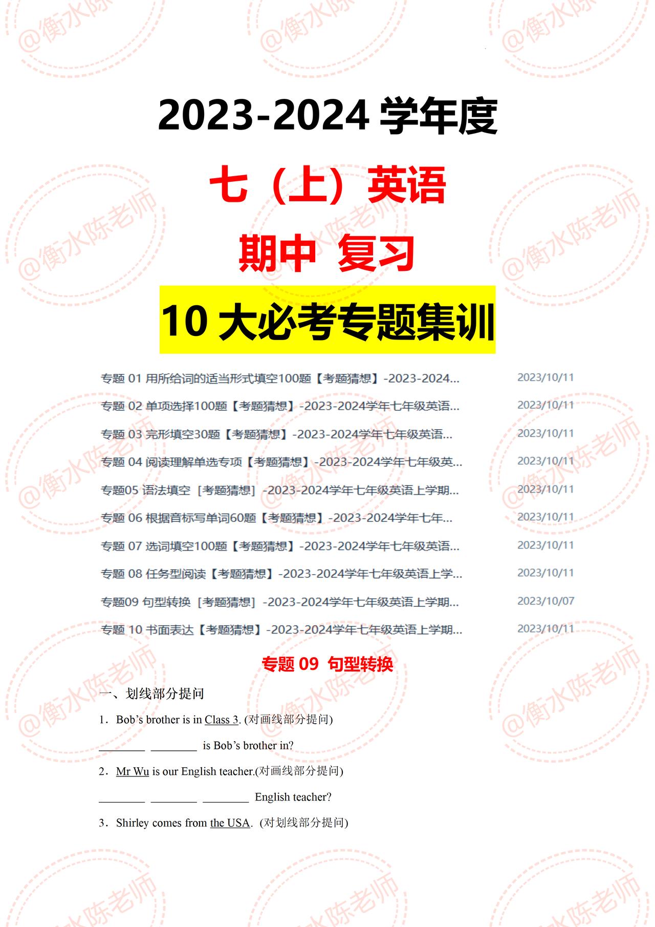 七年级上学期英语,期中考试复习,10大必考专题集训,英语成绩比较差的,吃透这10个类型,你的英语成绩不下95哦,英语专题集训,是根据不同的城市、不同的版本编写的,想要获取自己城市专题复习的考生,记得和我沟通联系即可哦。