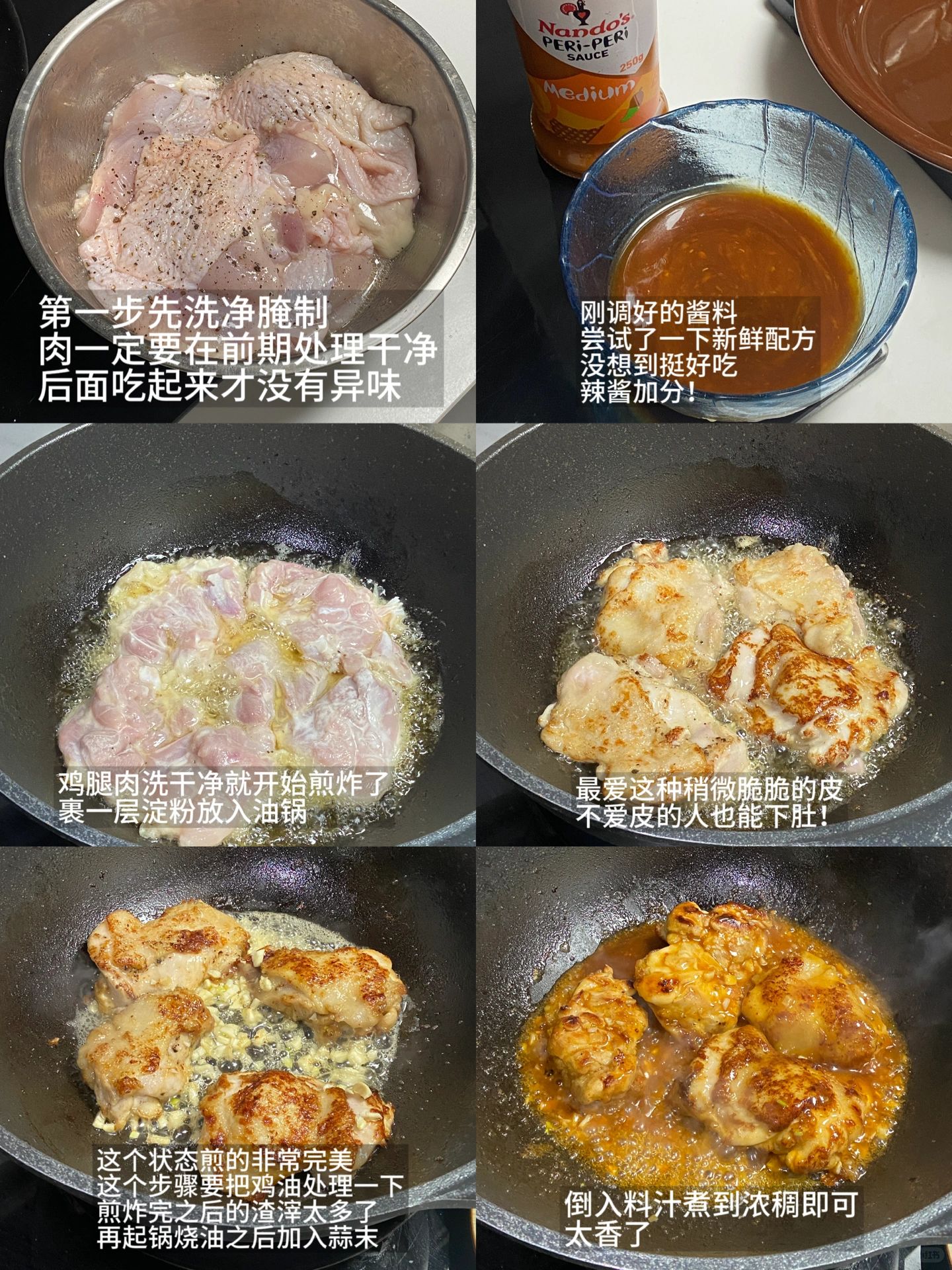 3)鸡腿肉裹一圈淀粉,然后锅中放油开始煎炸,皮更脆一点我喜欢,这个就煎炸至两面金黄即可,有的皮焦一点更好吃,煎炸好后捞出备用