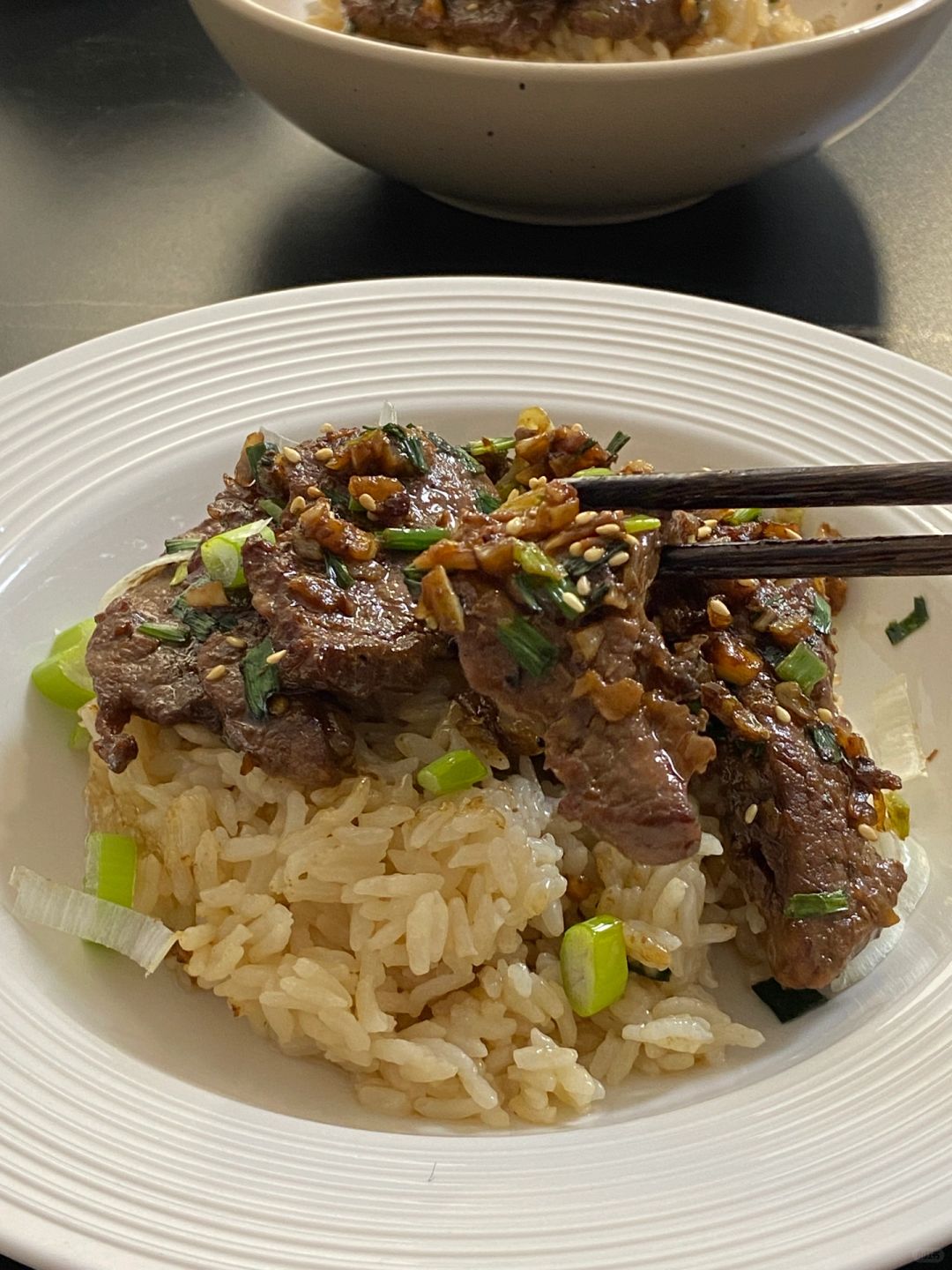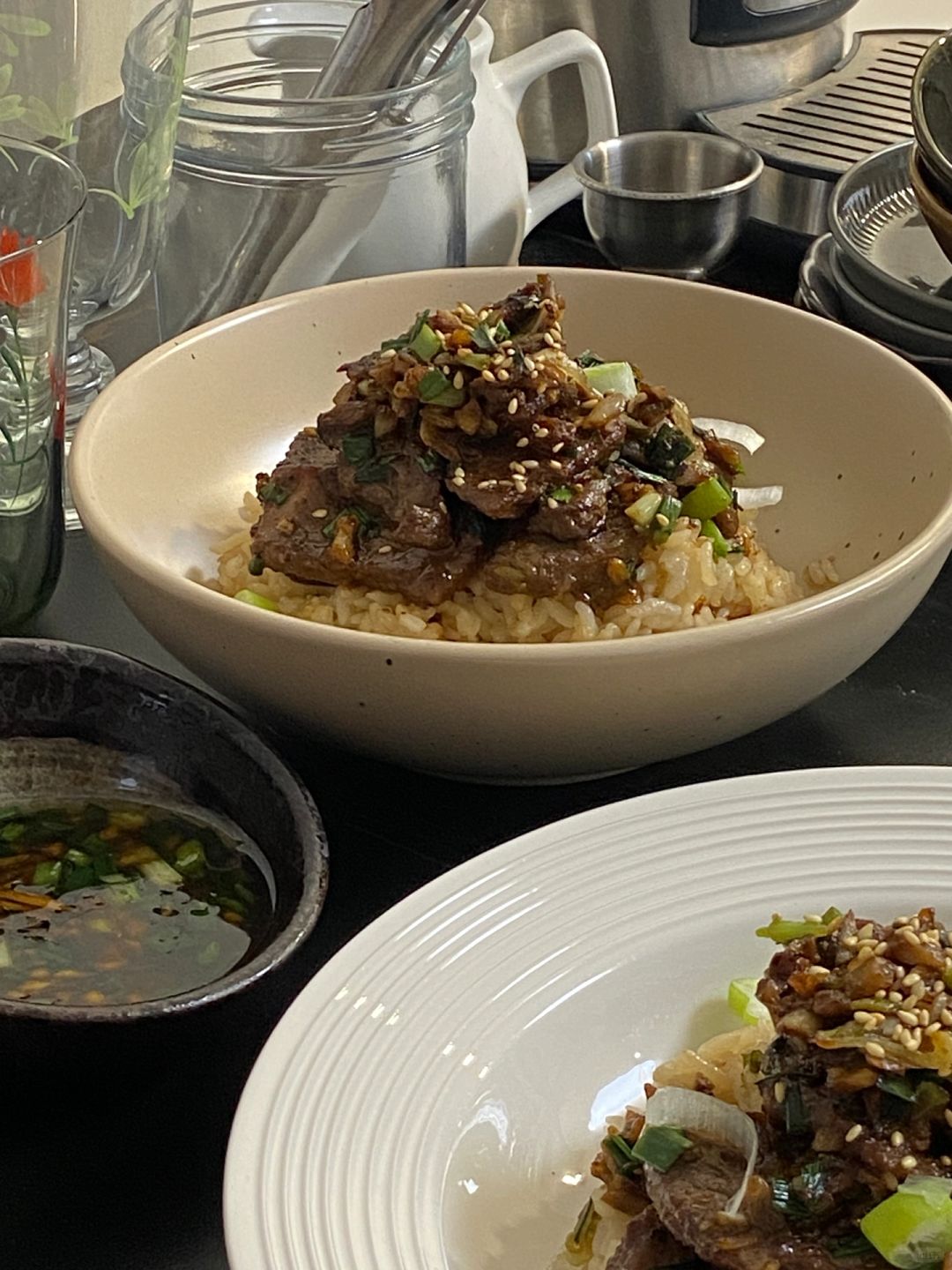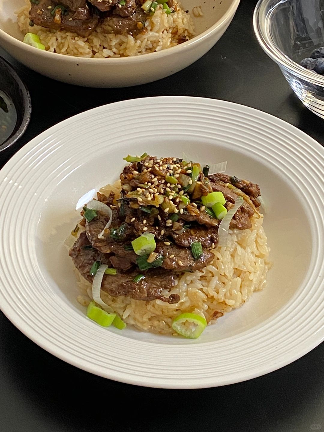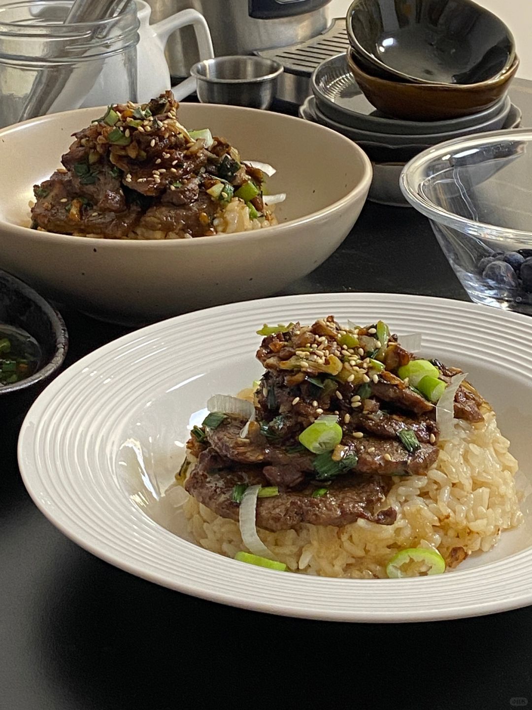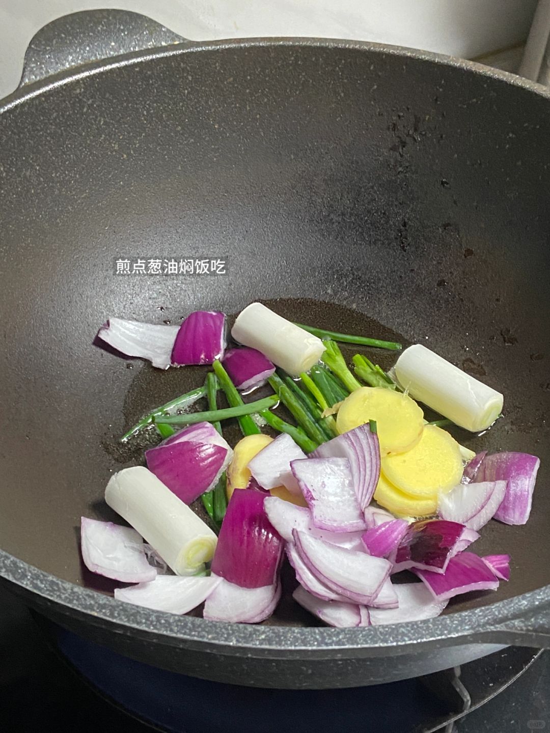 3)米饭是按照上次做的葱油鸡饭米饭步骤,因为不太喜欢吃白米饭,所以一般做这些我都会再制一下米饭,步骤就是煎完葱、姜、洋葱加水加生抽,用这个水来煮饭,比酱油饭多点步骤,更像是酱油葱饭