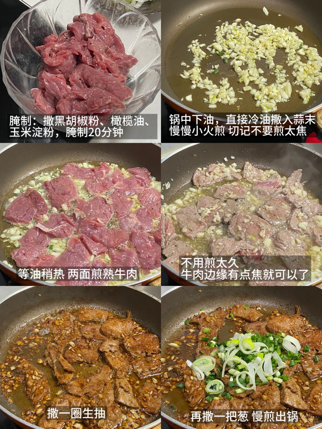 3)锅中下油,直接冷油撒入蒜末,这样的话不会直接把蒜煎黑苦涩,等油稍热后加入牛肉片