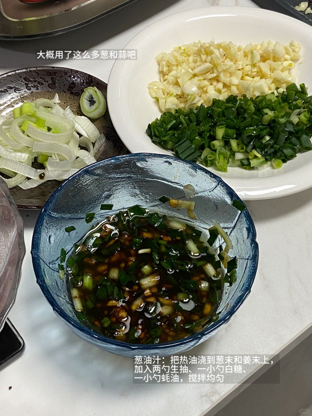2)旁边小碗装的是葱油汁:把热油浇到葱末和姜末上,加入两勺生抽、一小勺白糖、一小勺蚝油,搅拌均匀