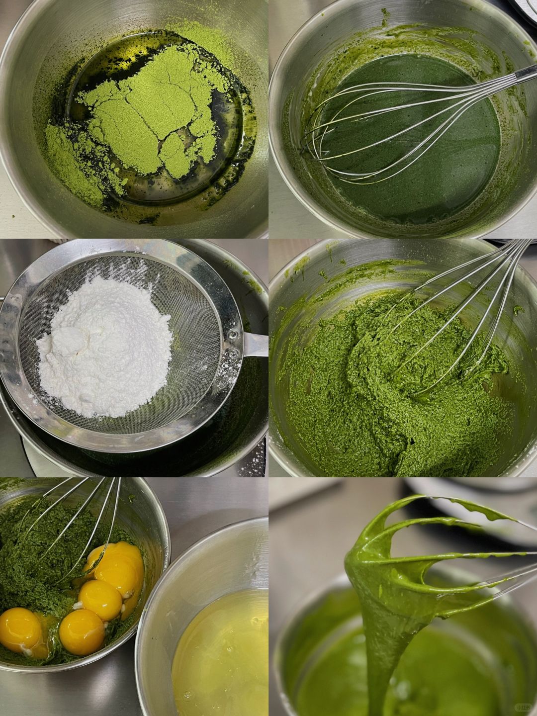 4⃣️把蛋白先挖三分之一和抹茶糊混合均匀