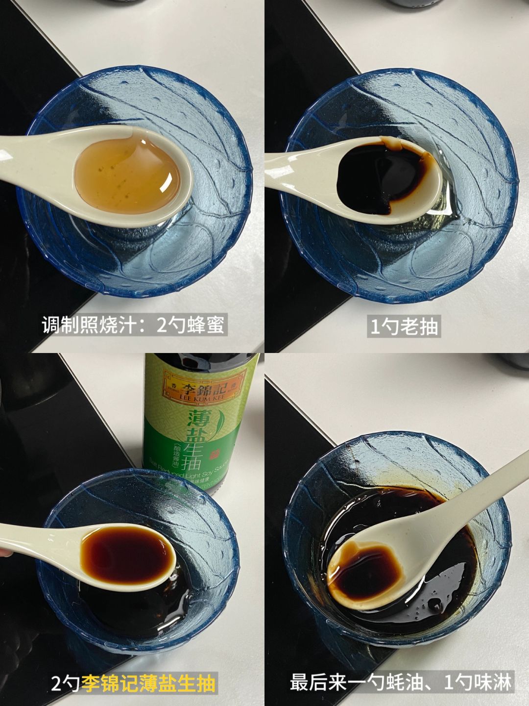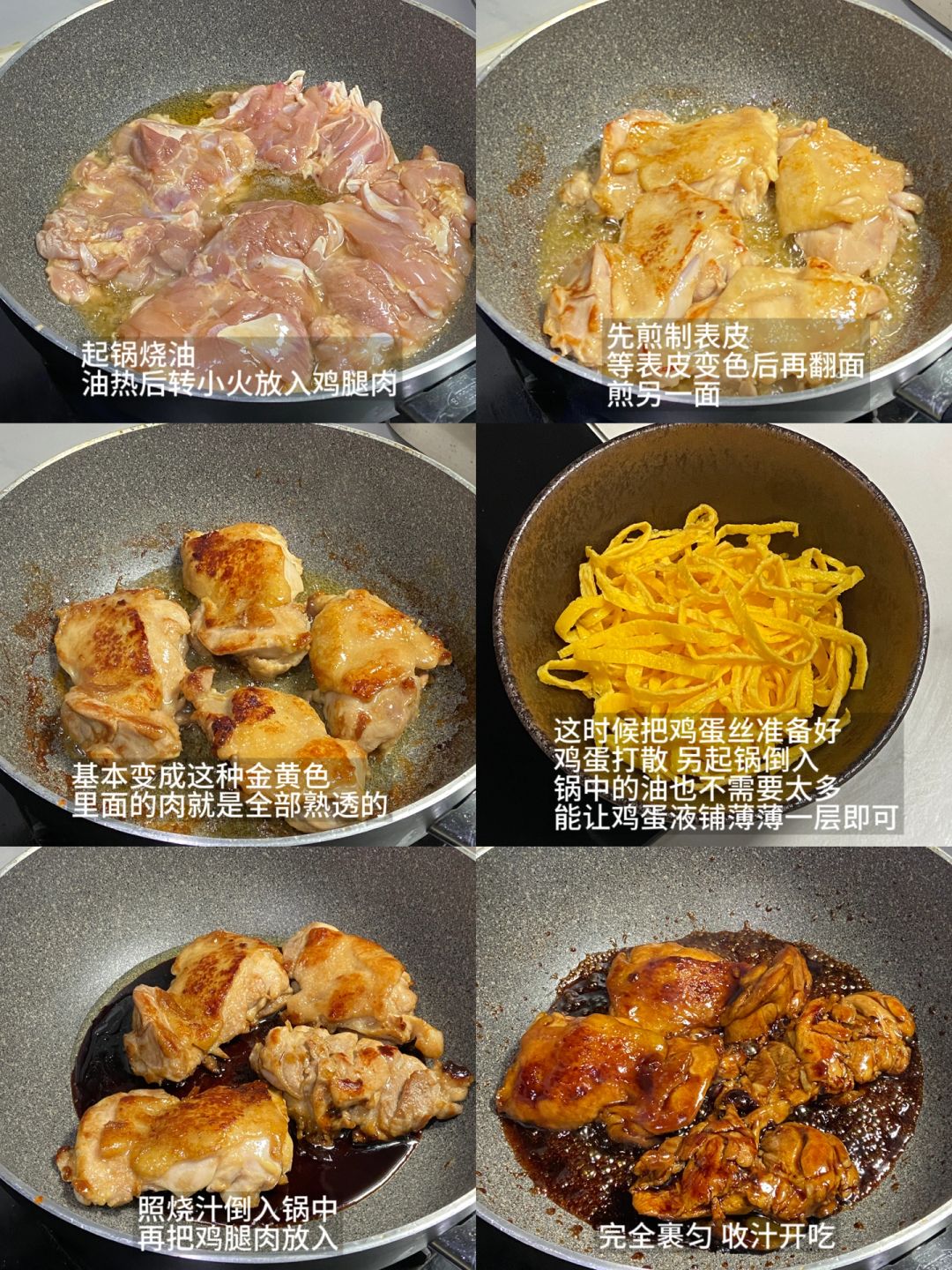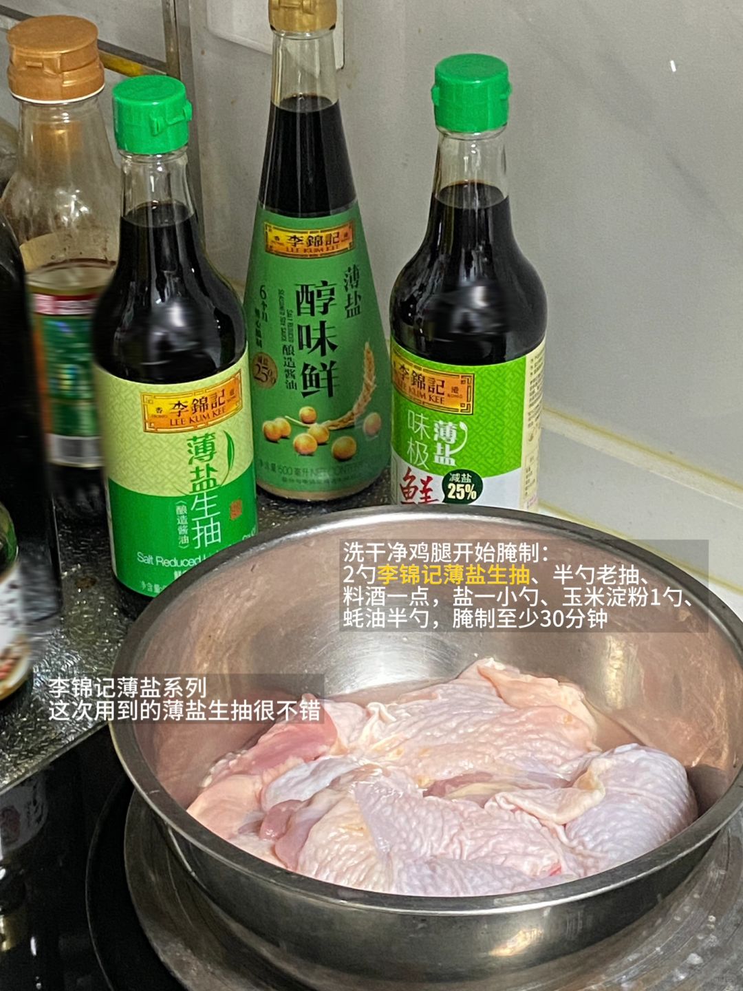 今日份的盖饭来了!简单又健康的照烧鸡腿饭菜谱! 食材: 鸡全腿2个|鸡蛋|照烧汁 准备工作: 1)调制照烧汁:2勺李锦记薄盐生抽、1勺老抽、2勺蜂蜜、1勺蚝油、1勺味淋 2)洗干净鸡腿开始腌制:2勺李锦记薄盐生抽、半勺老抽、料酒一点,盐一小勺、玉米淀粉1勺、蚝油半勺,腌制至少30分钟 制作: 1)锅中下油,油热后转小火,加入腌制好的鸡腿肉,开始煎炸至金黄色捞出 2)另起锅烧一点点油,倒入调好的照烧汁再把鸡腿放入,裹匀后切块 3)准备鸡蛋丝:鸡蛋打散,只需加一点盐,另起小锅,浅浅盖住锅底即可,小火直到鸡蛋皮表面熟透 tips: 1)关于老抽和生抽的比例,老抽通常加的比较少,但是如果需要上色调味,可以适当增加老抽的量,老抽是偏甜口调色重,生抽是偏咸口调味重,可参考之前做过的蜂蜜脆皮鸡腿饭 2)这次主打一个健康!自从了解到高盐饮食可能对肾脏造成负担后,基本上每次做饭都会格外控制盐的用量,李锦记这个品牌是我家最常用的,这一次的薄盐系列很符合我的口味,里面这款薄盐生抽选用非碘盐,减盐30%,不光减少了盐分,味道还更鲜美了,而且精选非转基因黄豆酿制,吃起来健康安心