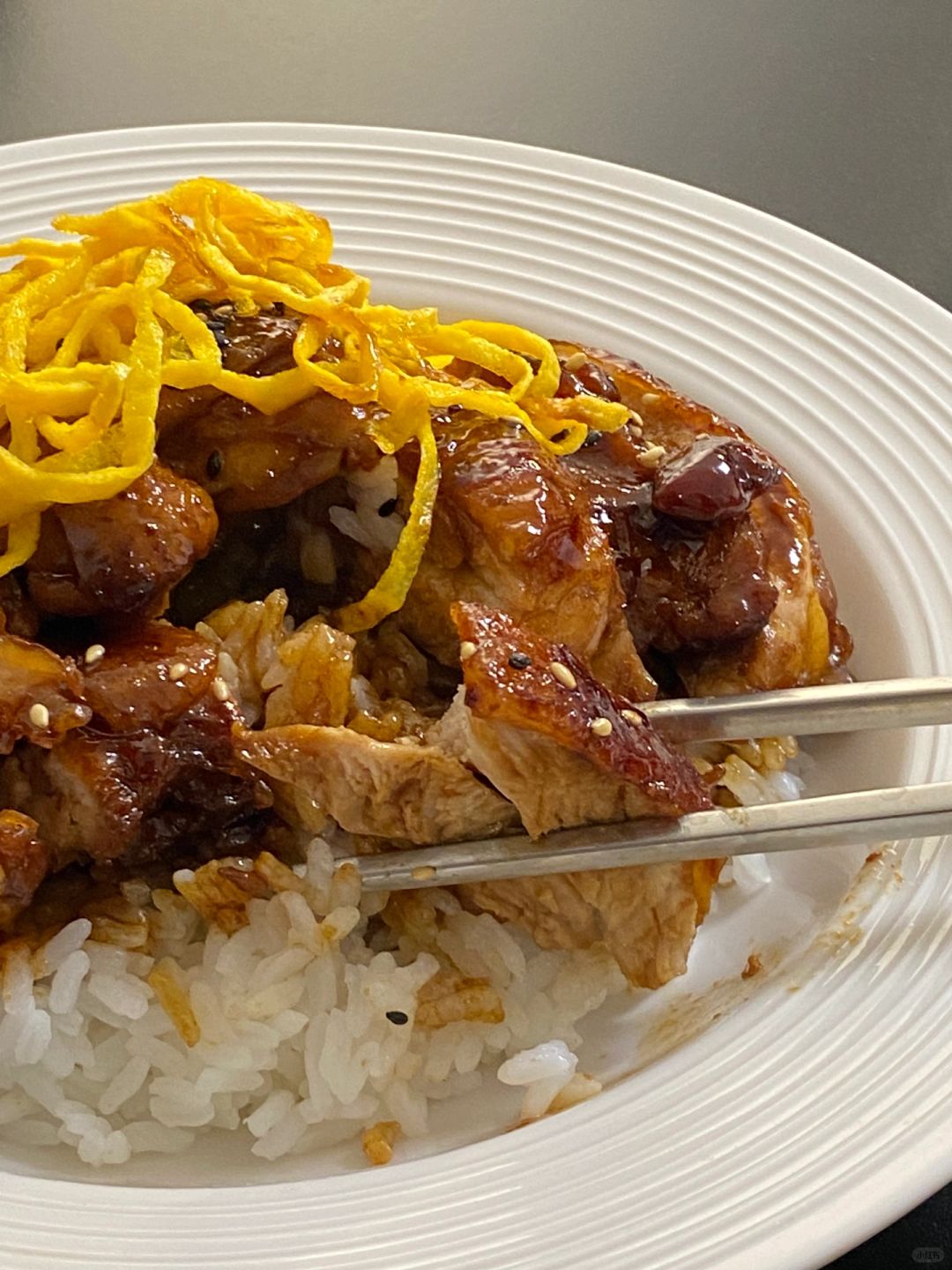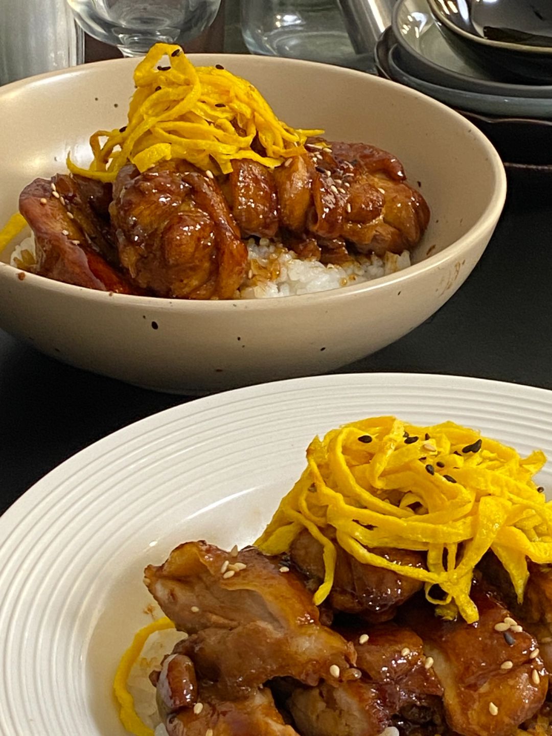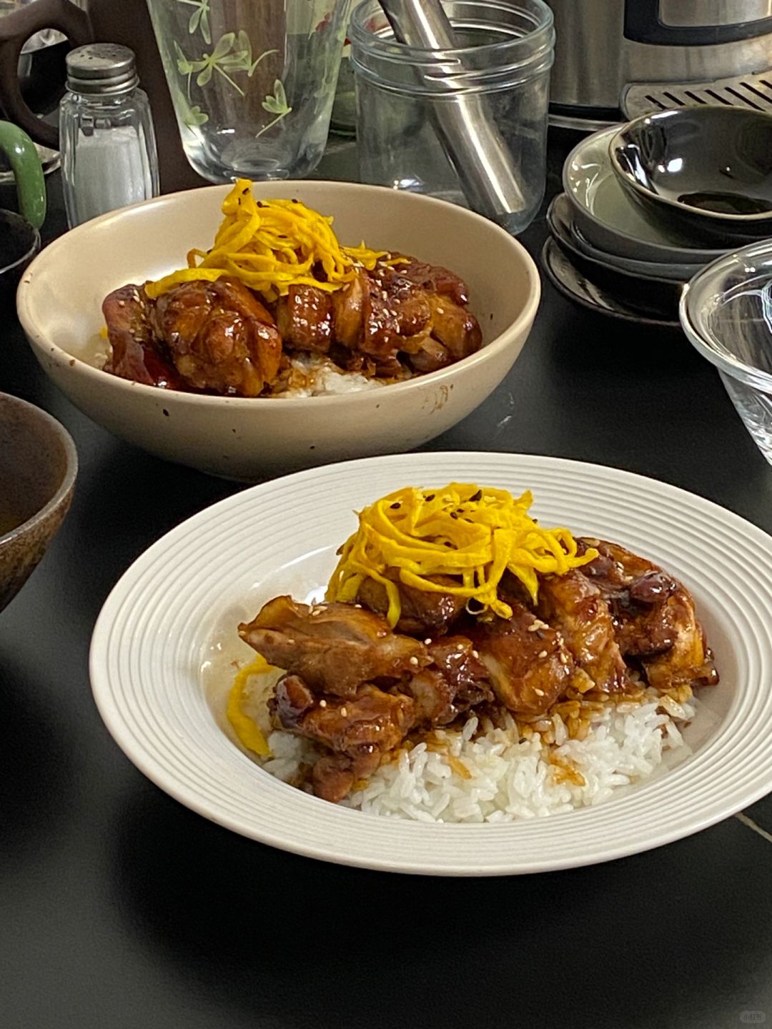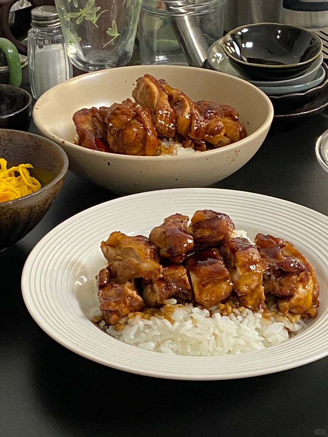 今日份的盖饭来了!简单又健康的照烧鸡腿饭菜谱! 食材: 鸡全腿2个|鸡蛋|照烧汁 准备工作: 1)调制照烧汁:2勺李锦记薄盐生抽、1勺老抽、2勺蜂蜜、1勺蚝油、1勺味淋 2)洗干净鸡腿开始腌制:2勺李锦记薄盐生抽、半勺老抽、料酒一点,盐一小勺、玉米淀粉1勺、蚝油半勺,腌制至少30分钟 制作: 1)锅中下油,油热后转小火,加入腌制好的鸡腿肉,开始煎炸至金黄色捞出 2)另起锅烧一点点油,倒入调好的照烧汁再把鸡腿放入,裹匀后切块 3)准备鸡蛋丝:鸡蛋打散,只需加一点盐,另起小锅,浅浅盖住锅底即可,小火直到鸡蛋皮表面熟透 tips: 1)关于老抽和生抽的比例,老抽通常加的比较少,但是如果需要上色调味,可以适当增加老抽的量,老抽是偏甜口调色重,生抽是偏咸口调味重,可参考之前做过的蜂蜜脆皮鸡腿饭 2)这次主打一个健康!自从了解到高盐饮食可能对肾脏造成负担后,基本上每次做饭都会格外控制盐的用量,李锦记这个品牌是我家最常用的,这一次的薄盐系列很符合我的口味,里面这款薄盐生抽选用非碘盐,减盐30%,不光减少了盐分,味道还更鲜美了,而且精选非转基因黄豆酿制,吃起来健康安心