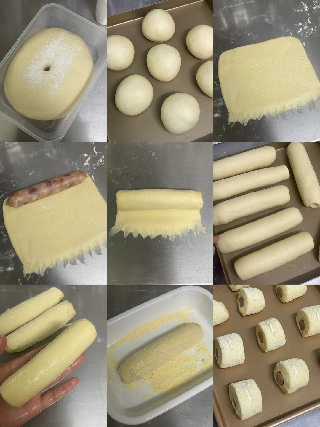 顶部放上一根香肠卷起来,表面喷水蘸芝士粉