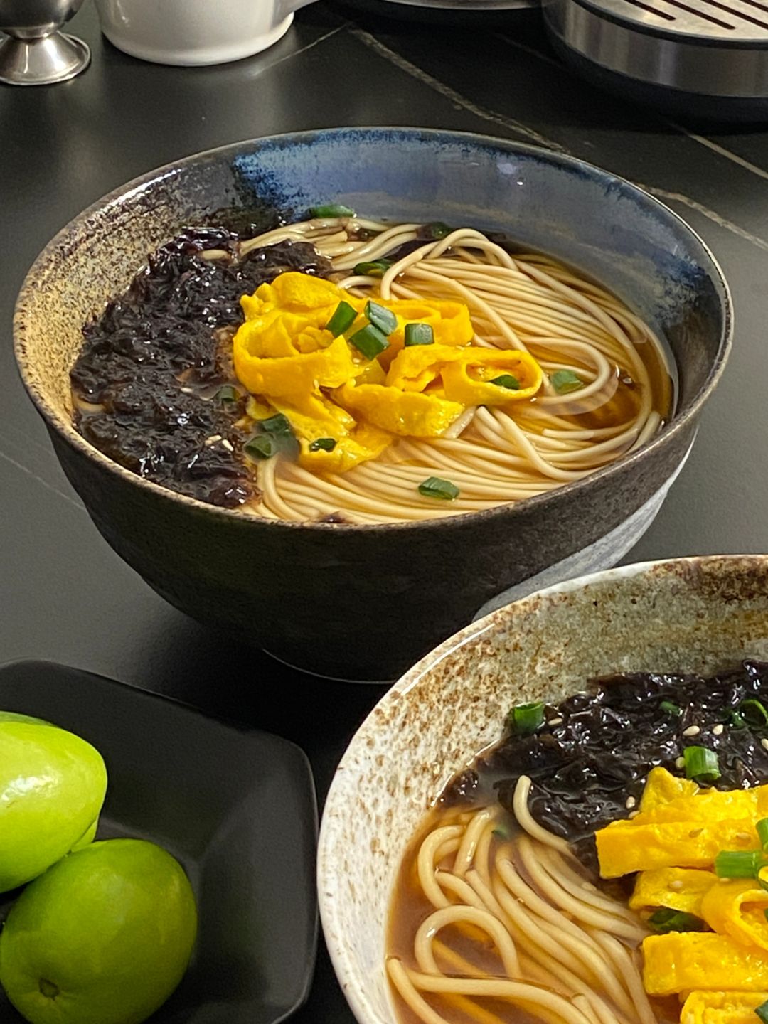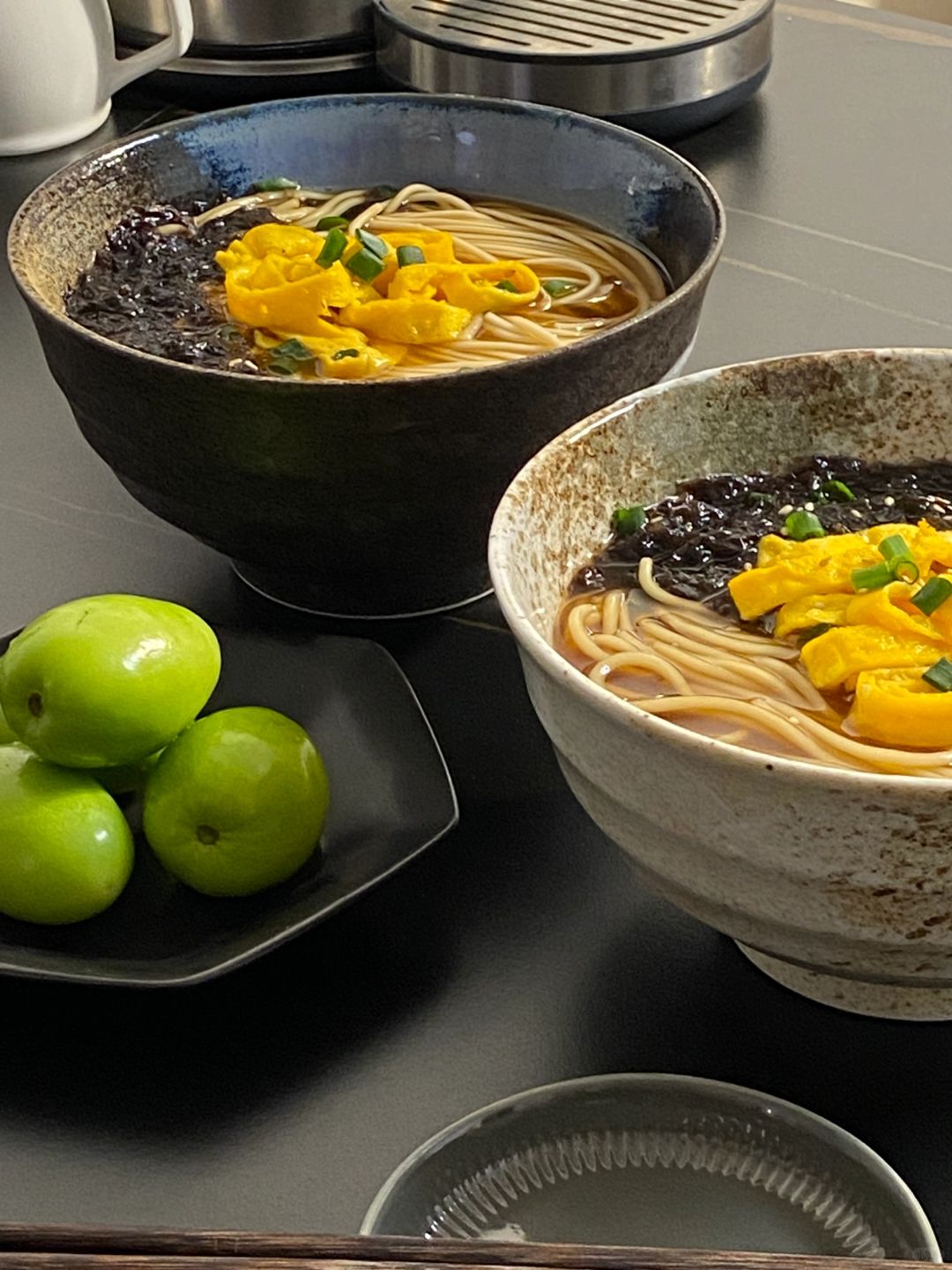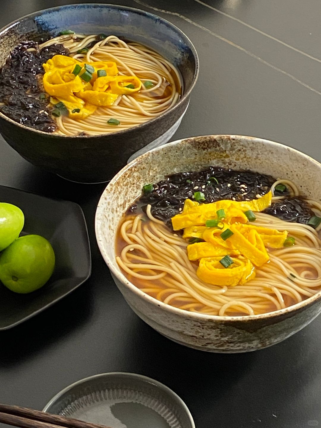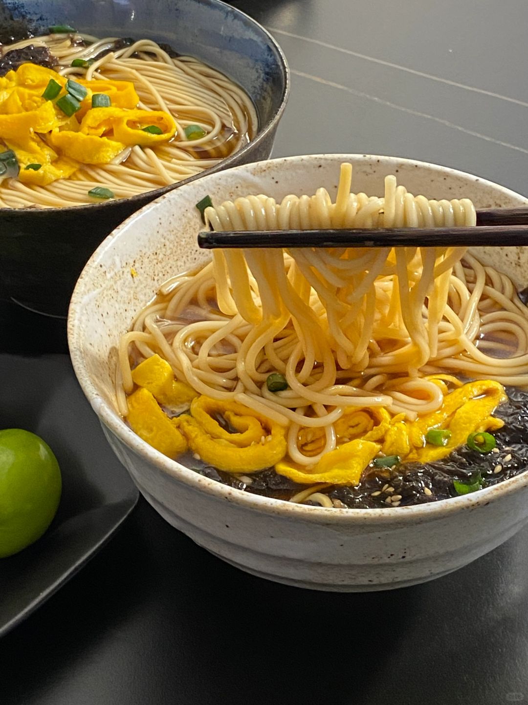 做鸡蛋丝的时候要小火,这样做出来的不焦,颜色金黄,底的味道和阳春面差不多,上面的紫菜和鸡蛋丝很添味