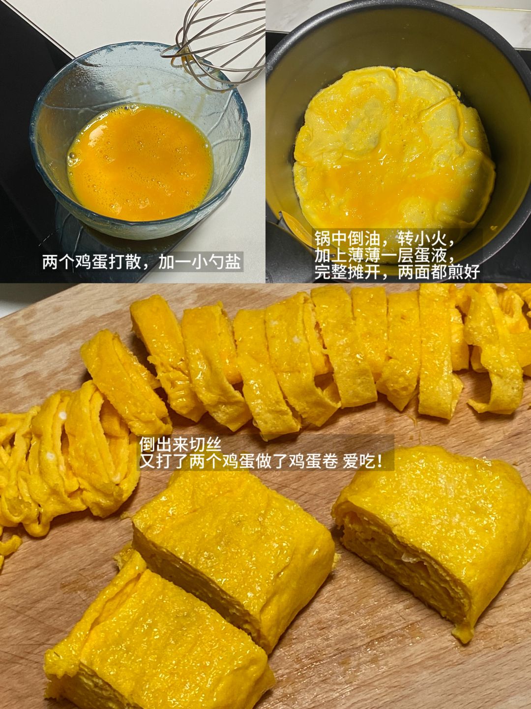 2)调完底之后先做蛋丝,两个鸡蛋打散,加一小勺盐,锅中倒油,转小火,加上薄薄一层蛋液,完整摊开,两面都煎好后,倒出来切丝
