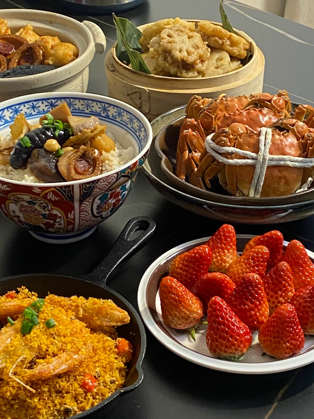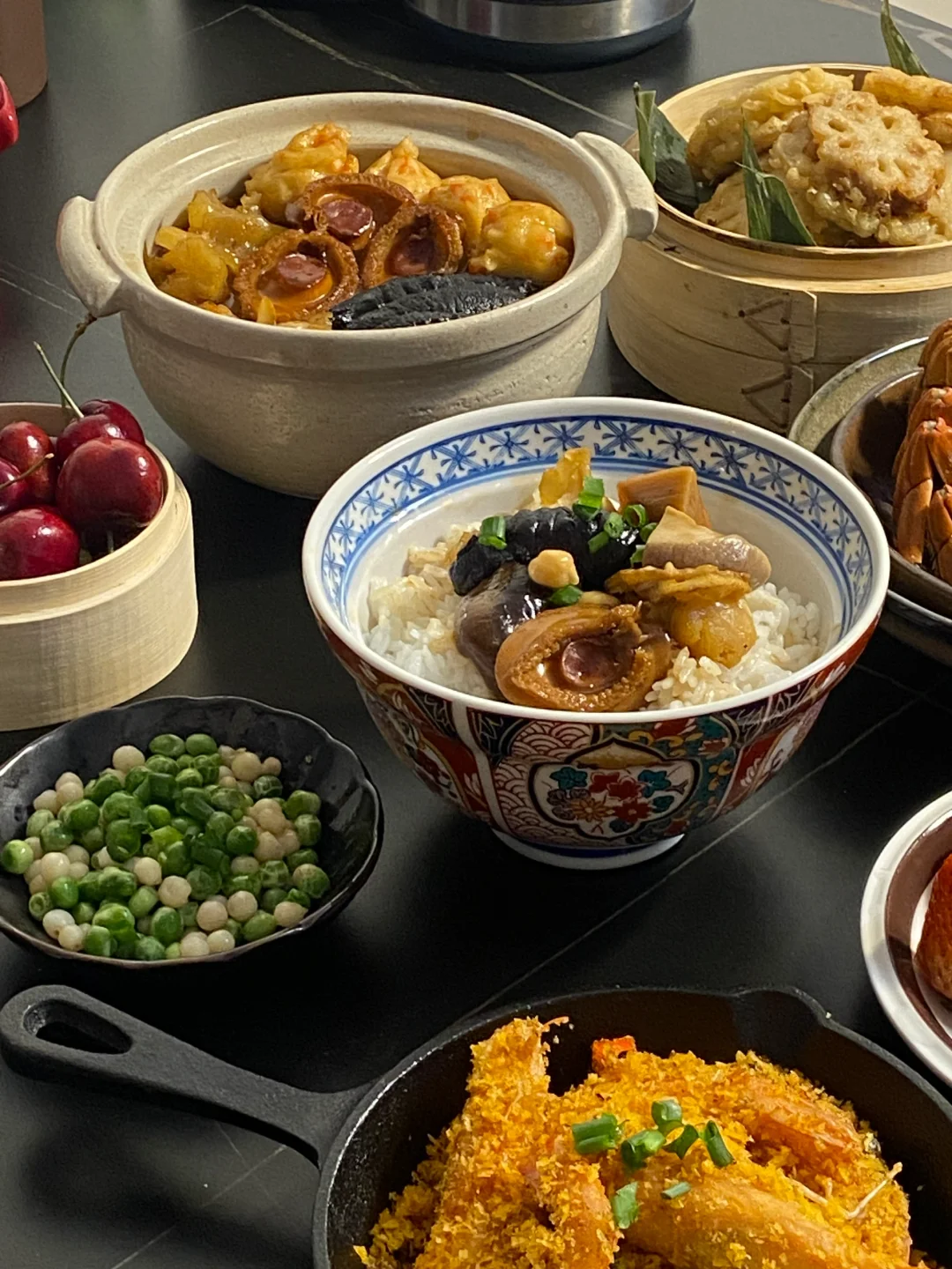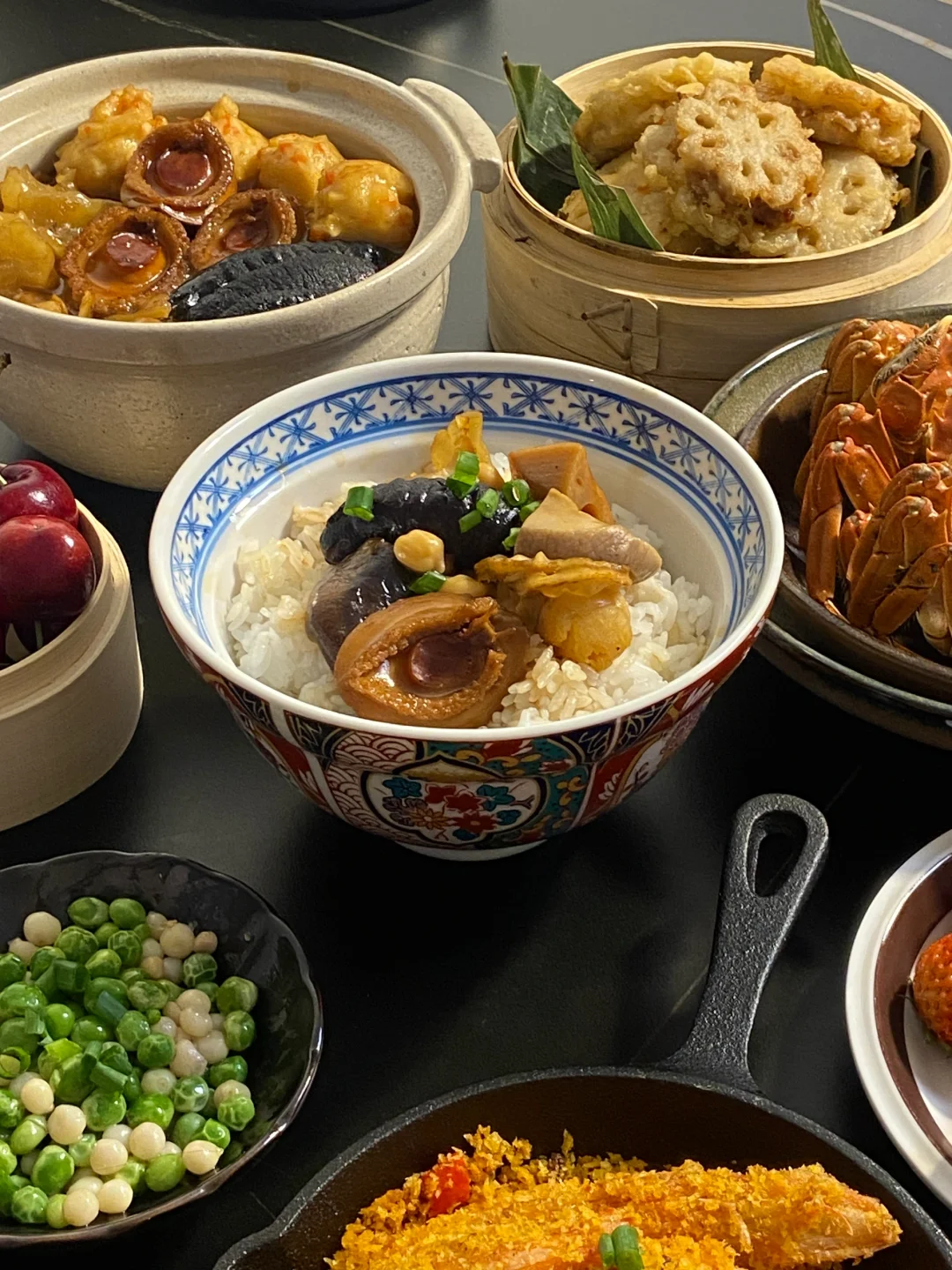 以广东口味为主的一顿过年食谱!简单好学!食谱:避风塘炒虾|佛跳墙盆菜|炸藕合|鸡头米豌豆|大闸蟹