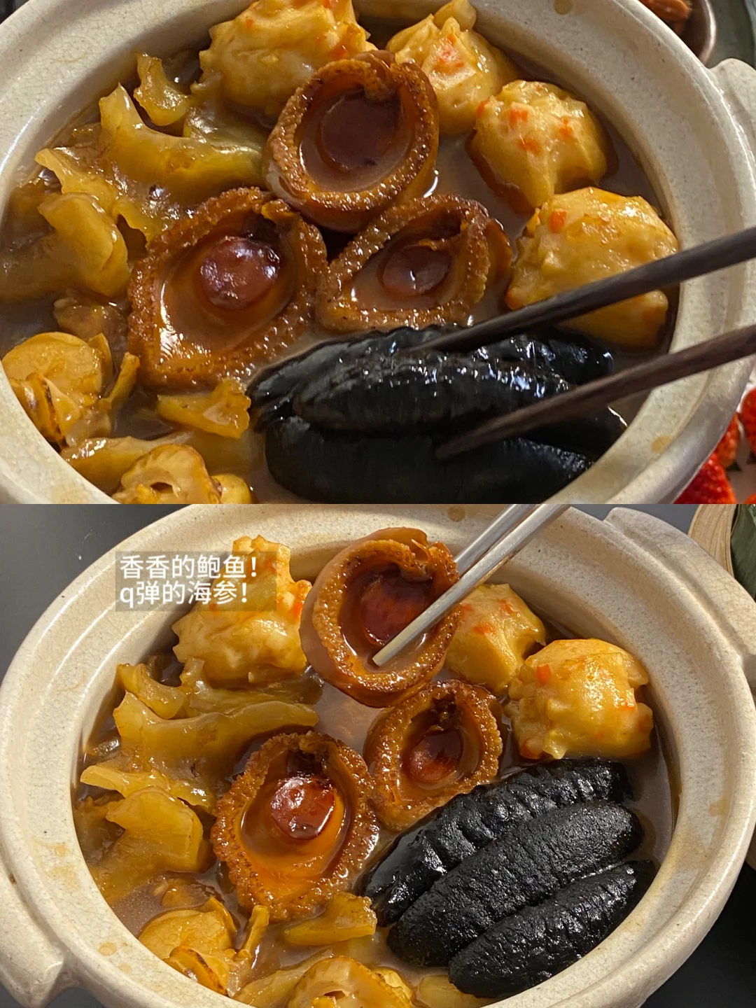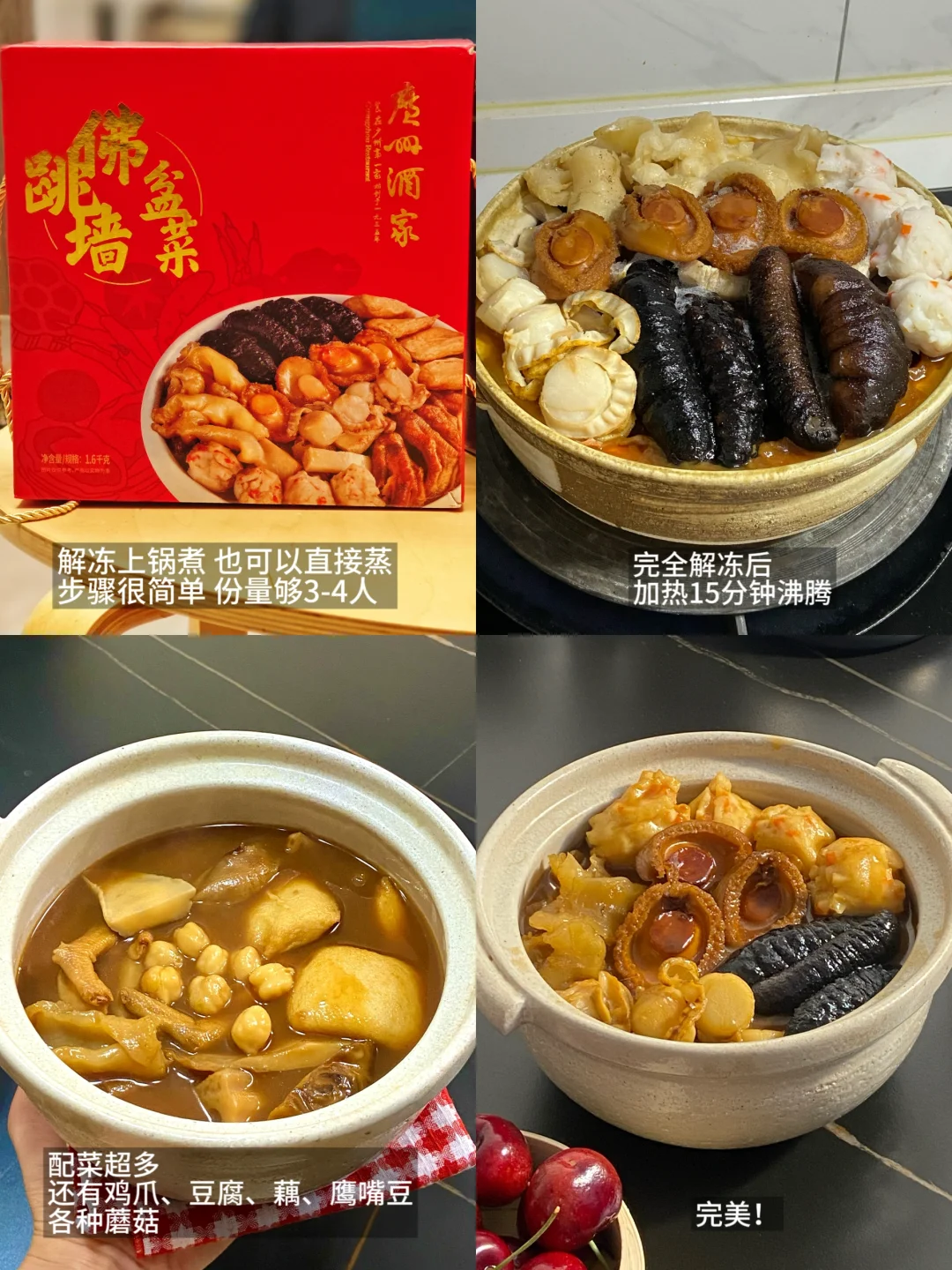 当然还有很具年味的盆菜!第一回吃这种的年菜,首先就是汤汁浓很好喝!还有Q弹的海参、鲍鱼、花胶、扇贝肉、鹰嘴豆、虾丸!每一个我都很爱吃!粤菜大师烹饪技艺,文火慢熬鲍汁浓汤!关键是做法超级简单 ,解冻后加热15分钟就可以大快朵颐啦 !