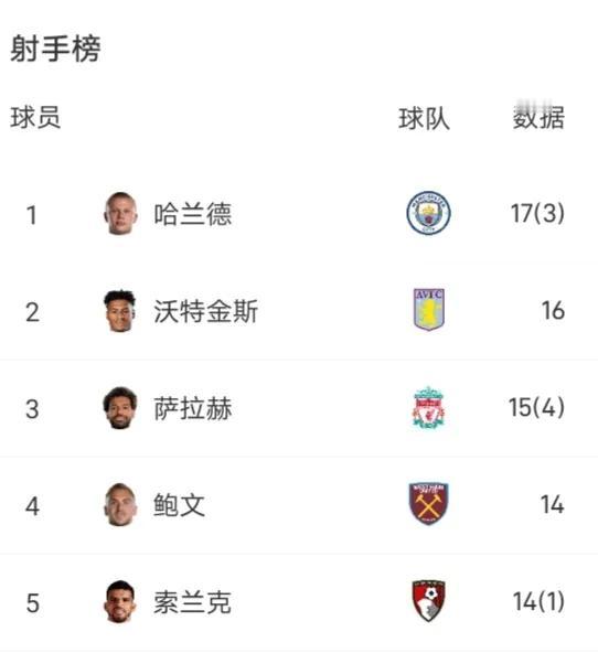 英超射手榜之争,抛开点球,其实维拉射手沃特金斯的进球数已经超过了哈兰德! 沃特金斯的16个进球全是运动战进球,这就很不一般,沃特金斯出自一个不知名的小球会,拿过英冠最佳射手,2020年才转会到维拉,但在维拉每个赛季能进球上双也很不错容易,本赛季他打进16球也是超过了之前在维拉每个赛季的进球数,显然如此好的状态保持到赛季结束,肯定也会成为哈兰德最大的竞争对手。 相比于上个赛季的进球榜,哈兰德36球,凯恩30球,本赛季的进球数明显偏少,上赛季曼城一共进了94球,均场2.5球,而本赛季曼城才进59球,均场2.3球,显然哈兰德的火力减弱,曼城的总进球就会减少,反之这赛季利物浦成了火力最强的队伍,射手榜前四差距不大,这个赛季的英超金靴有得看了。