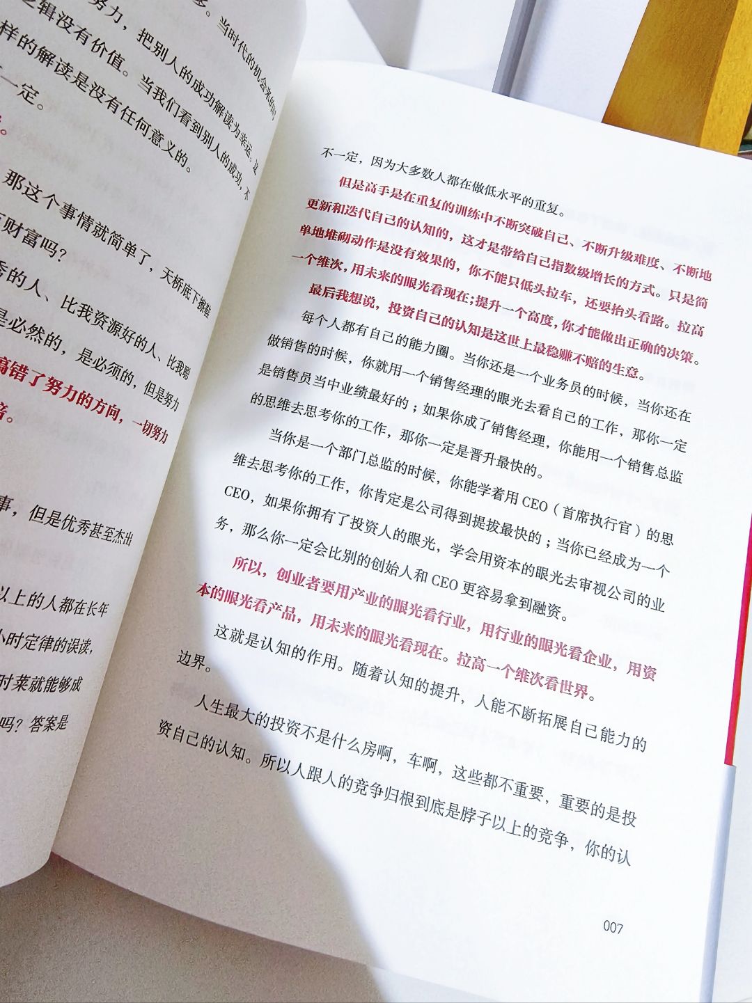 在这本书里他主要提到一个观念就是悲观者获取正确,但乐观者才能创造未来。我对于自己的认知其实是一个悲观者。我总是把所有的事情都做到最坏的打算,也时常不自信,觉得自己不如别人。但是我的闺蜜却是一个乐观者且自信的人,她觉得自己就是最好的。我们每次聊天她都会觉得我过于悲观,在这本书中张琦告诉我们,看到别人看不到的事,去做别人不敢做的事,你才能成为别人成不了的事儿。