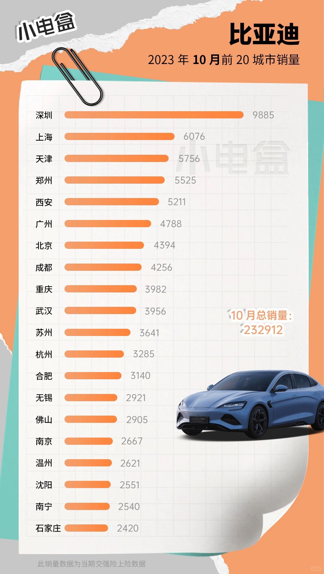 比亚迪和特斯拉,10月销量的前20城市排行来了……