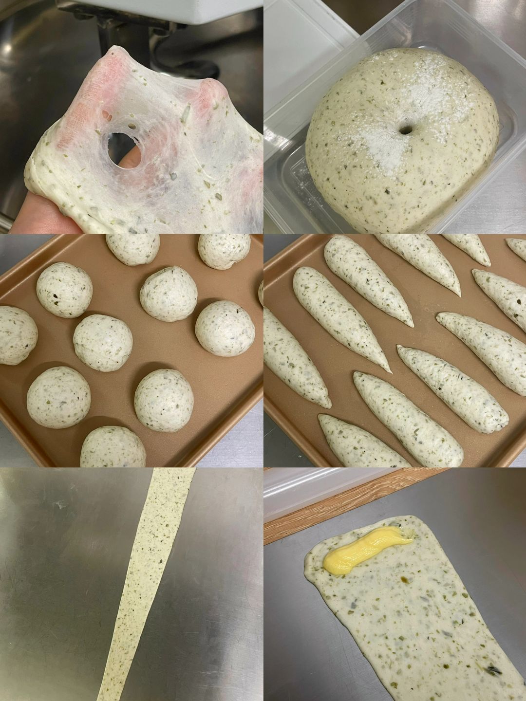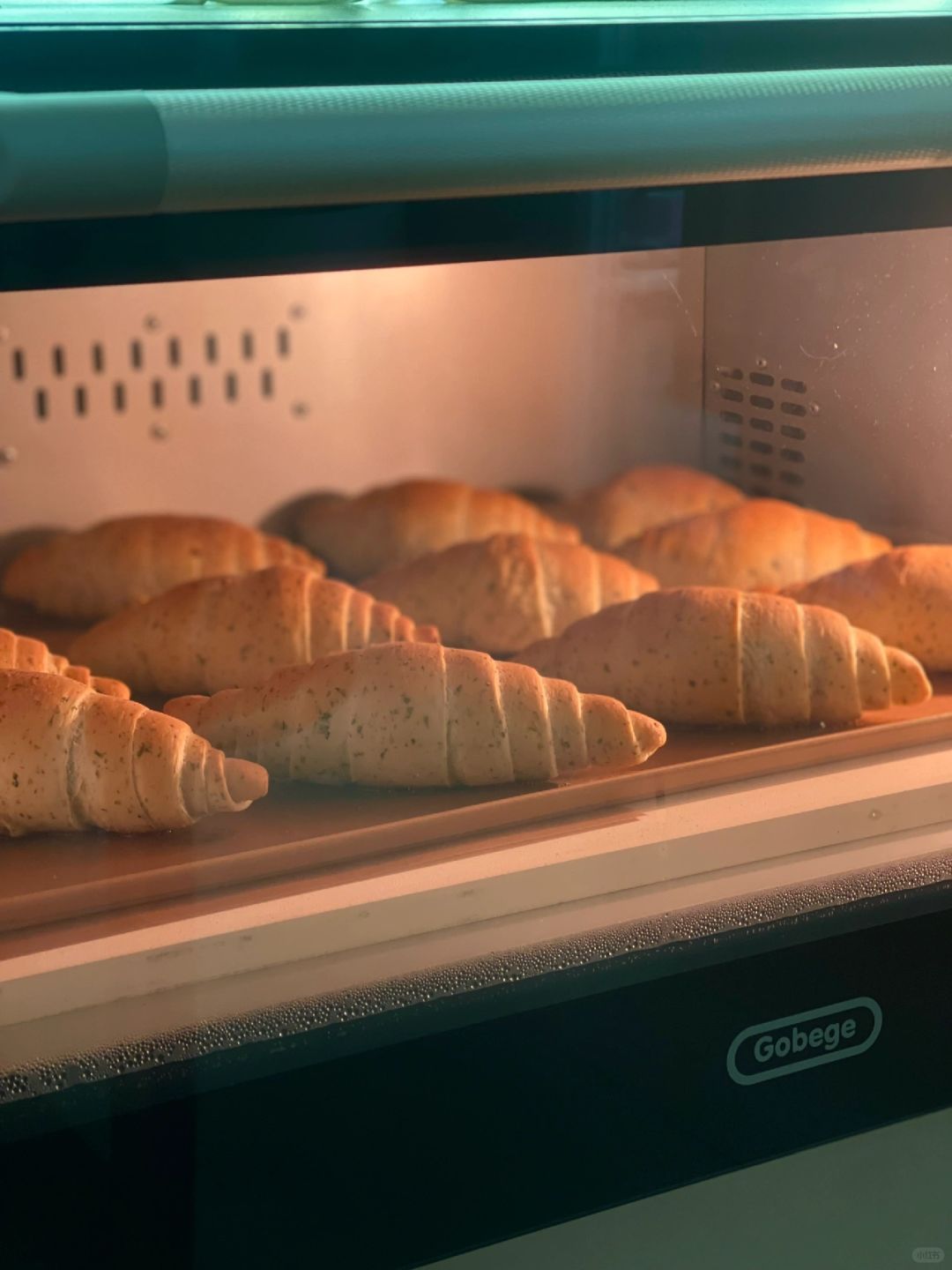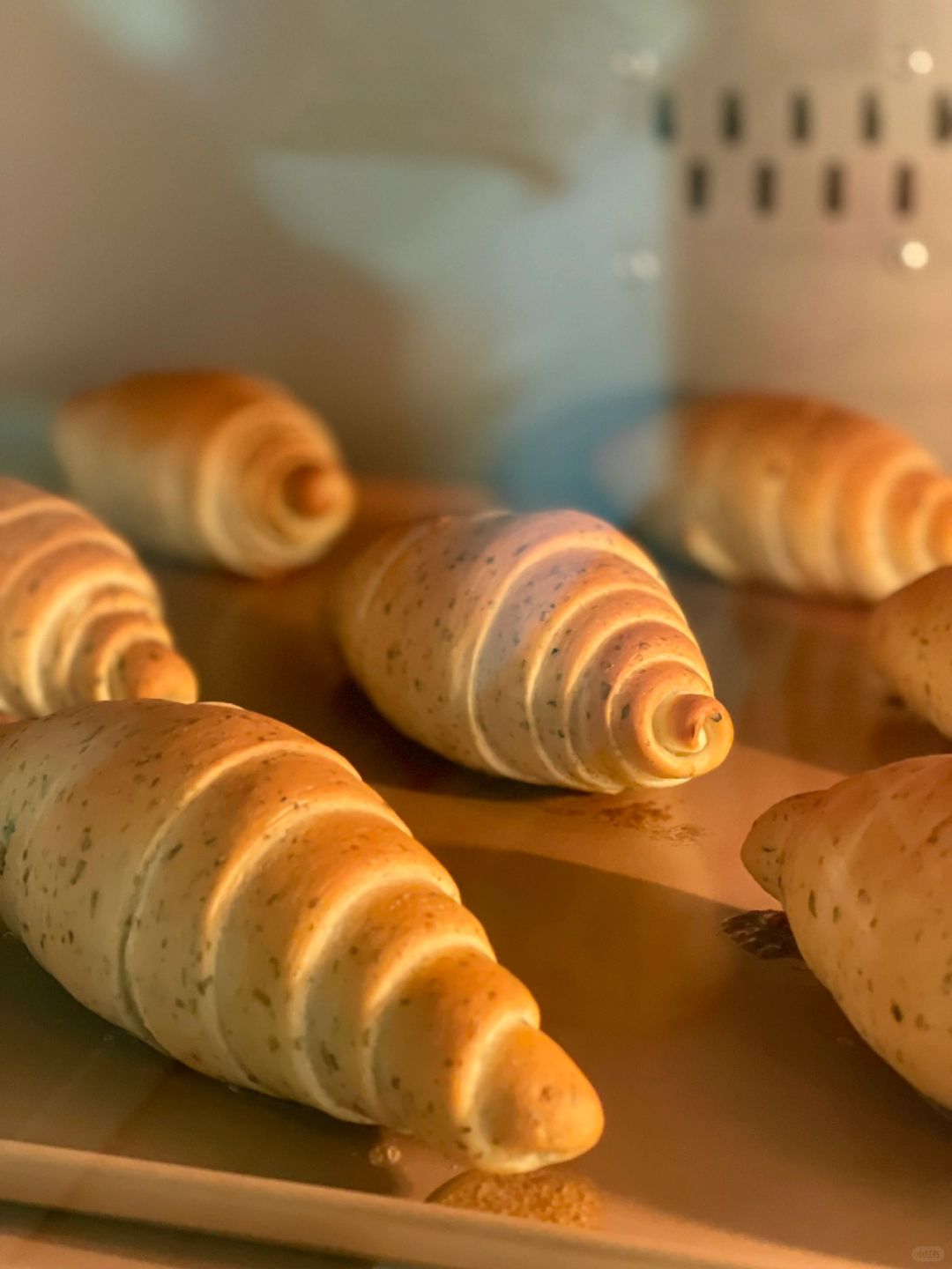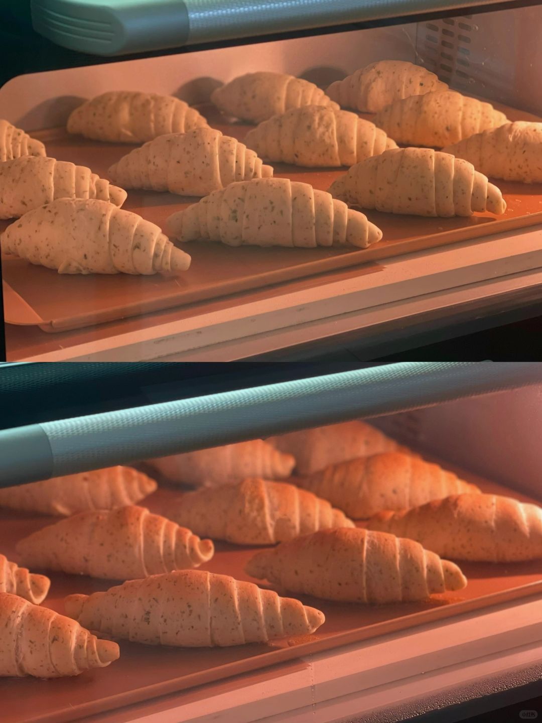 👩🏻‍🍳材料准备(这个配方可以做12个) 300克高筋面粉|75克低筋面粉|220克牛奶 15克糖|6克盐|5克海苔粉|10克黄油 45克冰水|10克鲜酵母 👩🏻‍🍳做法步骤 1⃣️把所有材料除去黄油,盐以外全部混合 低速揉成团,开高速,面团光滑➕黄油,盐 开高速打出8成筋左右即可(控制面温) 2⃣️送入烤箱28度基础发酵,40分钟左右 手指戳洞不回缩即可 3⃣️面团取出来平均分成12份,滚圆,室温松弛 10分钟,再把面团搓成水滴状,密封冷藏50分钟 4⃣️冰箱松弛好的面团,拍扁擀成长度50cm的 等腰三角形,擀开上面再提着下面慢慢擀长 5⃣️擀长以后翻面边缘抹上融化的黄油,挤入黄油 (4克黄油)从上往下卷起来,⚠️不要卷太紧 6⃣️送入烤箱进行二次发酵,36度发酵40分钟 可以放一杯热水增加湿度,发酵到1.5倍大 摇晃烤盘面包duangduang 的即可 7⃣️送入预热好的烤箱,上火215度下火190度 烤18分钟左右,上色即可盖锡纸