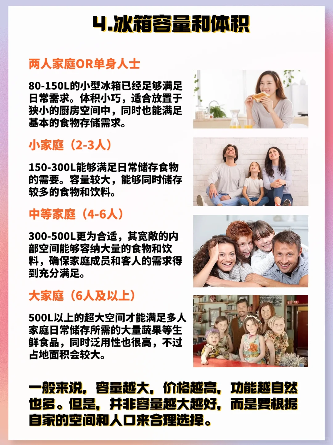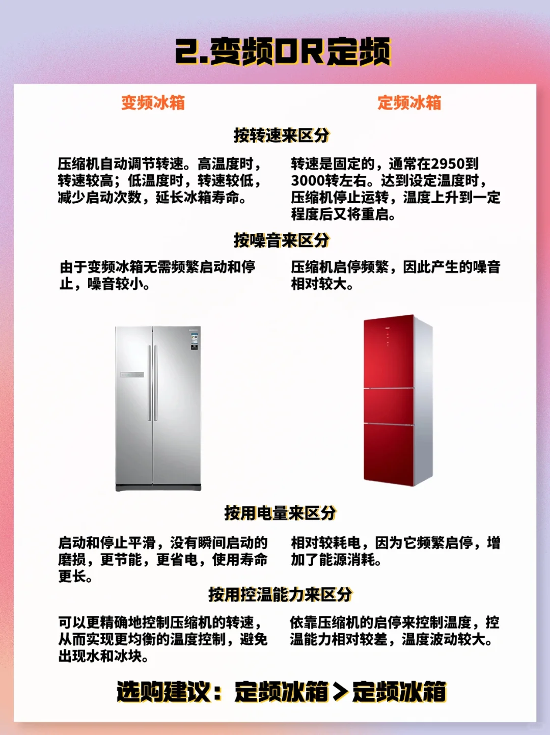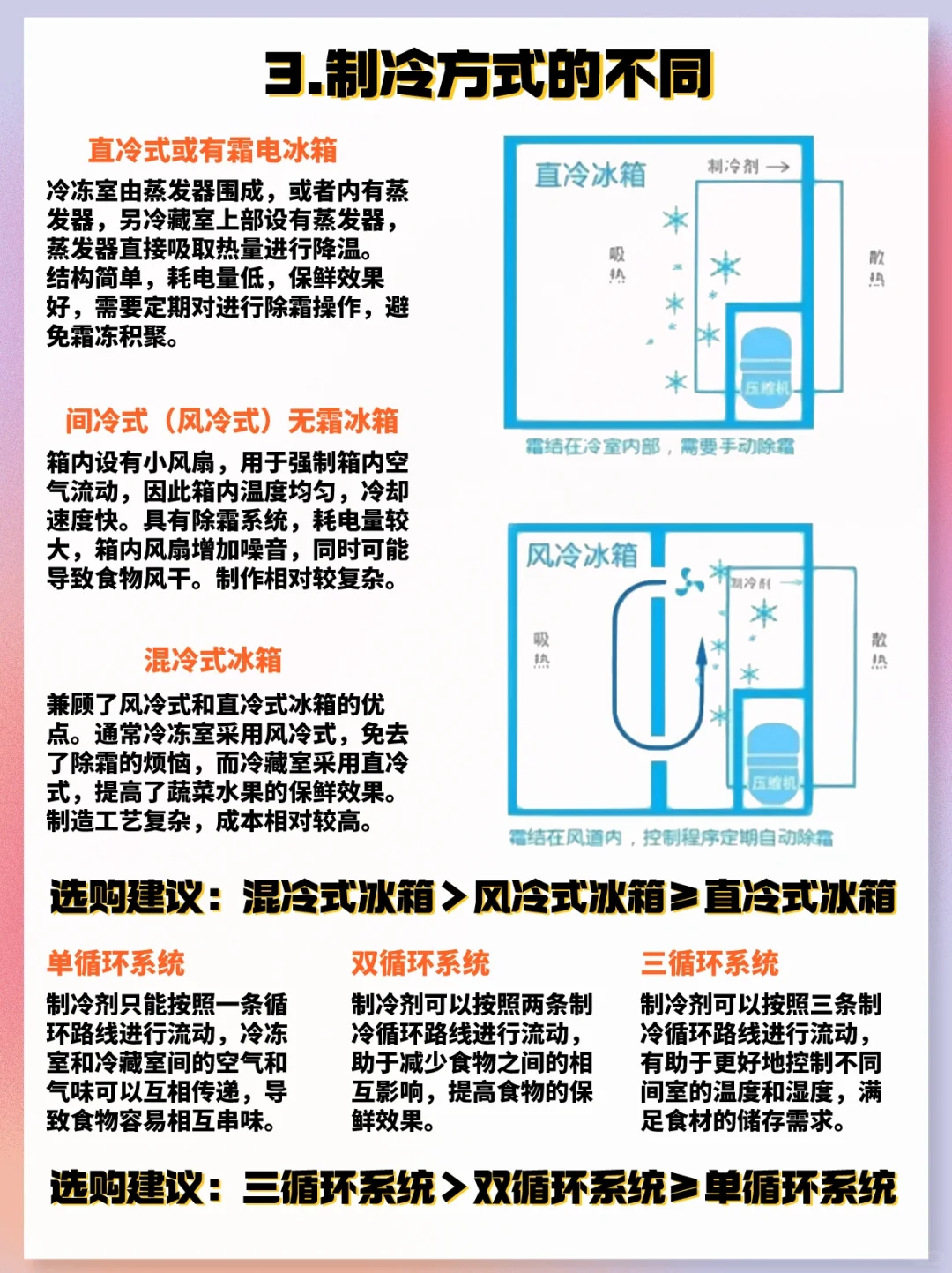 1️⃣冰箱款式 可根据预算以及实际需求,以及图上列出的优缺点进行选择。 2️⃣变频or定频 无论是转速、噪音、电量、控温能力,变频的优势>定频。 3️⃣制冷方式的不同 制冷方式:混冷>风冷>直冷 制冷循环系统:多循环>双循环>单循环 4️⃣冰箱容量和体积 两人家庭OR单身人士:80-150L 小家庭(2-3人):150-300L 中等家庭(4-6人):300-500L 大家庭(6人及以上):500L以上