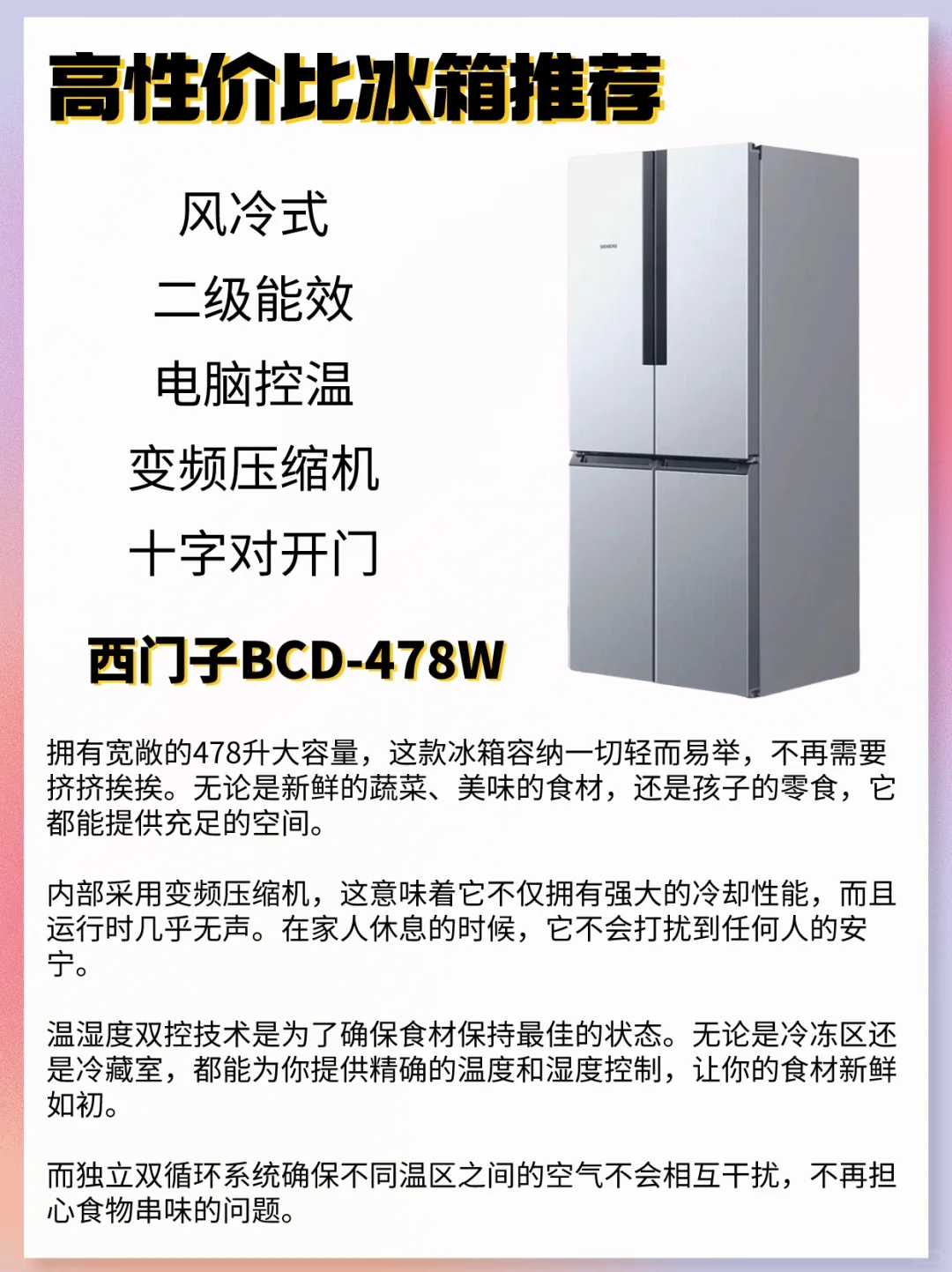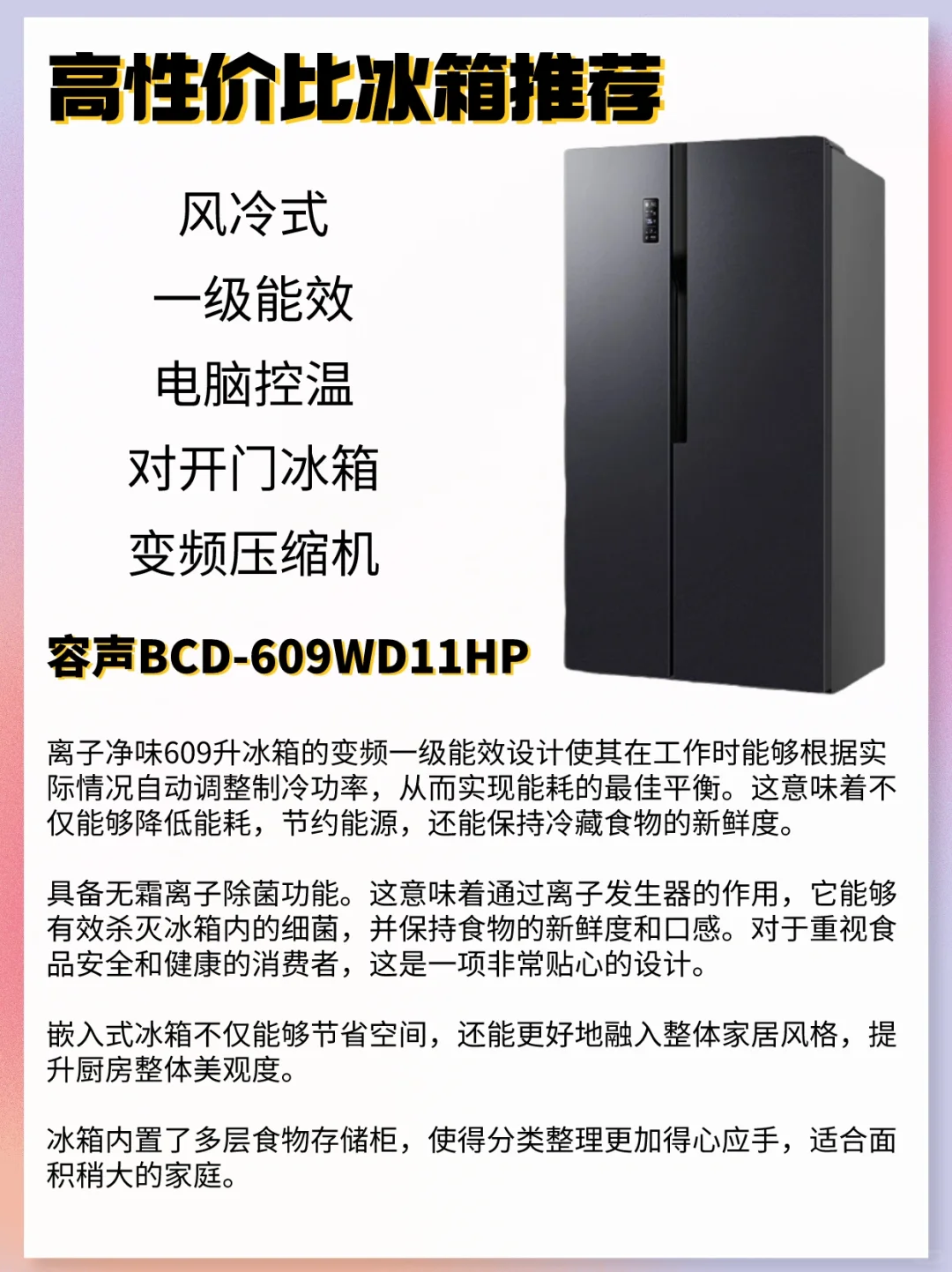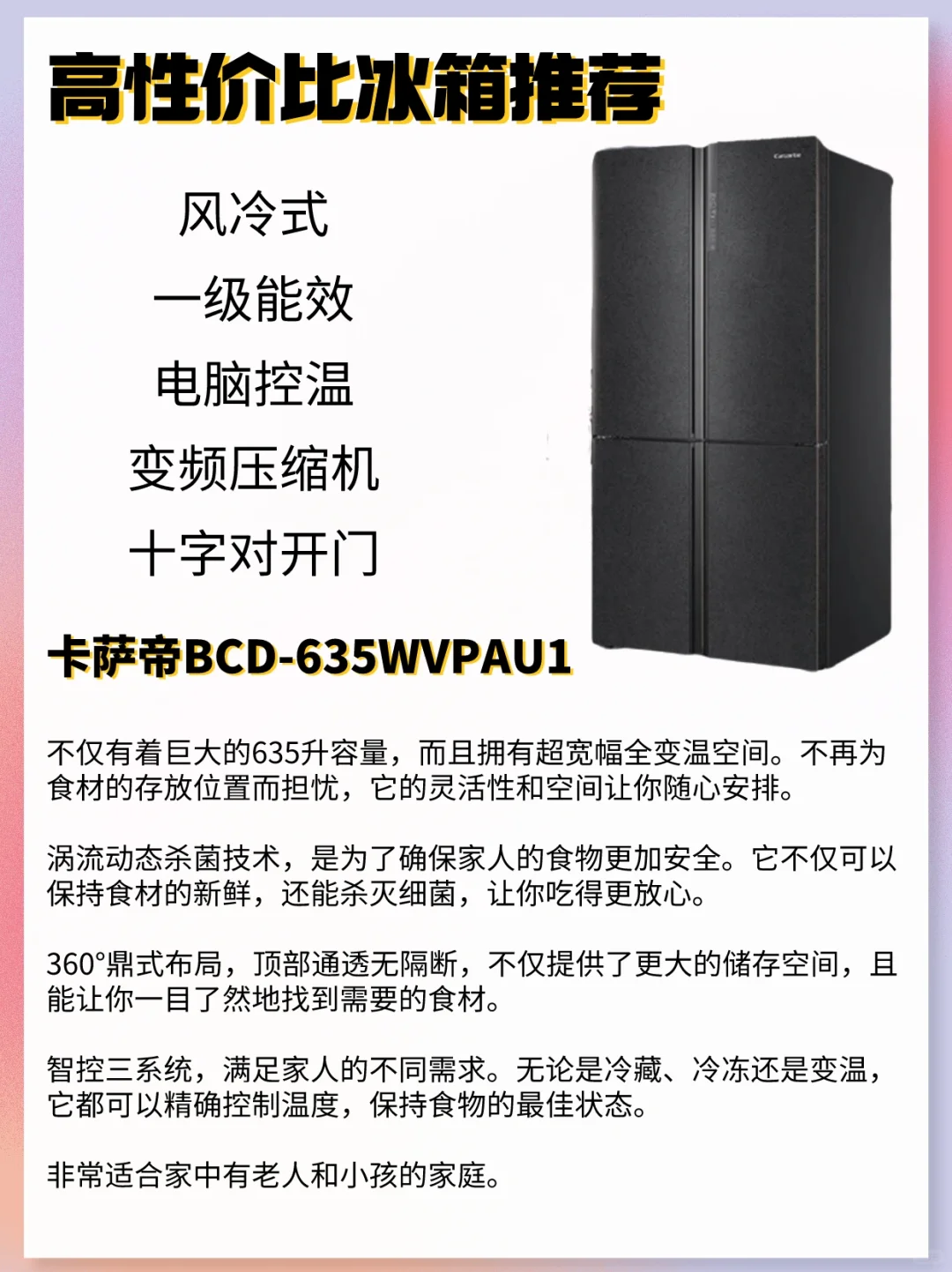 1️⃣冰箱款式 可根据预算以及实际需求,以及图上列出的优缺点进行选择。 2️⃣变频or定频 无论是转速、噪音、电量、控温能力,变频的优势>定频。 3️⃣制冷方式的不同 制冷方式:混冷>风冷>直冷 制冷循环系统:多循环>双循环>单循环 4️⃣冰箱容量和体积 两人家庭OR单身人士:80-150L 小家庭(2-3人):150-300L 中等家庭(4-6人):300-500L 大家庭(6人及以上):500L以上