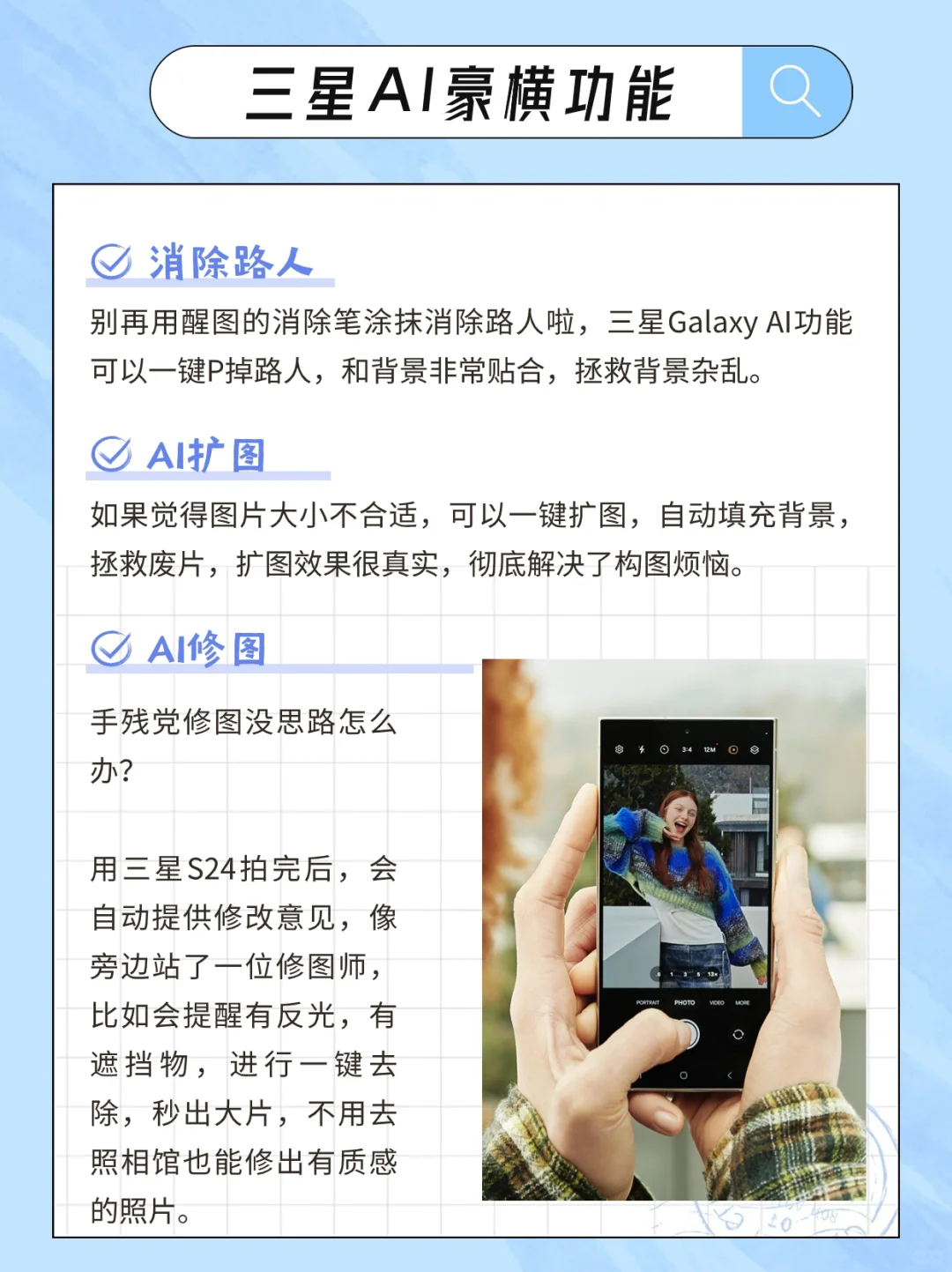 3️⃣AI修图:手残党修图没思路怎么办?用三星S24拍完后,会自动提供修改意见,像旁边站了一位修图师,比如会提醒有反光,有遮挡物,进行一键去除,秒出大片,不用去照相馆也能修出有质感的照片🔥