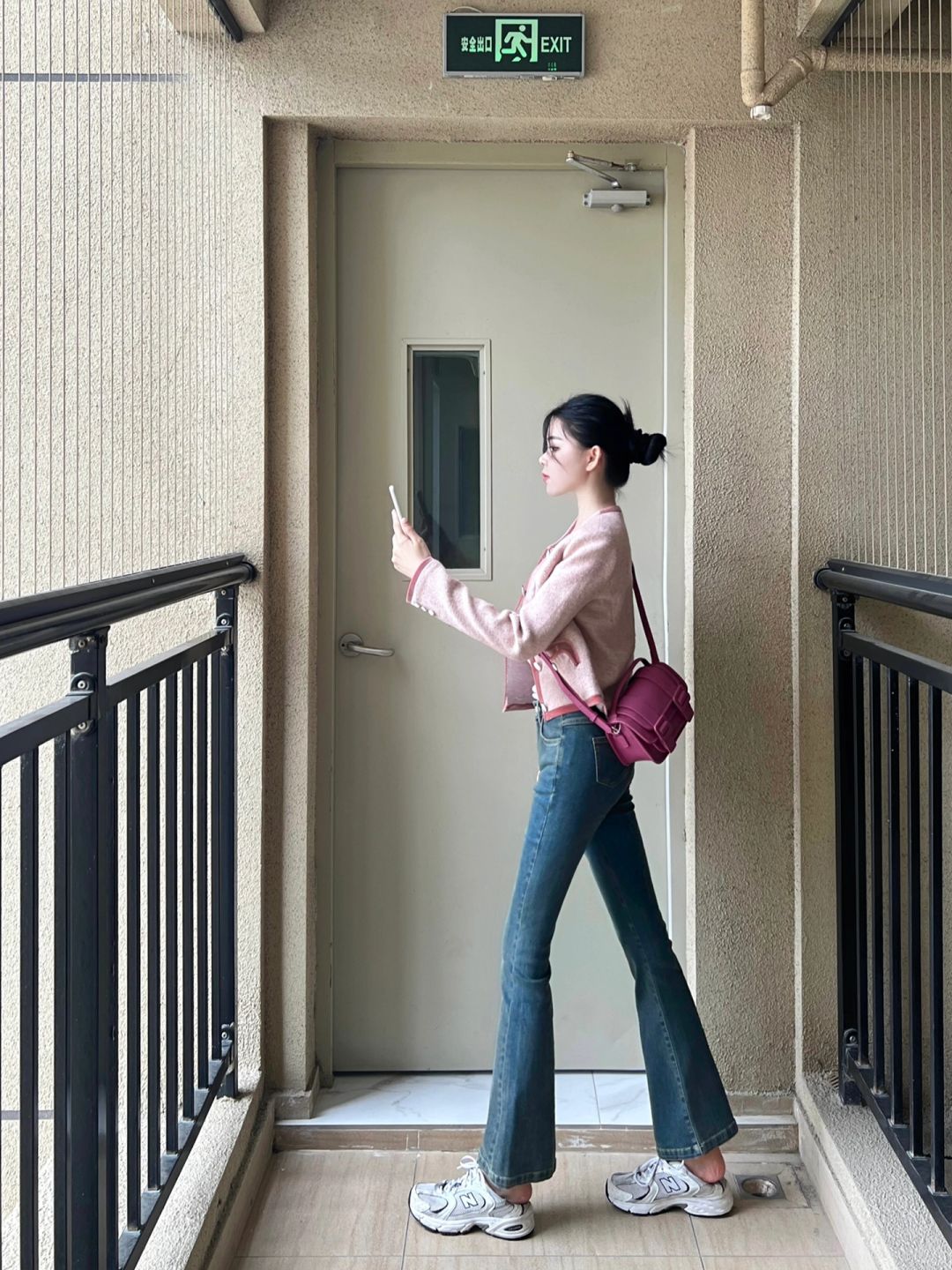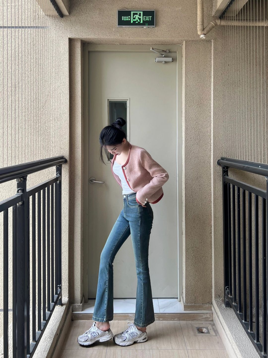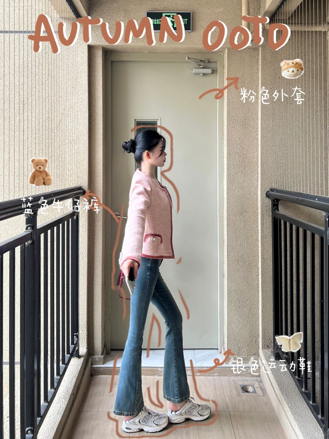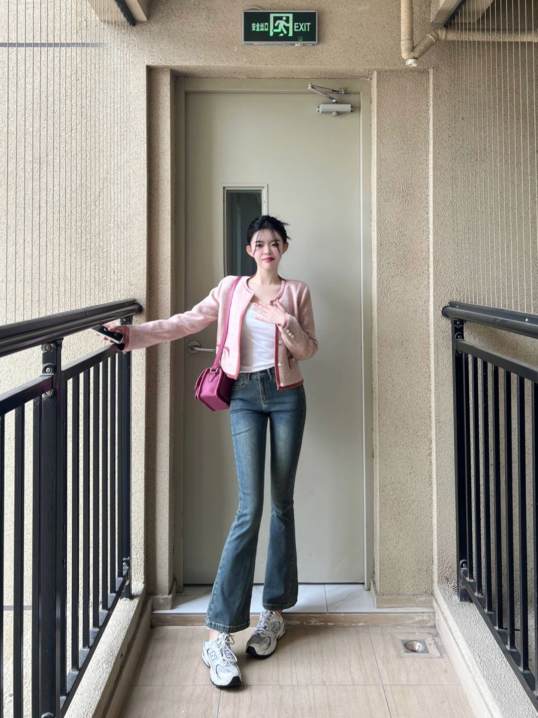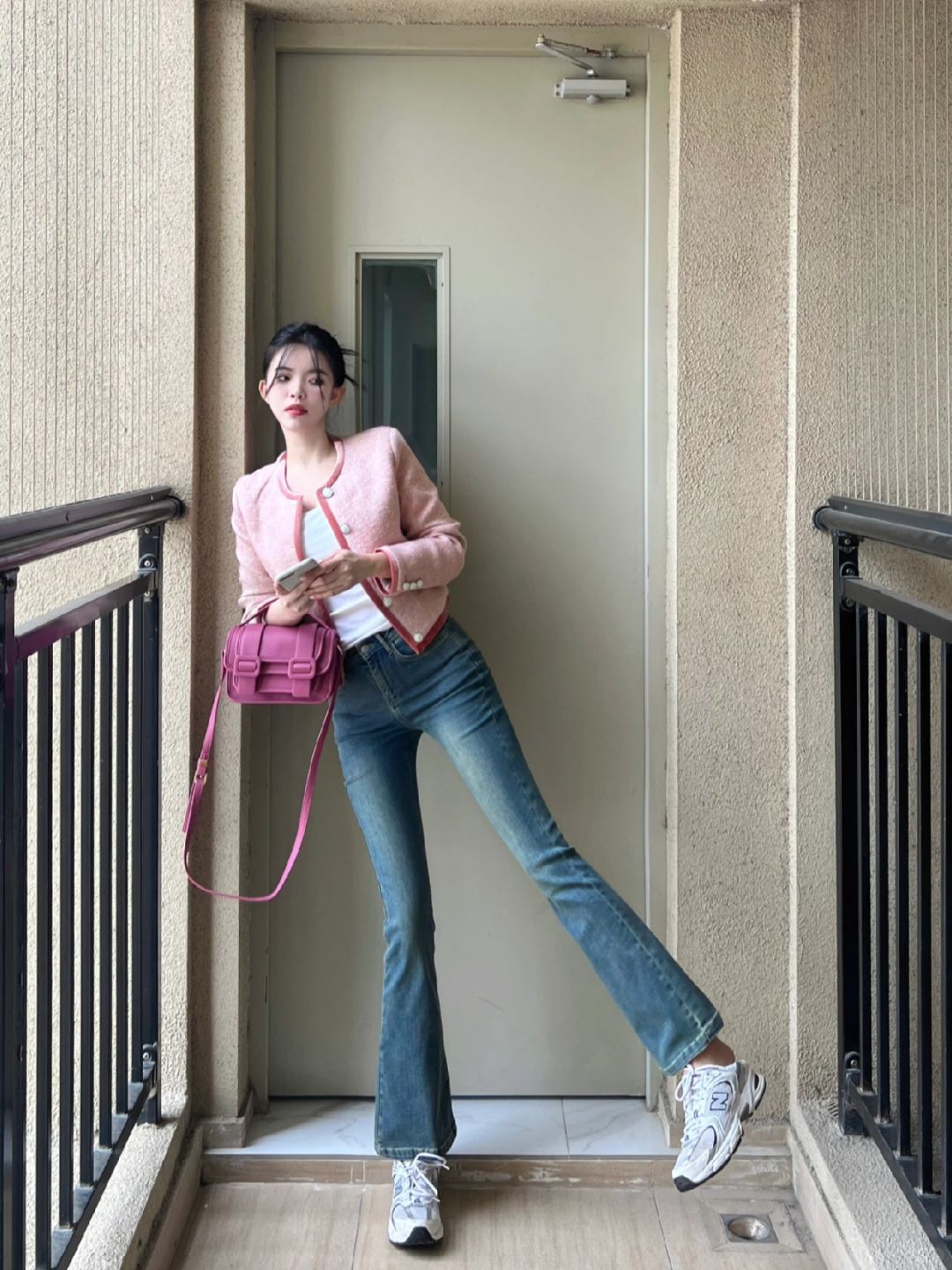 粉色宽松短外套和高腰牛仔9分喇叭裤!