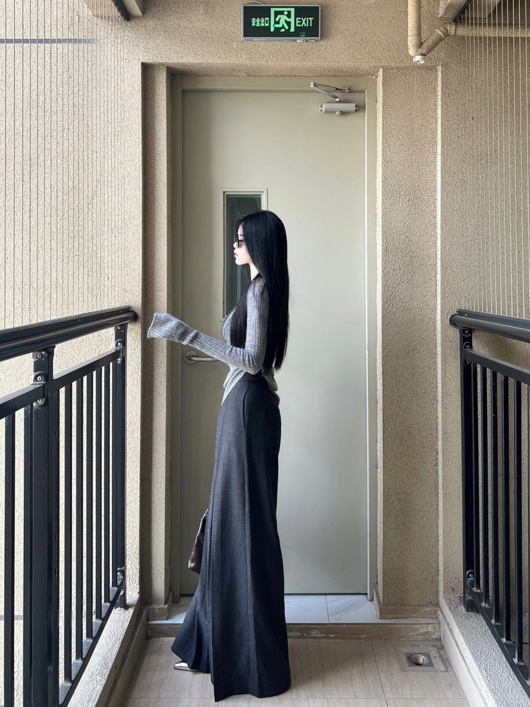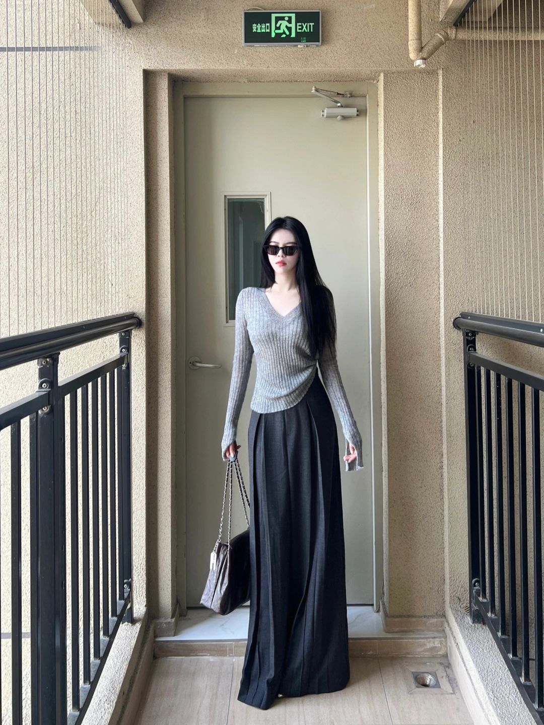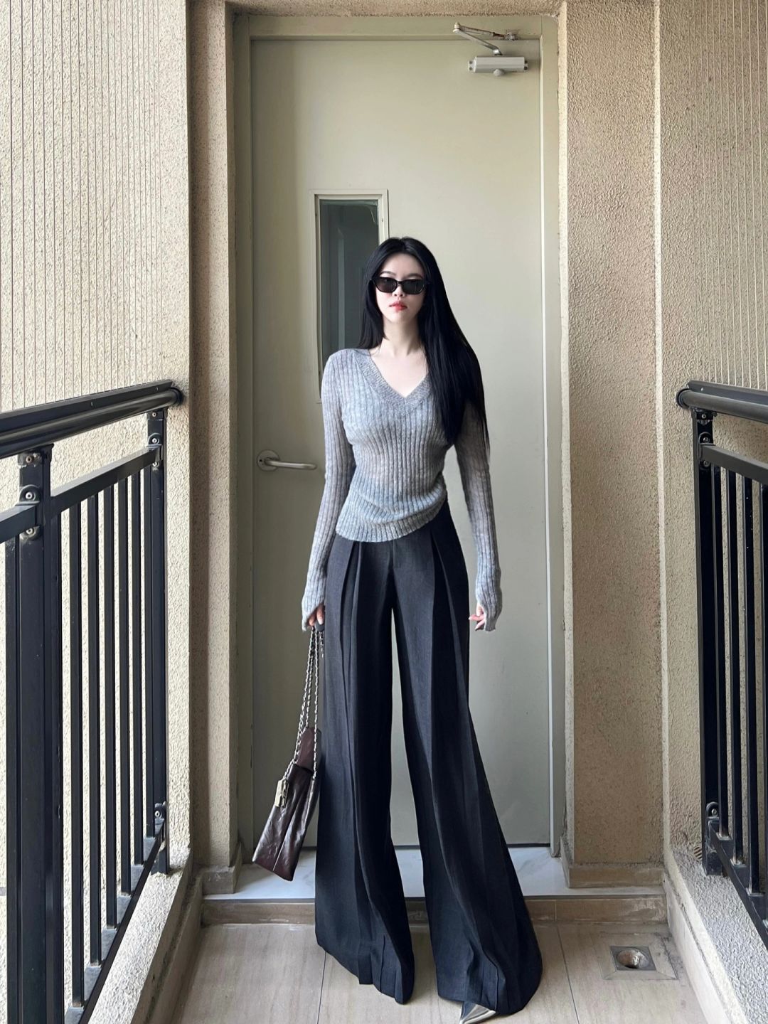 拖地西裤和灰色针织上衣
