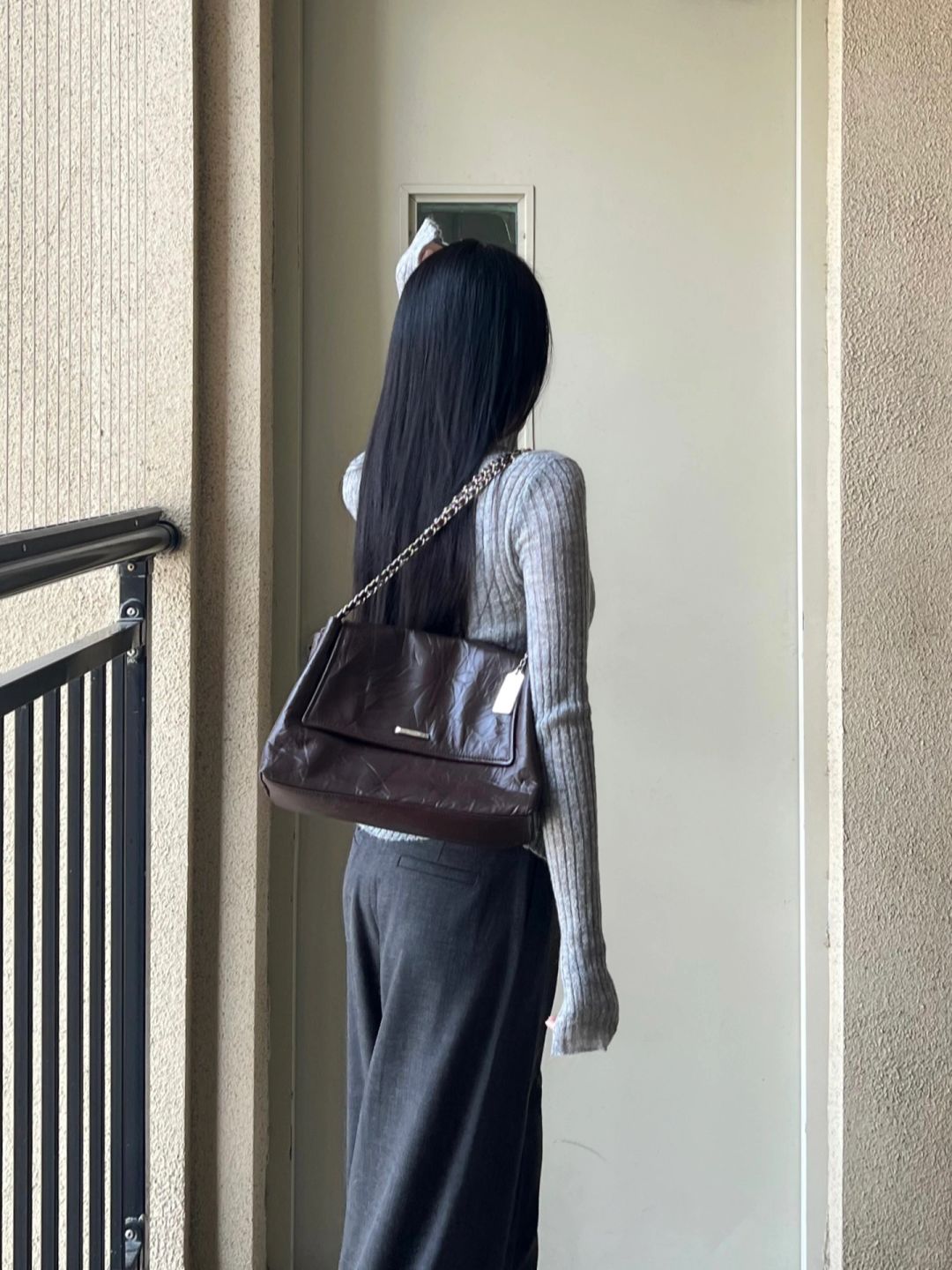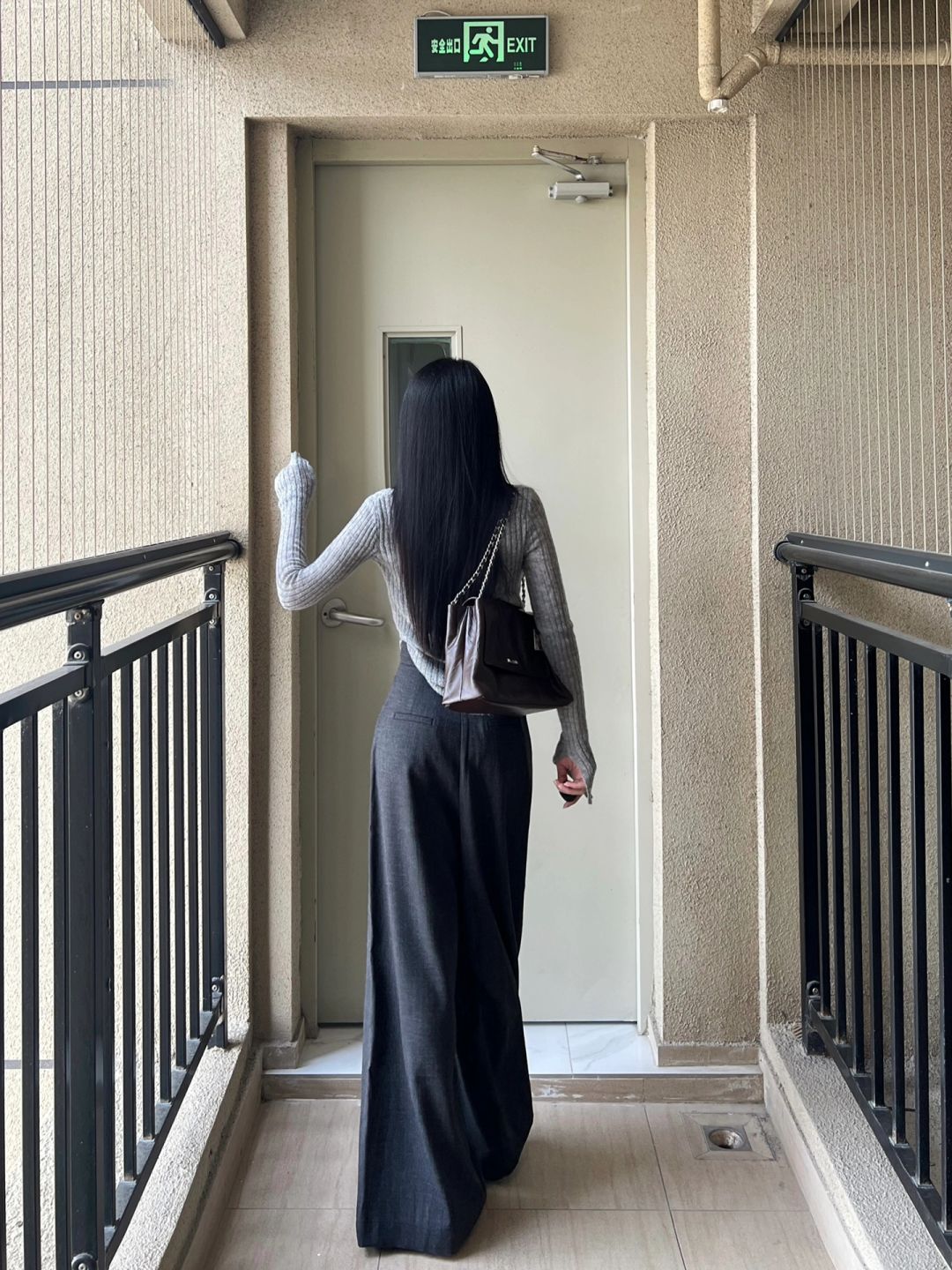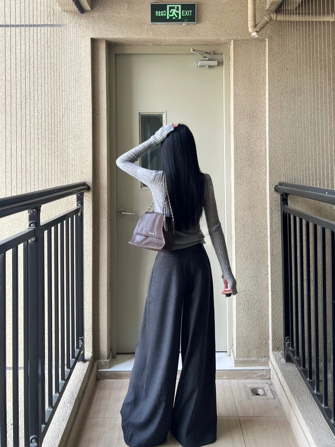 拖地西裤和灰色针织上衣