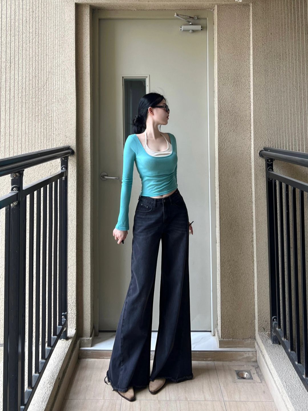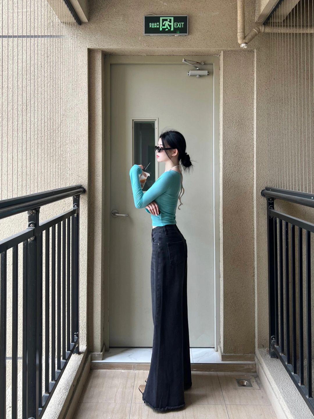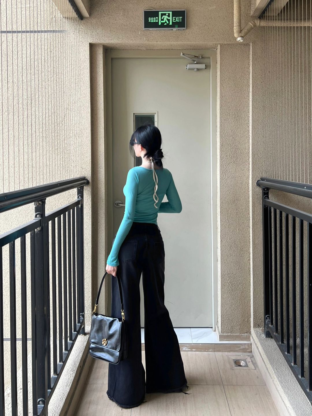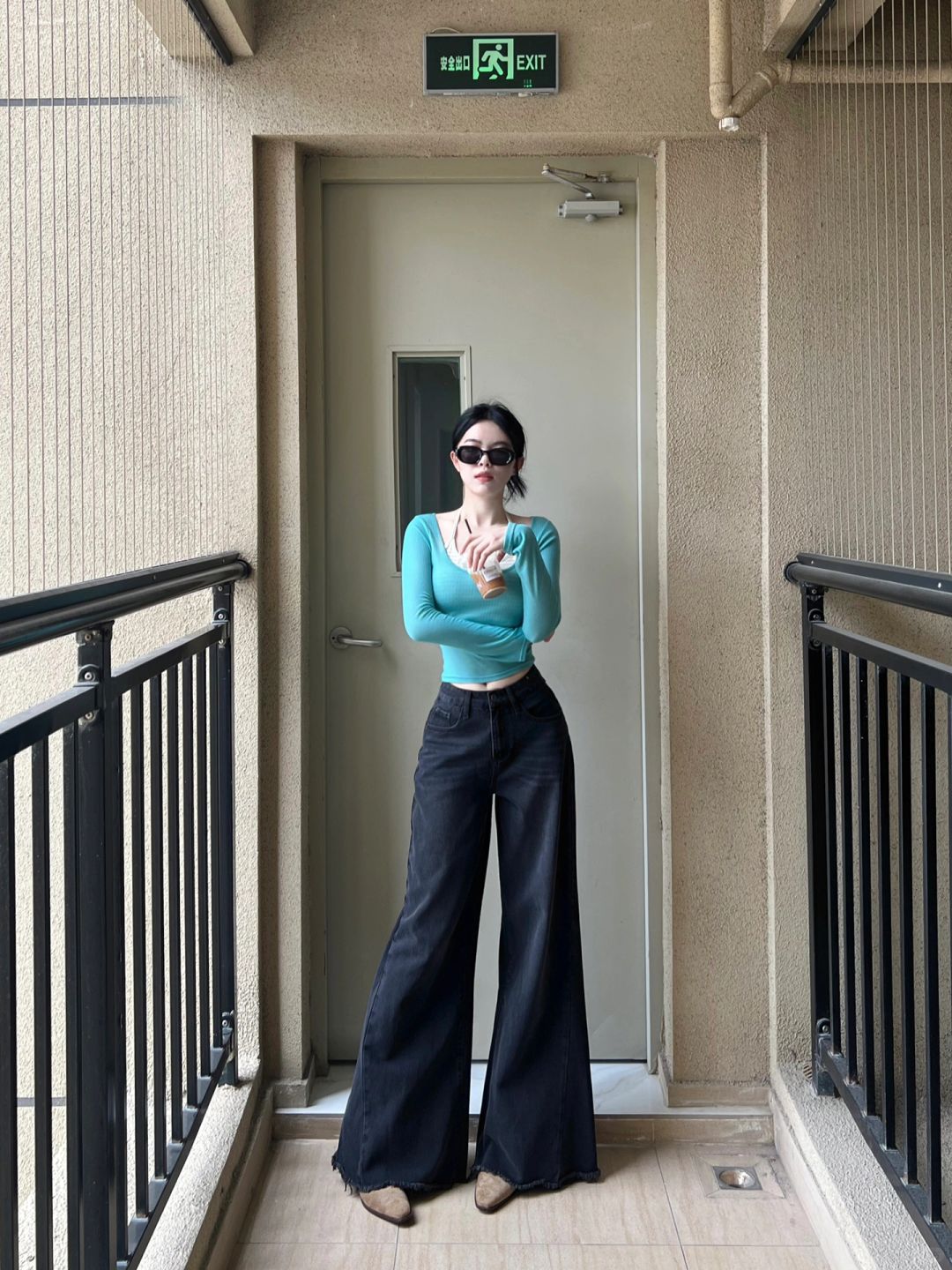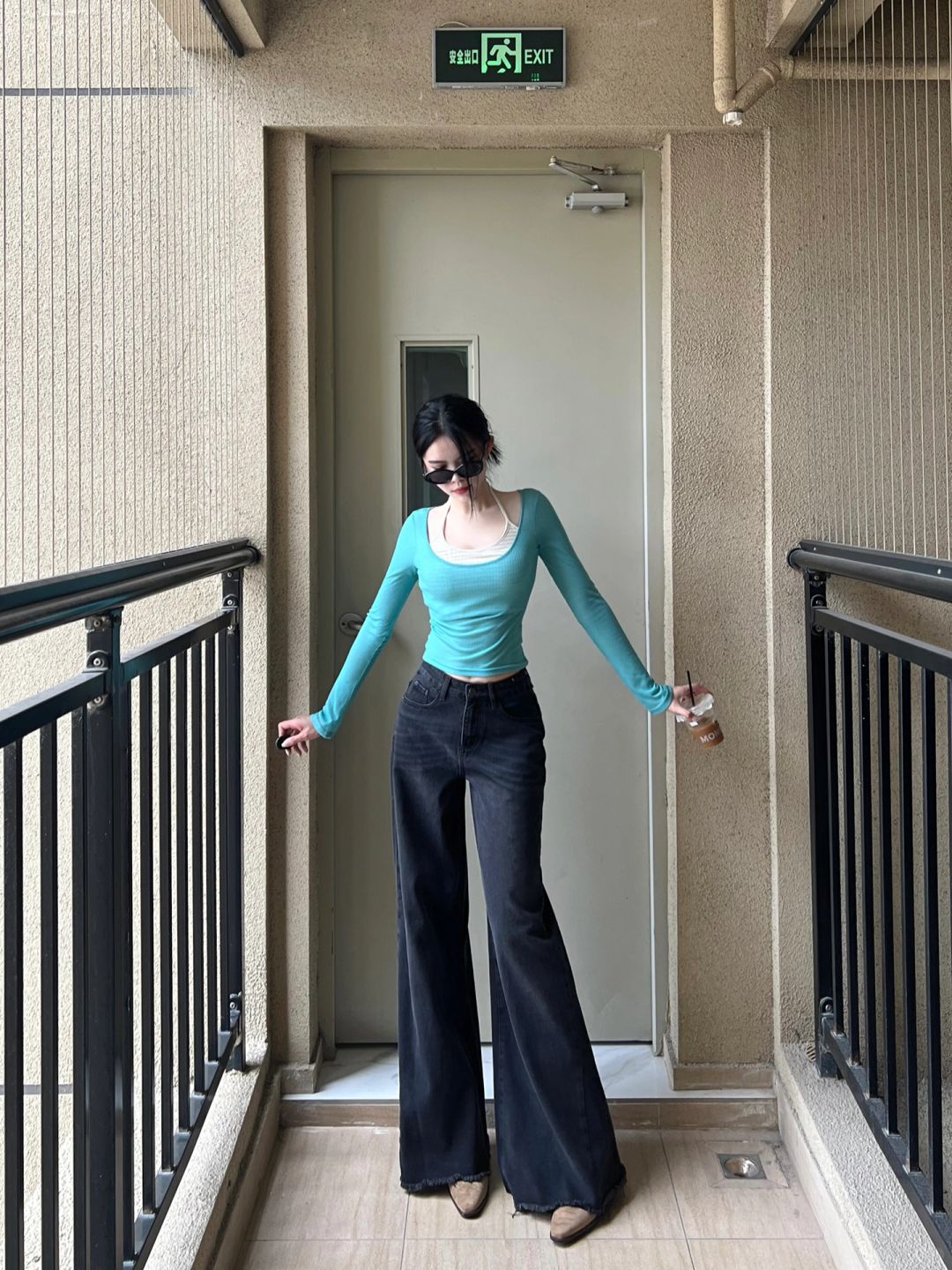 秋天彩色的黑 拖地裤 高腰牛仔裤 显瘦穿搭 显身材 显白穿搭 秋季长袖 今日穿搭 高个子 腿粗 穿这个!