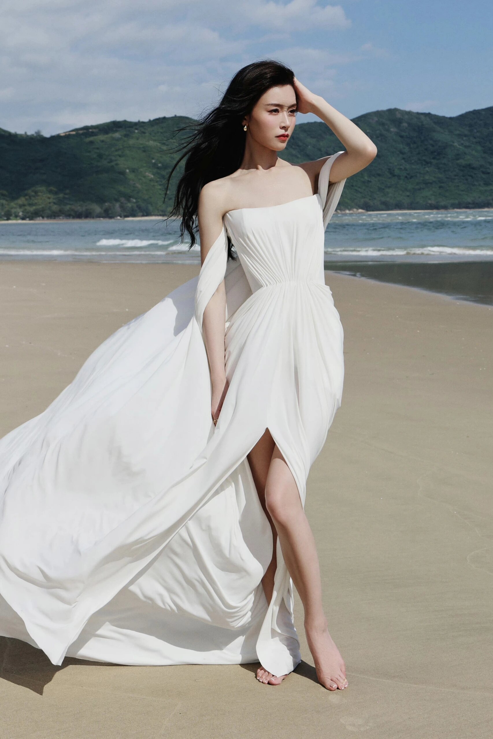 文咏珊一席抹胸开叉长裙,美腿修长,皮肤白皙,站在海边,风中美成了一幅画
