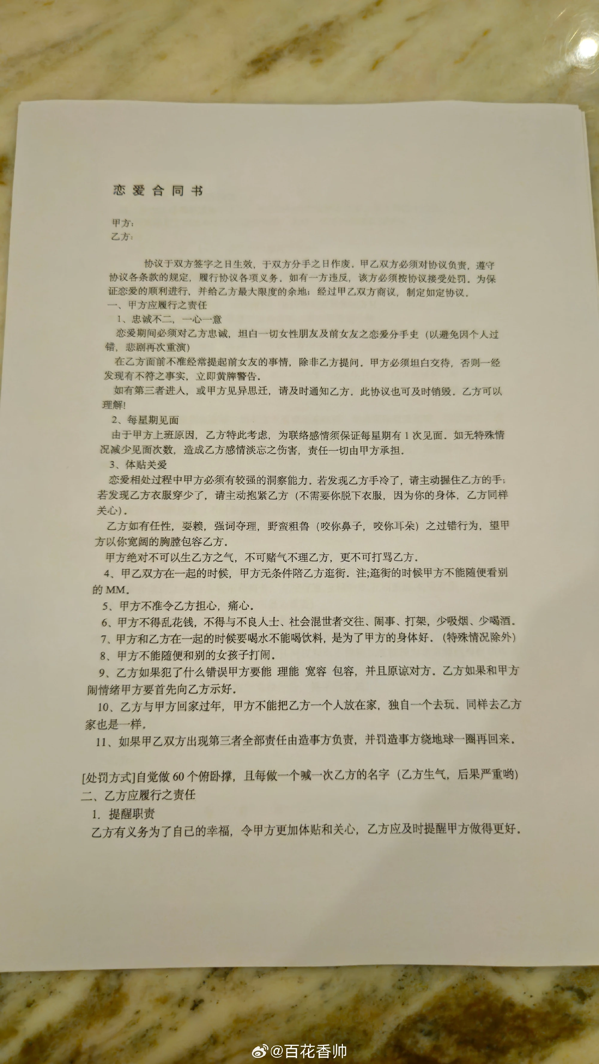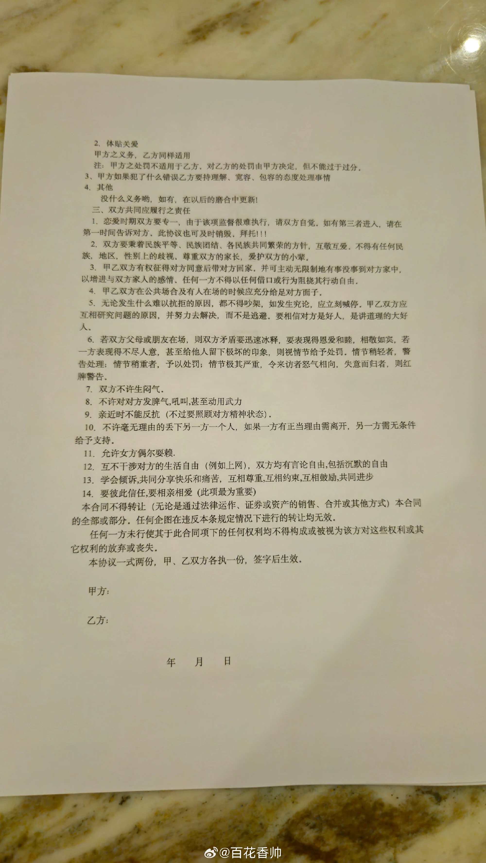 看到这样的合同我非常震惊 现在的00后 谈恋爱开始签合同了 不过我看着 这不像00后的恋爱合同 倒像是00后男生的卖身契 这样一纸合同 可能比“我爱你“ 更加让女生有安全感 不知道男生愿意签这份合同吗?