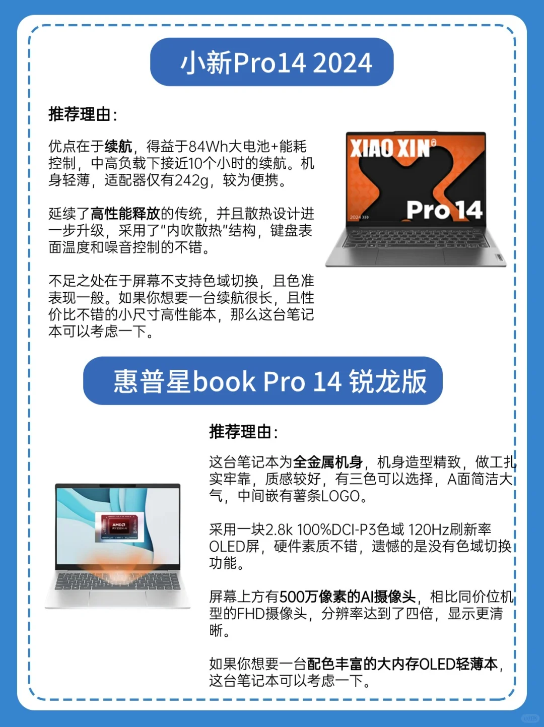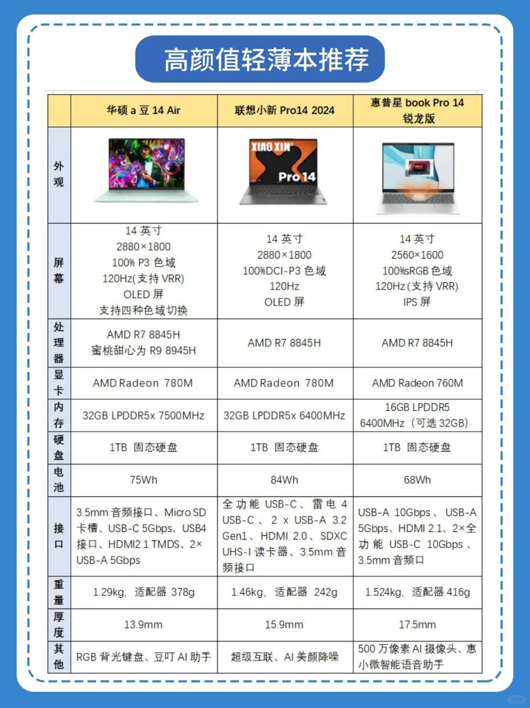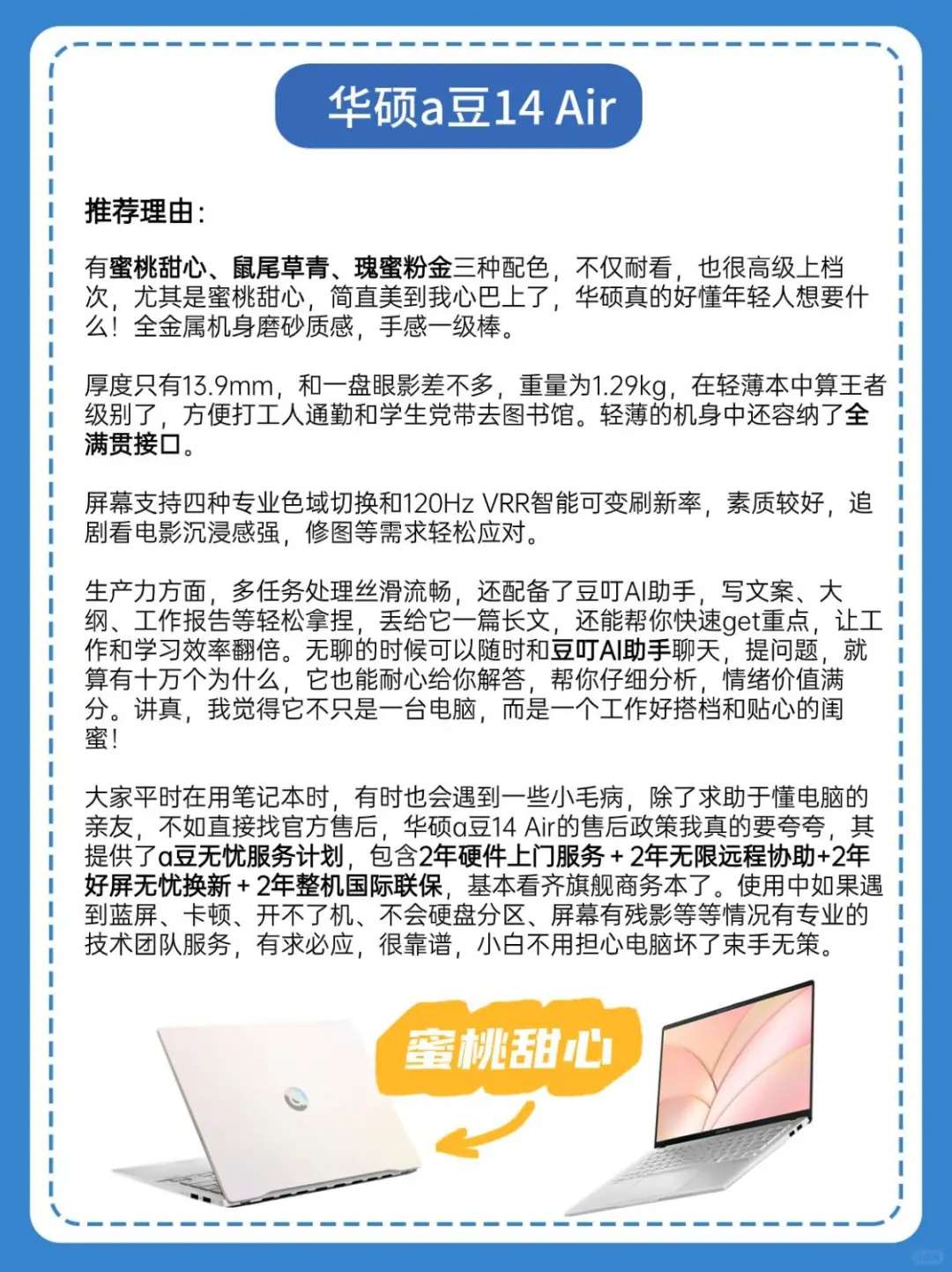 618是入手笔记本💻的好时机,很多宝子纠结选哪个型号,我今天硬控大家两分钟,安排一波选购指南和笔记本推荐,有需要的码住❗️ ✅️轻薄本选购攻略 1.哪些人适合轻薄本? 2.轻薄本怎么选? ✅️高颜值轻薄本推荐 1.华硕a豆14 Air 有蜜桃甜心、鼠尾草青、瑰蜜粉金三种配色,不仅耐看,也很高级上档次,尤其是蜜桃甜心简直美到我心巴上了,华硕真的好懂想要什么!全金属机身磨砂质感,手感一级棒。厚度只有13.9mm,和一盘眼影差不多,重量为1.29kg,在轻薄本中算王者级别了,方便打工人通勤和学生党带去图书馆。轻薄的机身中还容纳了全满贯接口。屏幕支持四种色域切换和VRR可变刷新率,素质较好,追剧看电影沉浸感强,修图等需求轻松应对。生产力方面,多任务处理丝滑流畅,还配备了豆叮AI助手,写文案、大纲、工作报告等轻松拿捏,丢给它一篇长文,还能帮你快速get重点,让工作和学习效率翻倍。无聊的时候可以随时和豆叮AI助手聊天,提问题,就算有十万个为什么,它也能耐心给你解答,帮你仔细分析,情绪价值满分。讲真,我觉得它不只是一台电脑,而是一个工作好搭档和贴心的闺蜜!大家平时在用笔记本时,有时也会遇到一些小毛病,除了求助于懂电脑的亲友,不如直接找官方售后,华硕的售后政策我真的要夸夸,年硬件上门服务+年远程协助+年好屏无忧换新+年联保,基本看齐旗舰商务本了。使用中如果遇到蓝屏、卡顿、开不了机、不会硬盘分区、屏幕有残影等情况有专业的技术团队服务,有求必应,小白不用担心电脑坏了束手无策。 2.联想小新Pro14 2024 续航不错,得益于84Wh大电池+能耗控制,中高负载下有接近10个小时的续航。机身轻薄,适配器仅有242g,较为便携。延续高性能释放的传统,采用了“内吹散热”结构,温度和噪音控制得不错。不足之处在于屏幕不支持色域切换,色准表现一般。 3.惠普星book Pro14 锐龙版全金属机身,造型精致,做工扎实牢靠,质感较好,有三色可以选择,A面简洁大气,中间嵌有大家喜欢的薯条LOGO。屏幕硬件素质不错,遗憾的是没有色域切换功能,有500万像素的AI摄像头,显示清晰,方便上网课、开会。 ✅️三款电脑对比下来,我觉得华硕a豆14 Air真的是轻薄本实力派选手,兼具了高颜值+轻薄+高生产力,趁着618活动,家人们快冲!