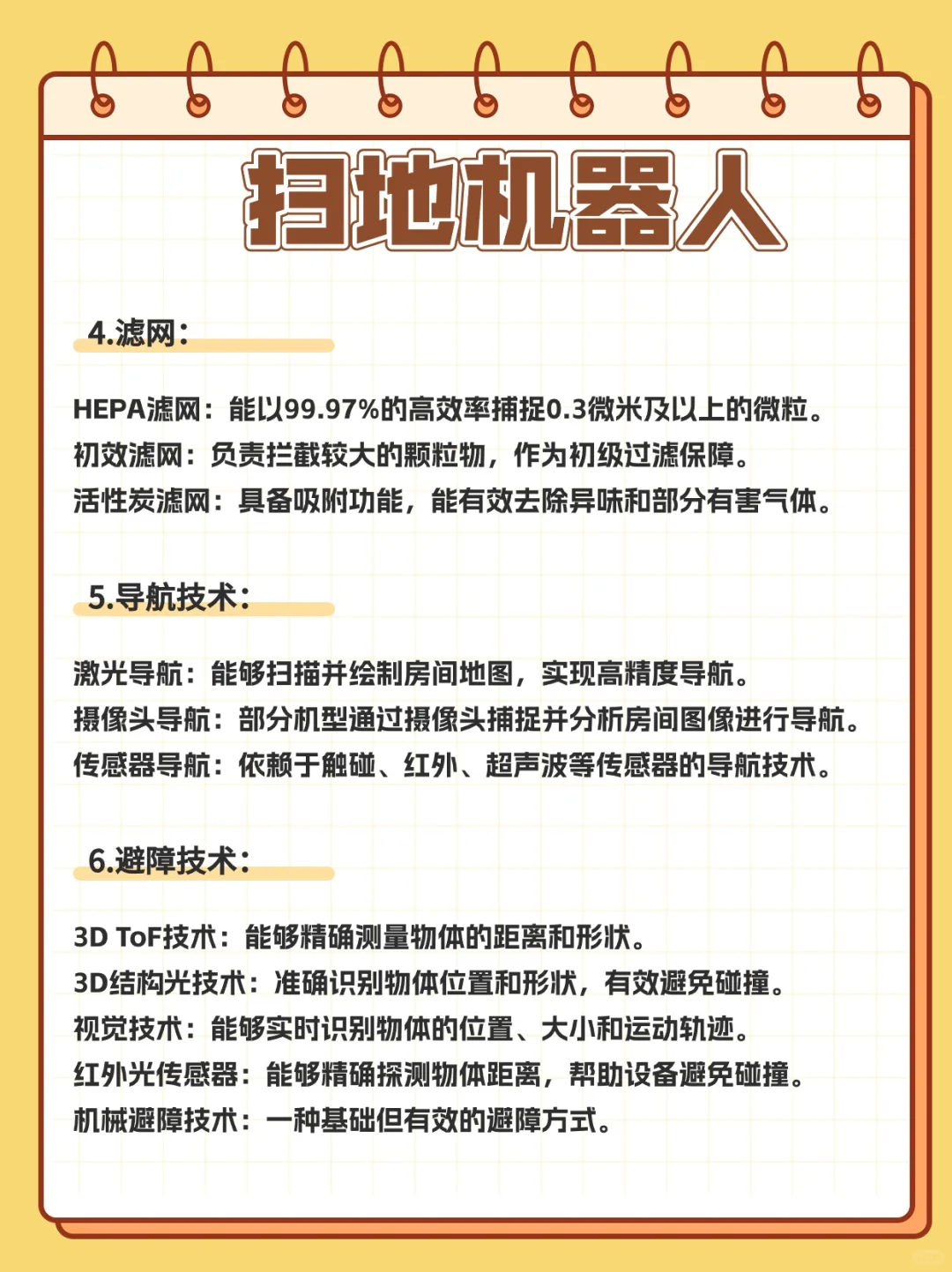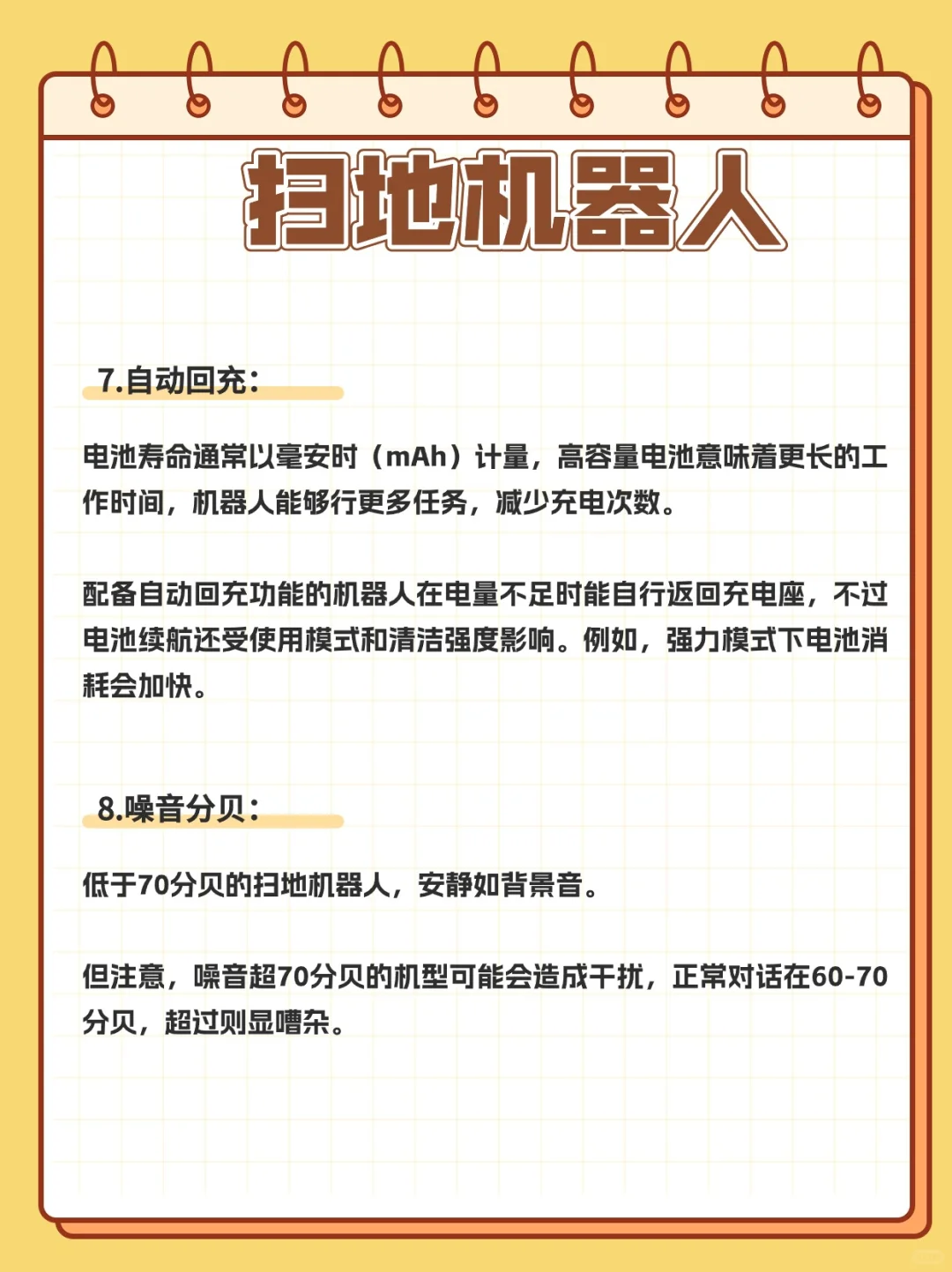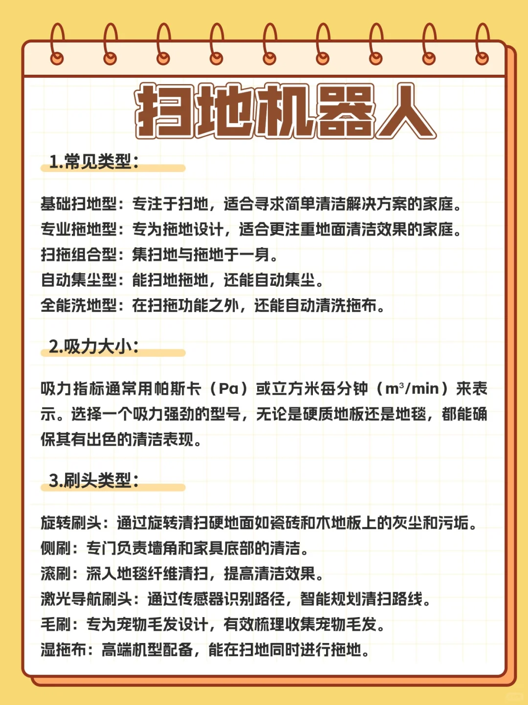 宝子们,今天给大家整理了一份购买扫地机器人避免踩坑的指南。不需要花费太多时间,只要我们在选购时关注以下8点,就能选到最适合自己的那一款产品。1、扫地机器人类型 2、刷头的种类 3、吸力越大越好 4、适合扫地机器人的滤网 5、导航技术有哪些 6、自动回充决定续航时间 7、避障技术影响清扫范围 8、噪音分贝尽量低于70分贝