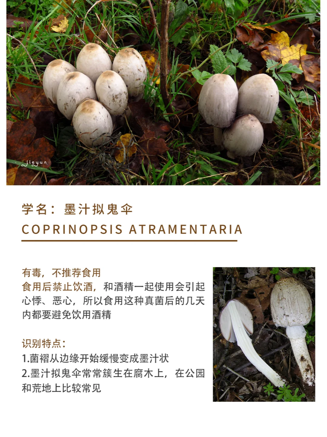 鬼伞都很独特,菌褶会逐渐化成墨汁,虽然很多鬼伞都说幼嫩时可食,但是和酒精一起食用会引起心悸、恶心,所以食用这种真菌后的几天内都要避免饮用酒精,因此不推荐食用喔~