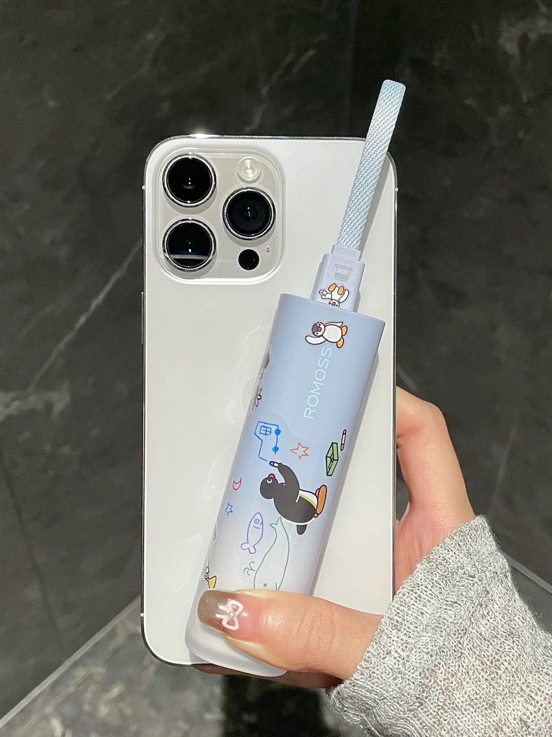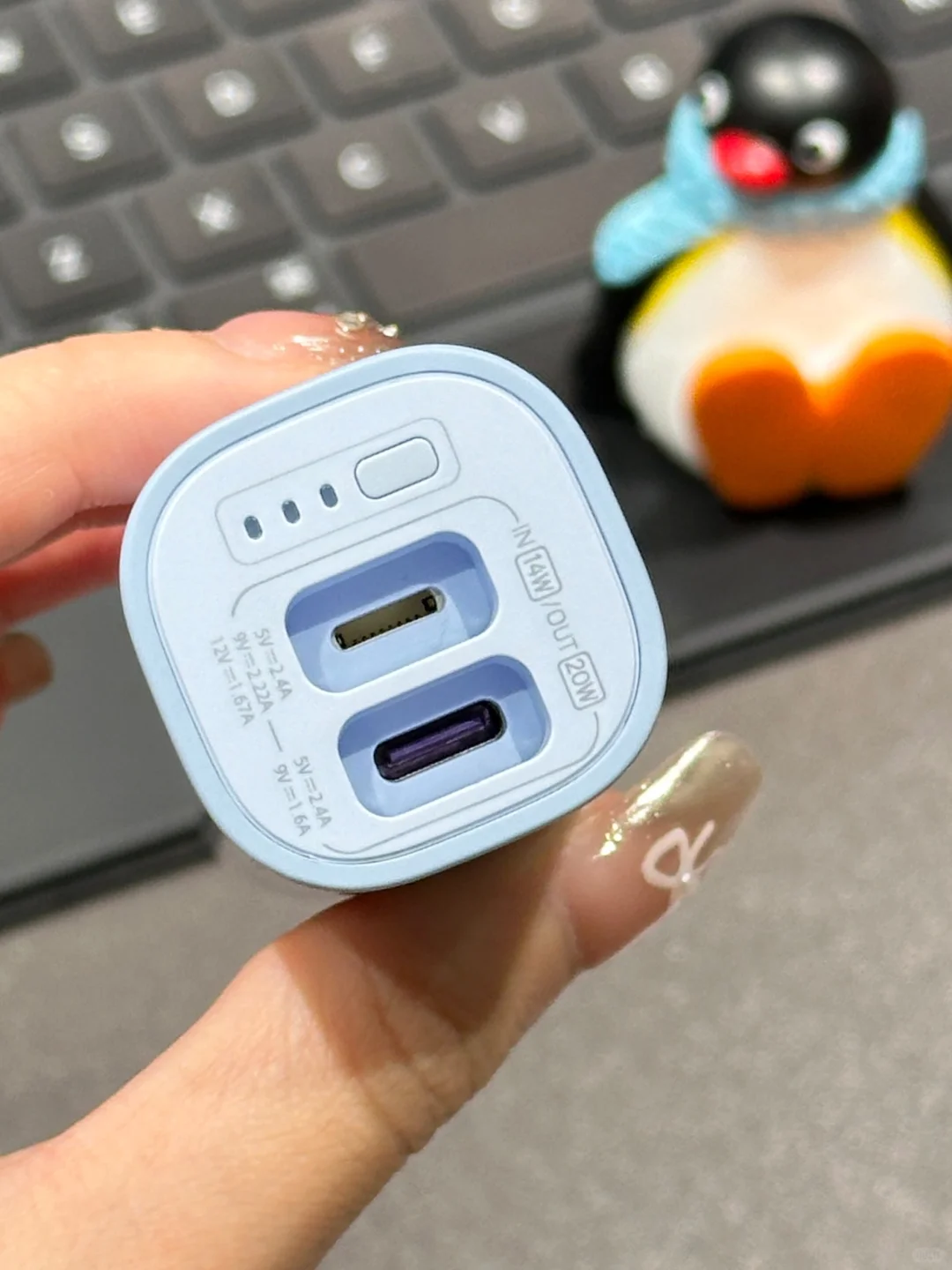 本懒癌现在终于肯带充电宝出门了… 口红大小的mini充电宝别太方便了🥹 好小巧轻便呀~揣口袋里就ok! 出门毫无负担✌🏻 双充电口⚡➕自带数据线 Type-c+ lightning头 一个充电宝能搞定多设备充电! 而且还是20w快充的🔋充电嘎嘎快 奶蓝渐变配色也太好看了! 自己diy了pingu贴纸🐧 一整个可爱住了 ˗ˋˏᰔᩚˎˊ˗ 罗马仕家的电宝我以前也用了好多年啦,专门做充电器的品牌用着真的很安心!
