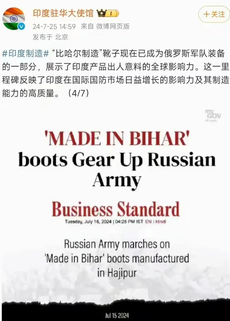 东方大国证实,为俄罗斯提供军事装备! 虽然军靴不属于武器弹药,但是也是军事装备的一部分。 这次印度为俄罗斯提供军靴,主要是印度从俄罗斯买石油,用的是卢比。俄罗斯攒了一堆卢比,没地方花。俄罗斯想要的东西,印度不卖,印度想卖的东西,俄罗斯不想要,所以只能买点军靴。 俄乌战争,印度也是一个大赢家,从俄罗斯倒卖石油,赚的盆满钵满。 印度能希望俄乌停战吗?