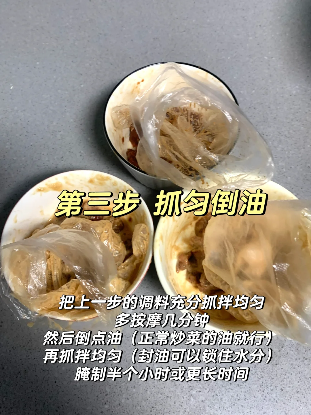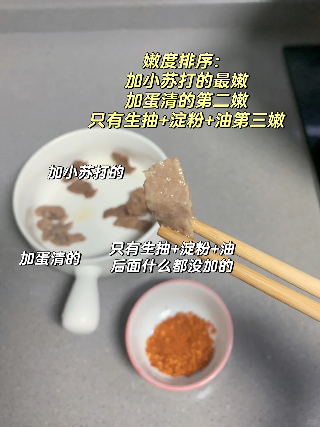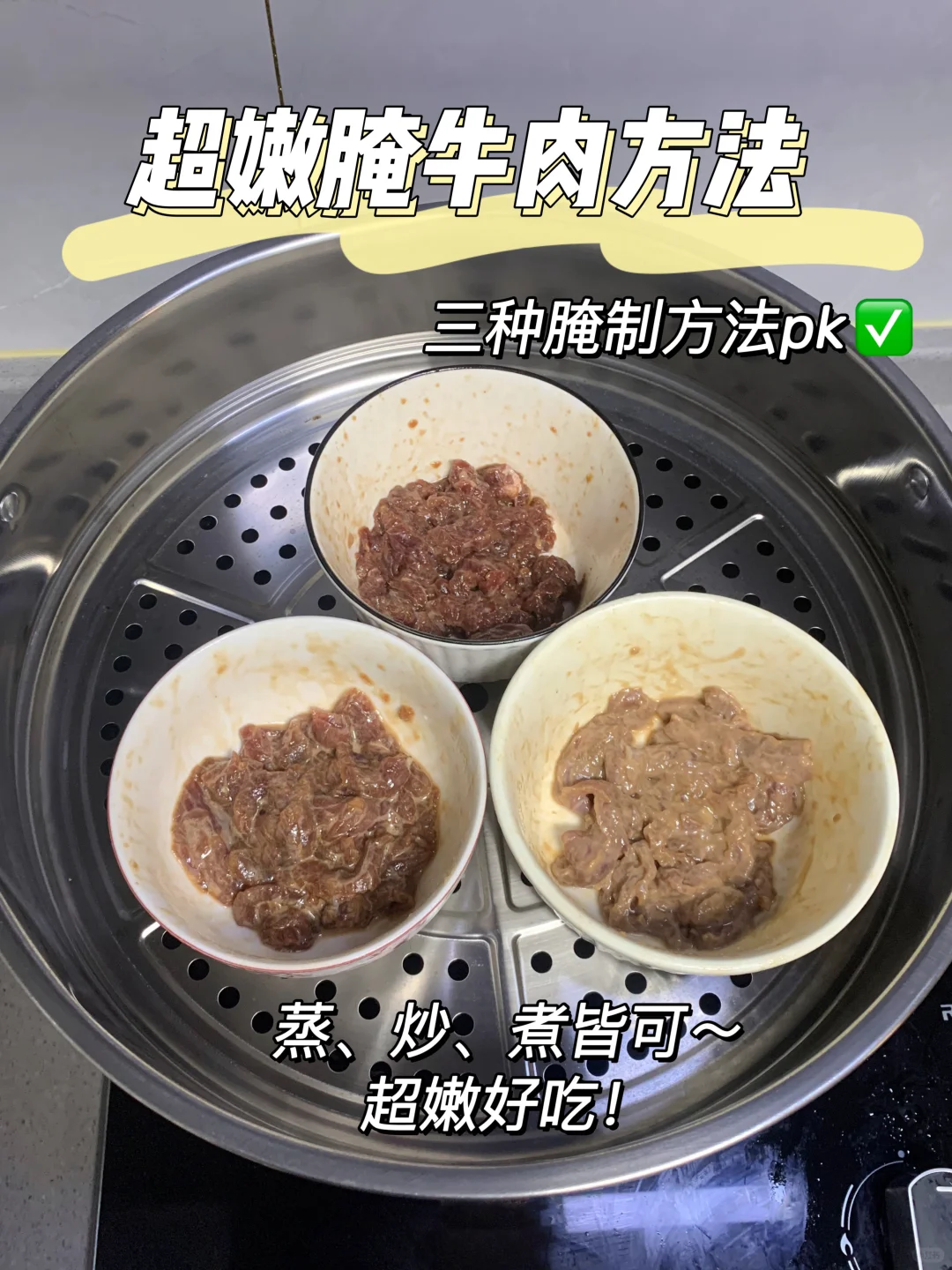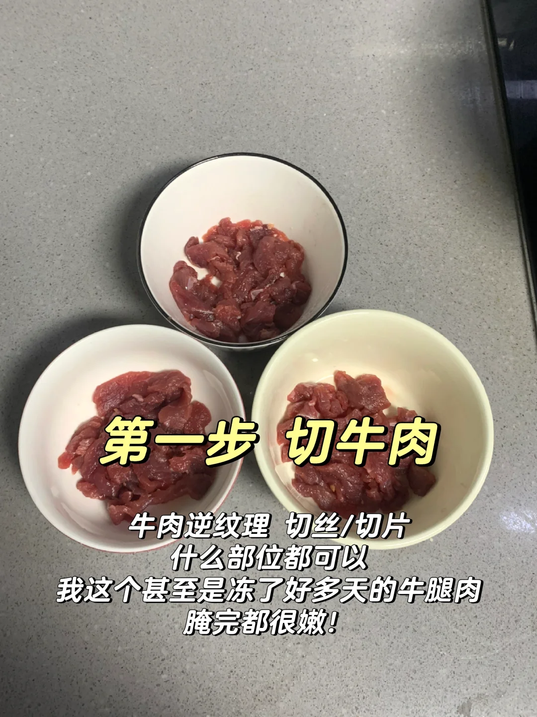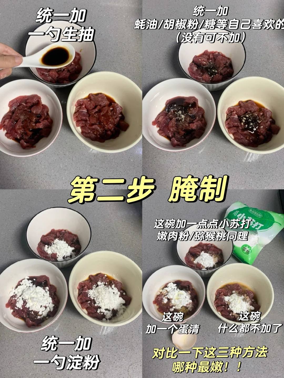 1️⃣牛肉逆纹理切2️⃣加生抽+蚝油/胡椒粉/辣椒粉等等你喜欢的调料腌制3️⃣加淀粉抓匀4️⃣想要嫩的可以再加蛋清/或者小苏打/嫩肉粉/猕猴桃等5️⃣最后加炒菜用的食用油抓匀腌制30分钟或者更长时间(封油可以锁住水分)