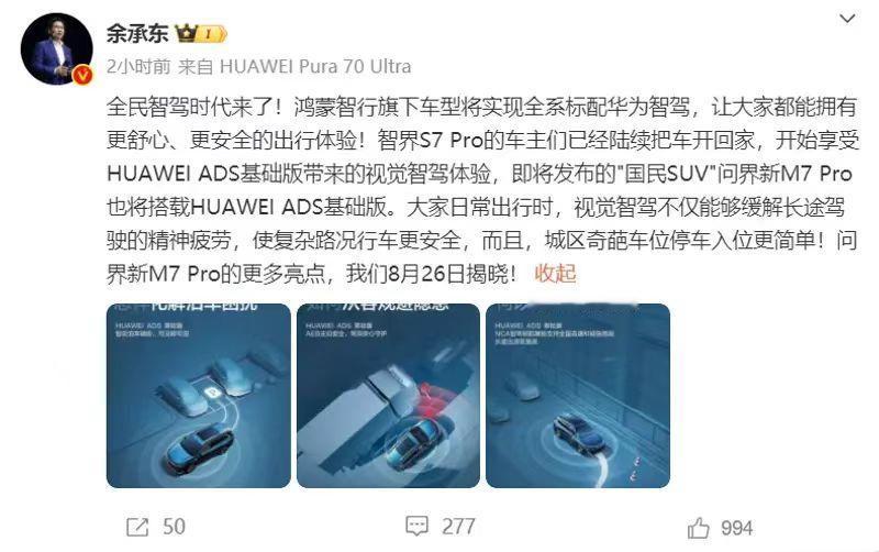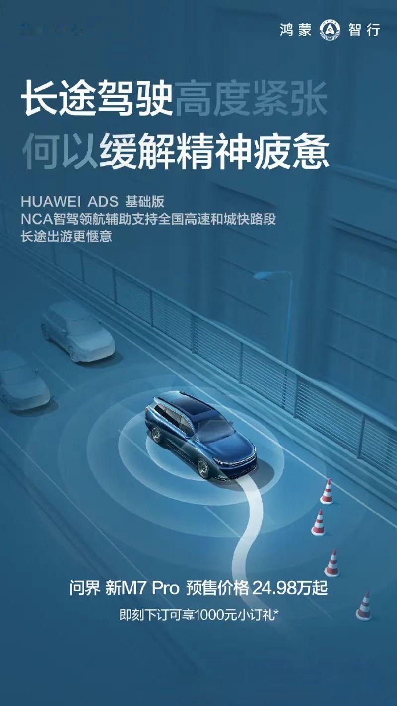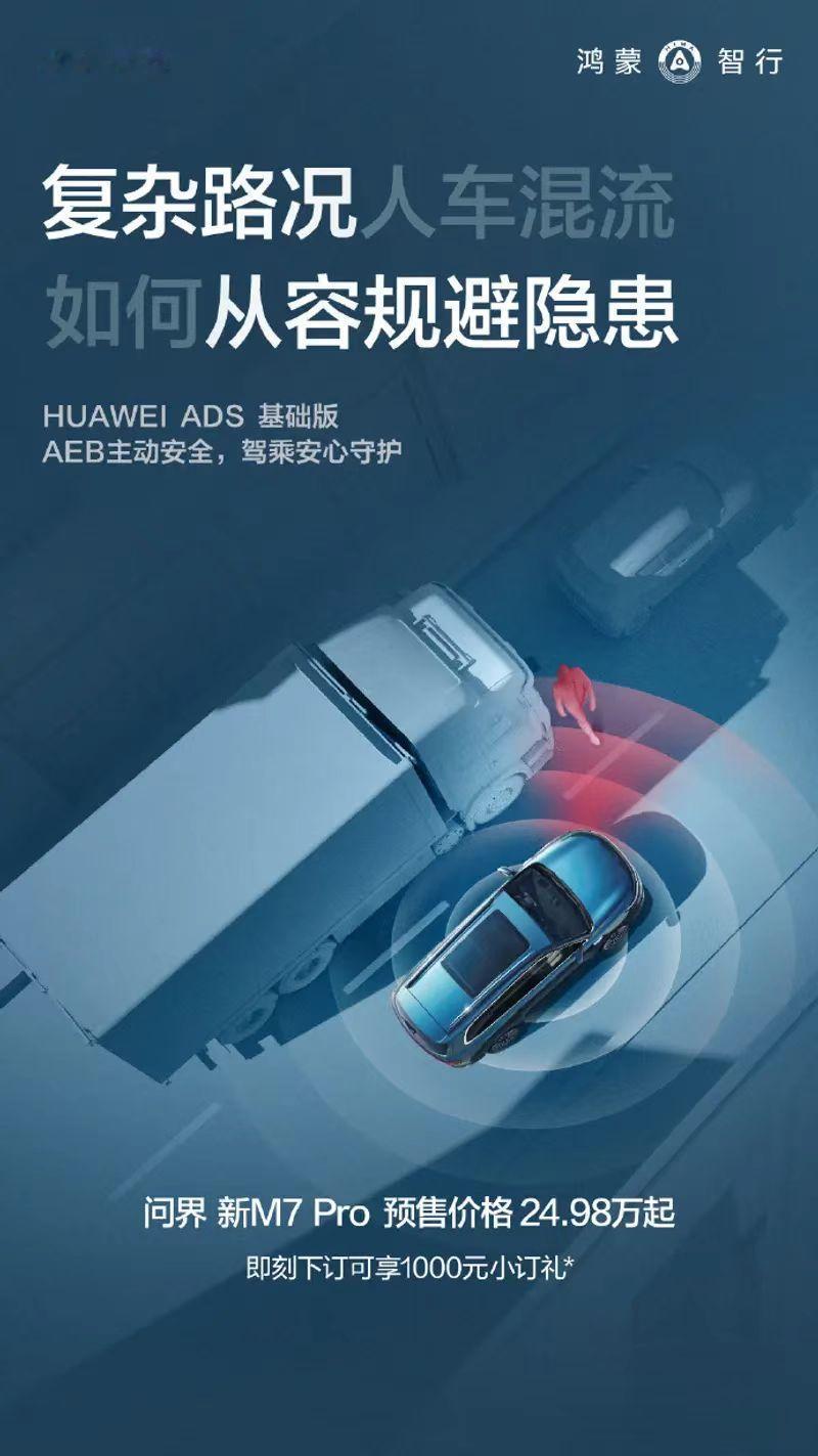 【鸿蒙智行预热问界新M7 Pro 将搭载HUAWEI ADS基础版】鸿蒙智行官方发布问界新M7 Pro预热,新车搭载HUAWEI ADS基础版,NCA智驾领航辅助,智能预判路况;AEB主动安全;以及可见即可泊的智能泊车辅助。 据此前消息,问界新M7 Pro预售价格24.98万元起,8月26日前下订即享1000元订金抵2000元购车尾款。新车将于8月26日正式上市,并亮相随后的2024成都车展。 华为常务董事、终端BG董事长、智能汽车解决方案BU董事长余承东发布微博称:全民智驾时代来了!即将发布的"国民SUV"问界新M7 Pro将搭载HUAWEI ADS基础版。大家日常出行时,视觉智驾不仅能够缓解长途驾驶的精神疲劳,使复杂路况行车更安全,而且,城区奇葩车位停车入位更简单!问界新M7 Pro的更多亮点,我们8月26日揭晓!【来自懂车帝车友圈】