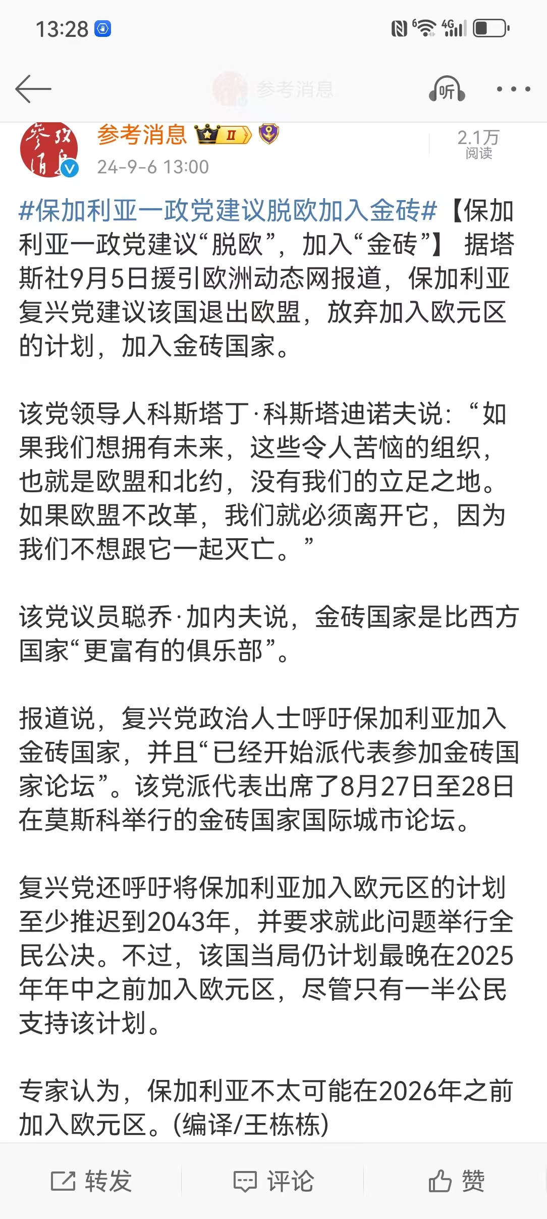 【保加利亚一政党建议“脱欧”,加入“金砖”】 俄媒发布这样的消息真是自取其辱,金砖国家组织与欧盟比“含金量”,还需要奋斗很多年,而且其中还不能有“搅屎棍”。新闻称“该党派代表出席了8月27日至28日在莫斯科举行的金砖国家国际城市论坛”,也暴露出该论坛的影响力不过如此。因为保加利亚复兴党在该国属于没有什么影响力的小党,在该国国民议会的240个议席中,该党仅占27席。