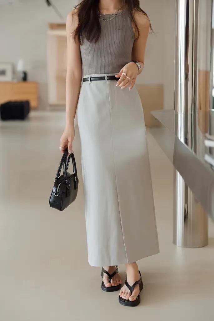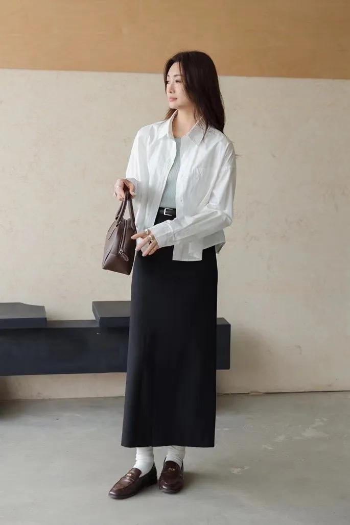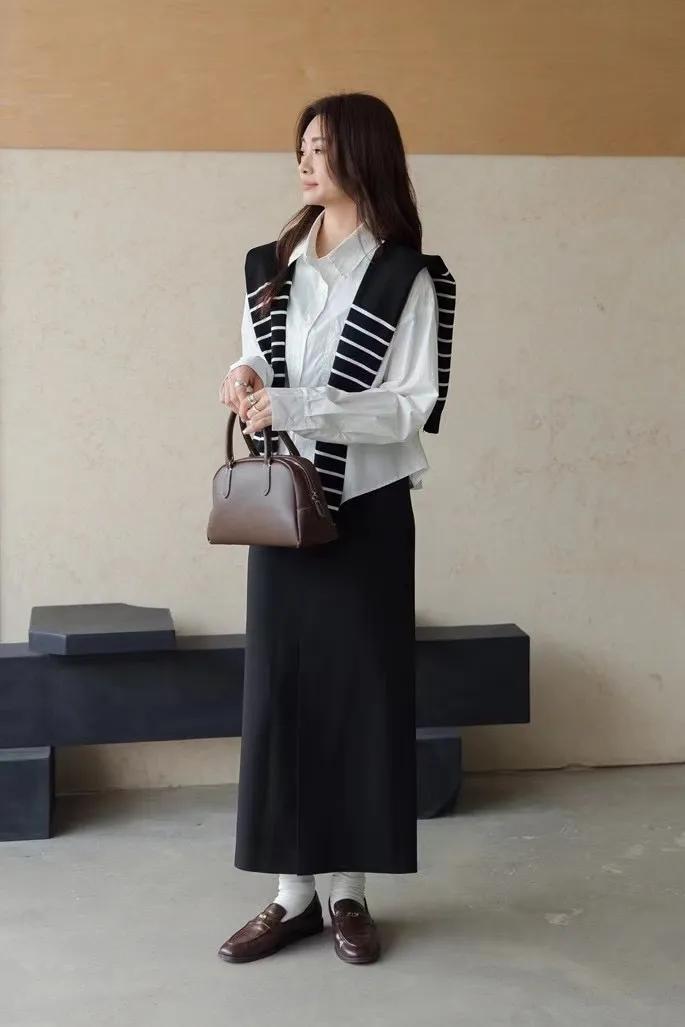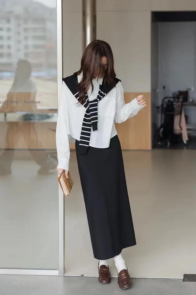 #同一款西装半裙穿搭# 这种偏直筒的带有设计感的西装半裙几乎不挑身材,简简单单搭配个背心就很好看,绑上腰带,轻松营造身材的黄金比例,更显高显瘦。 与一件衬衣与披肩的穿搭也很惊艳,轻松打造时尚感。 叠穿也很具备实用度,只是内搭衣服适当别进衣服里,再穿上短款外套,轻松拉高身高又别具一番风味。 #秋日裙装指南# #穿搭必修课# #西装裙#