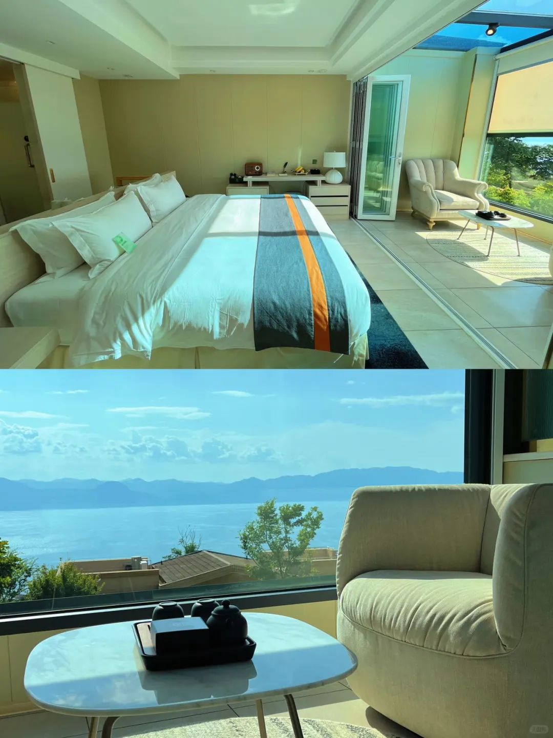 🍃酒店公区很大,且公区和住宿区是分开的,可以说动静互不打扰,这点我特别喜欢,酒店体量小,但设施配套都很完善,我们这一次入住的是3楼的湖景大床房,坐在房间就可以欣赏抚仙湖的美景~