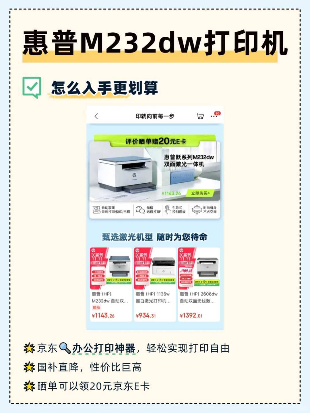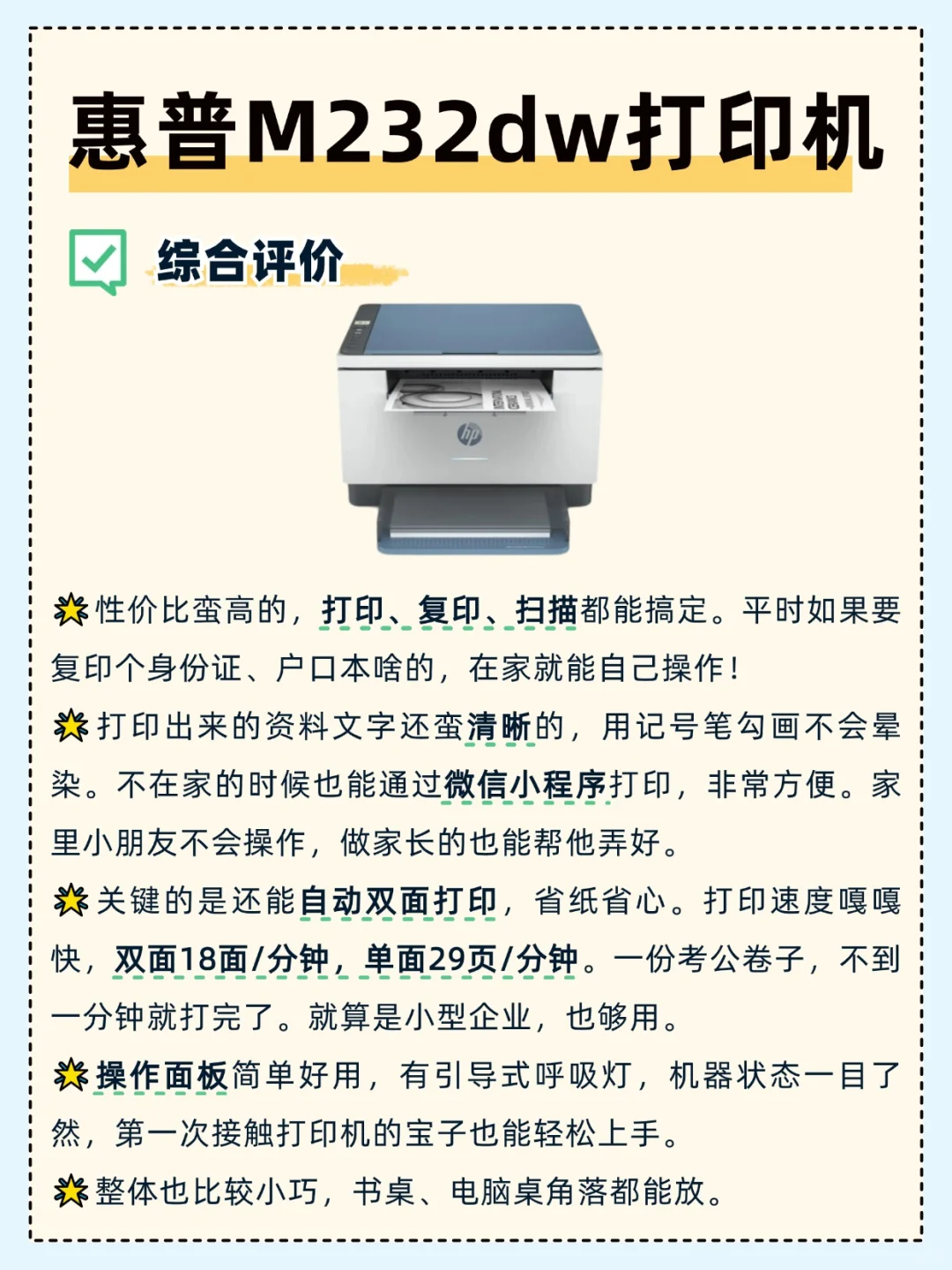 在对比了市面上不少打印机后,终于找到了心仪的打印机——惠普跃系列M232dw激光打印机。