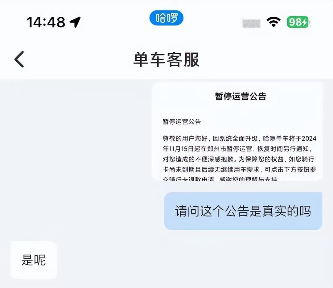 郑州美团15日10:00暂停运营,恢复时间另行通知! 今天我出门都没有找到共享单