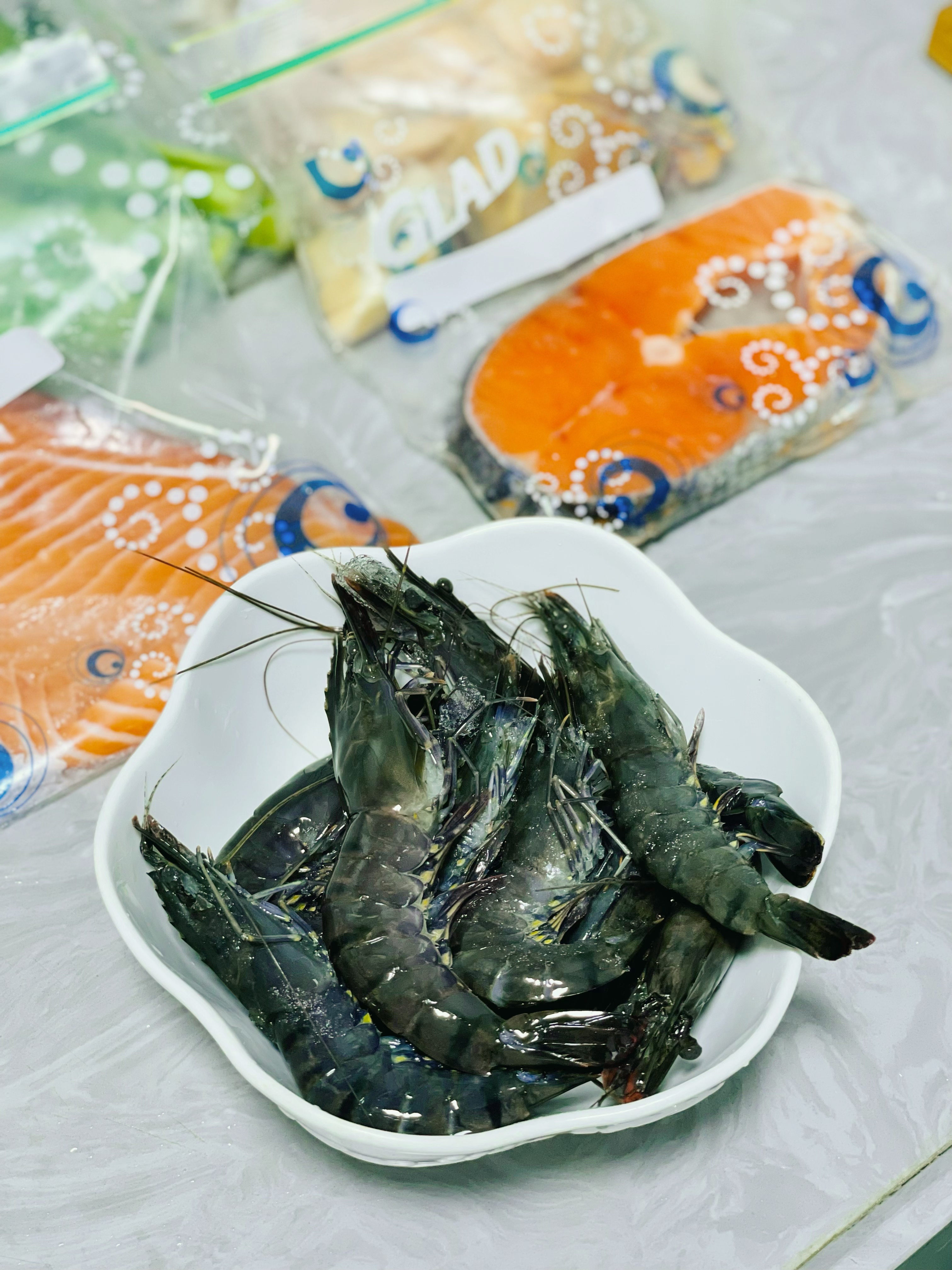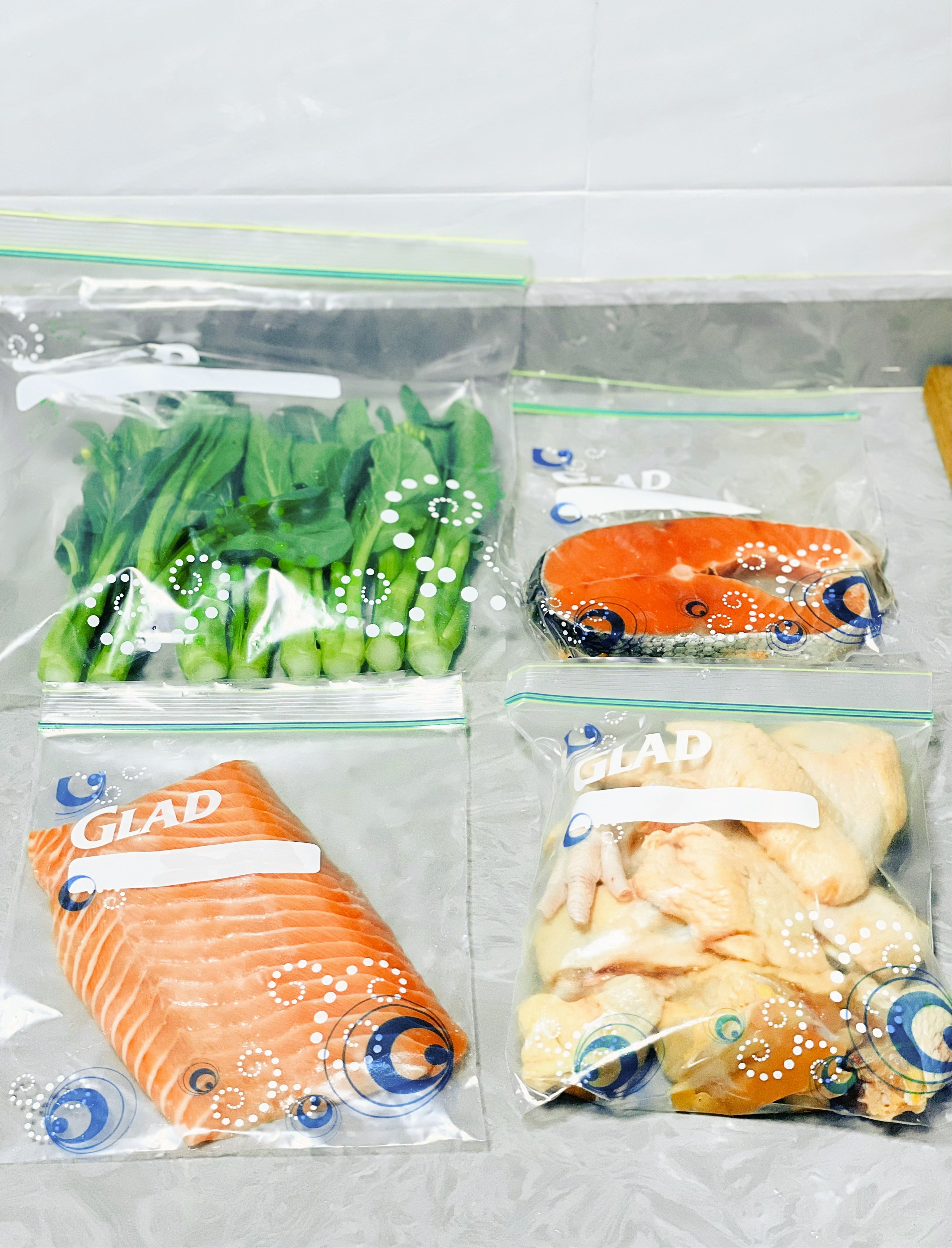 这周就准备了三文鱼腩,三文鱼排,走地鸡,大虾🦐,青菜等等