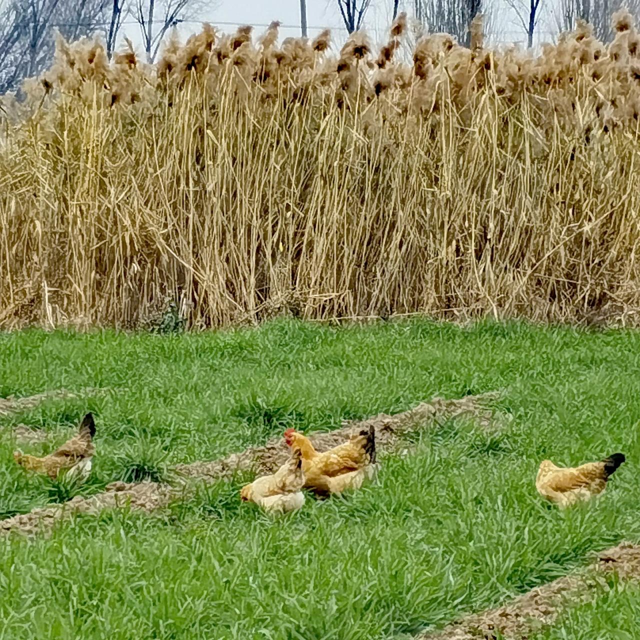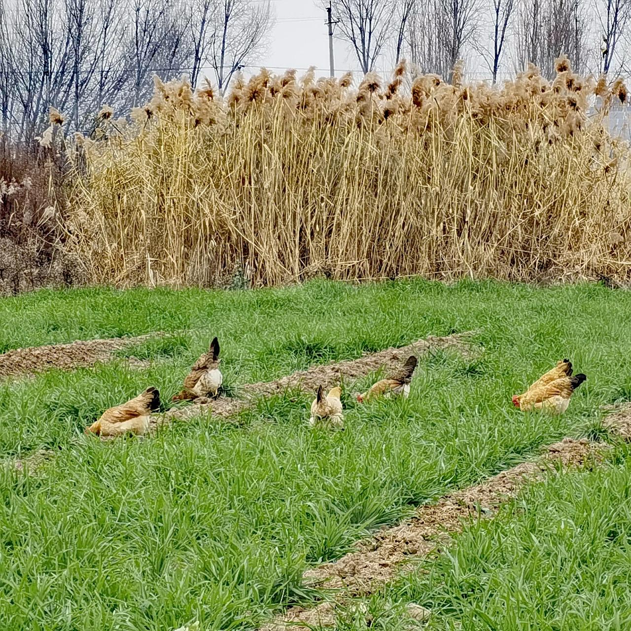 图片美吗?二幅图很美呀,有芦苇有鸡有绿色的小麦地。这是我们真正散养土鸡和种植绿色