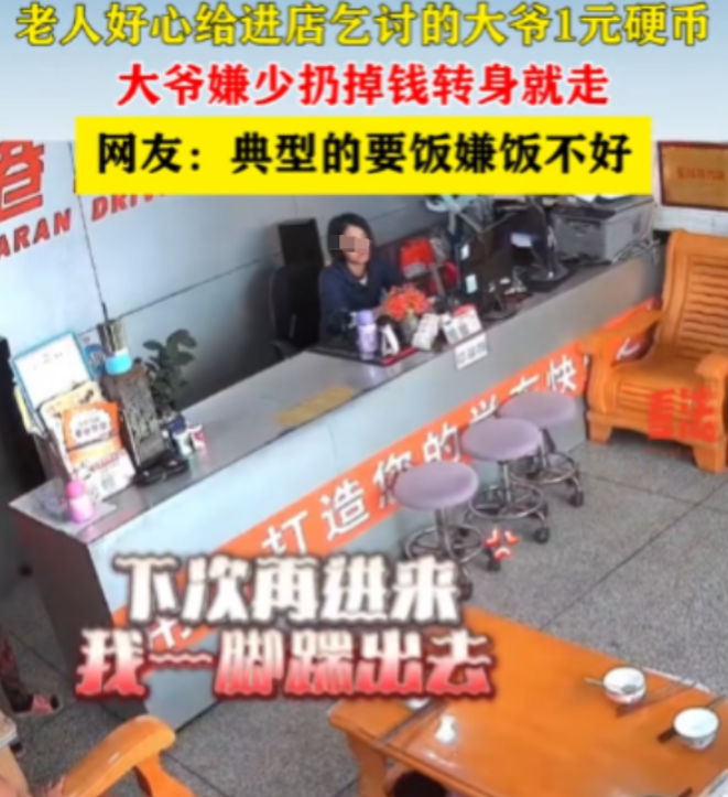 广东,一家饭店内,一位年迈的大爷背着破旧的挎包缓缓步入。店主林浩正坐在前台,并未过多留意。然而,林浩的母亲,一位心地善良的老人,见大爷衣衫褴褛,便心生怜悯。她从口袋中摸索出一枚一元硬币,想要给予大爷一些帮助。没想到,大爷见到这区区一元钱,竟愤怒地将其摔在地上,随后头也不回地离开了饭店。林浩见状,怒不可遏,直言若再遇此人,定要将其赶出门去。