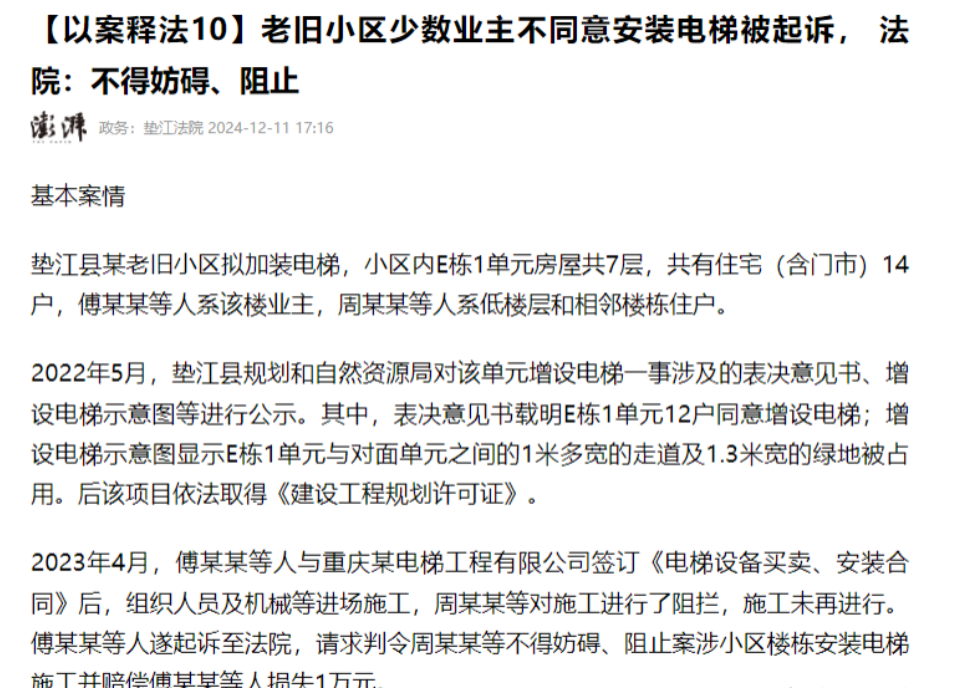重庆,男子所住楼栋计划加装电梯,有12户业主表示赞成,可是低层2户业主不同意,认为加装电梯与他们无益,而相邻楼栋的住户也认为加装电梯会占用公共走道和绿地,便多次强行阻挠施工,双方闹得不可开交。男子等高层业主怒将阻挠者们告上法院,法院给出了明确回复。