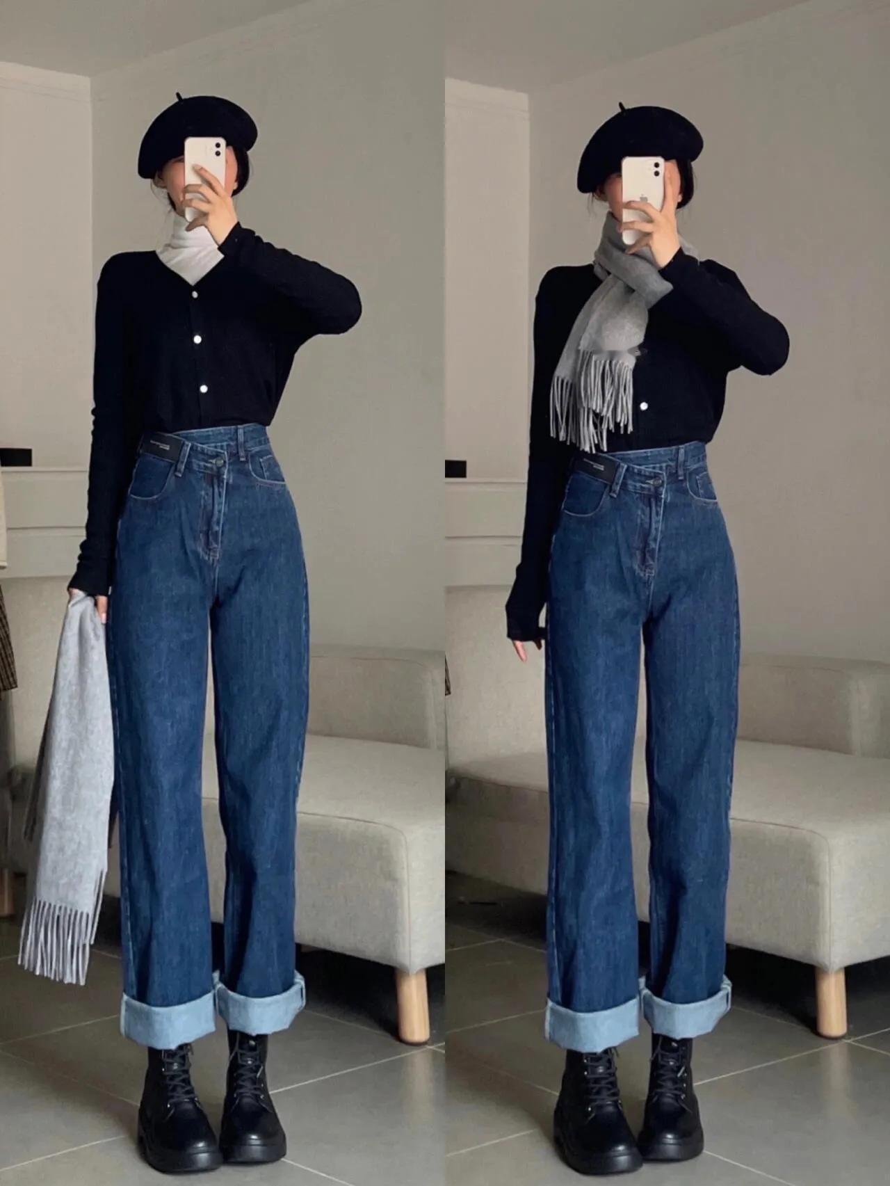 黑色牛仔裤看着朴素,穿着落落大方! 可以说是比较百搭的裤子啦~ 直筒的裤子就更加