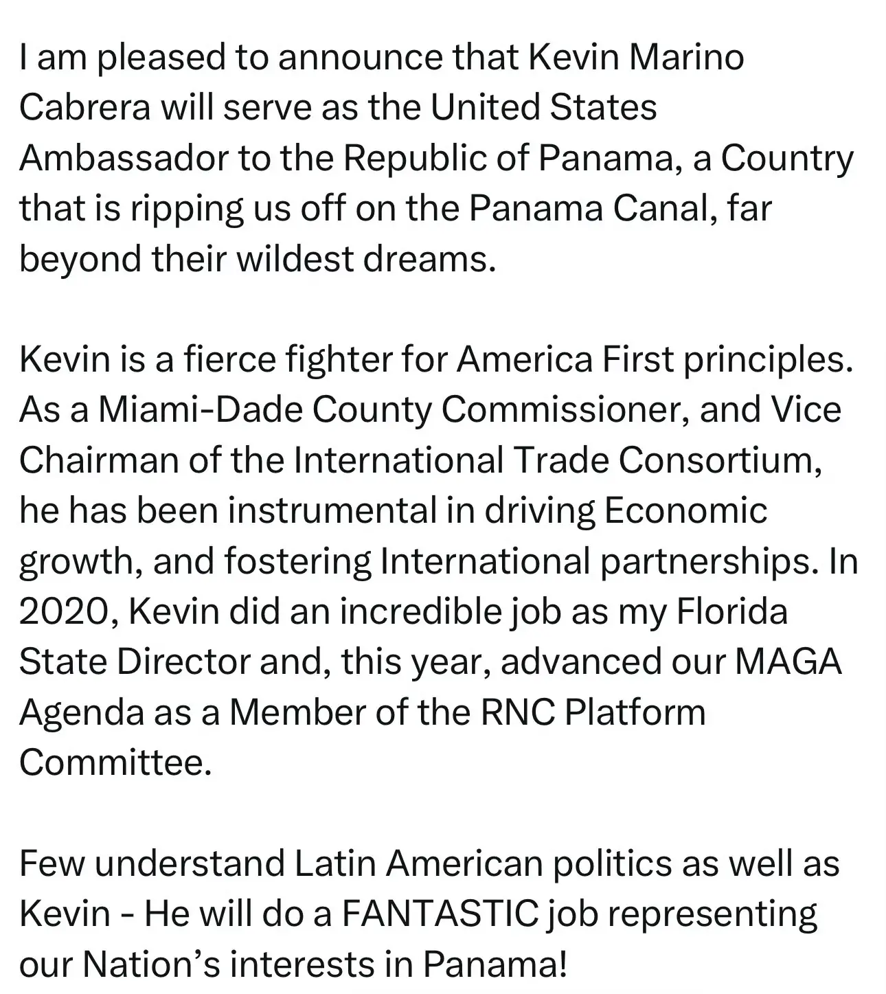 特朗普任命凯文马理诺担任驻巴拿马大使,任务就是阻止巴拿马利用运河对于美国的剥削。